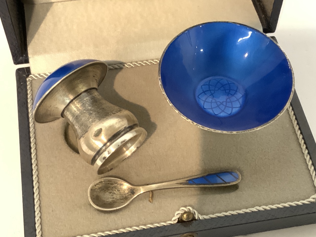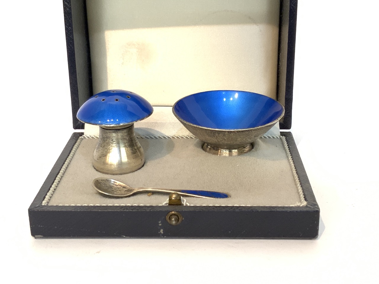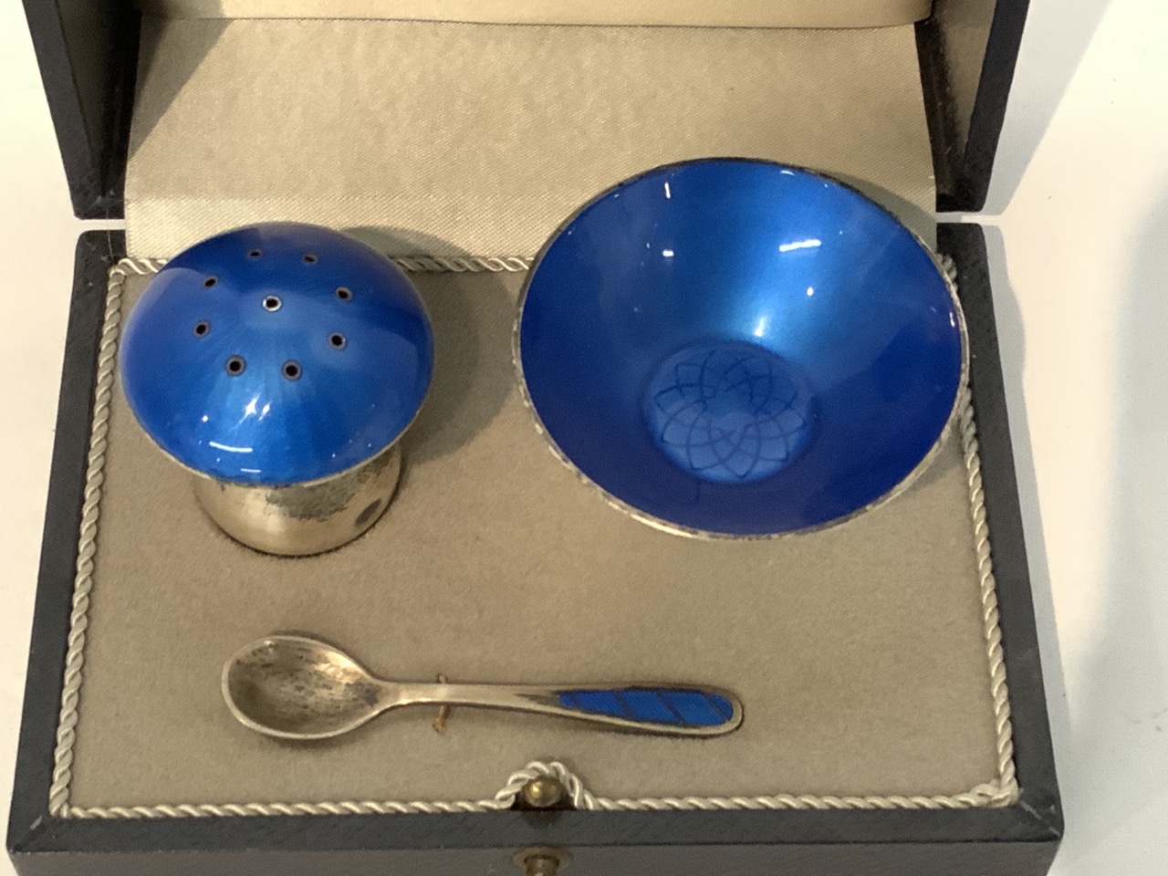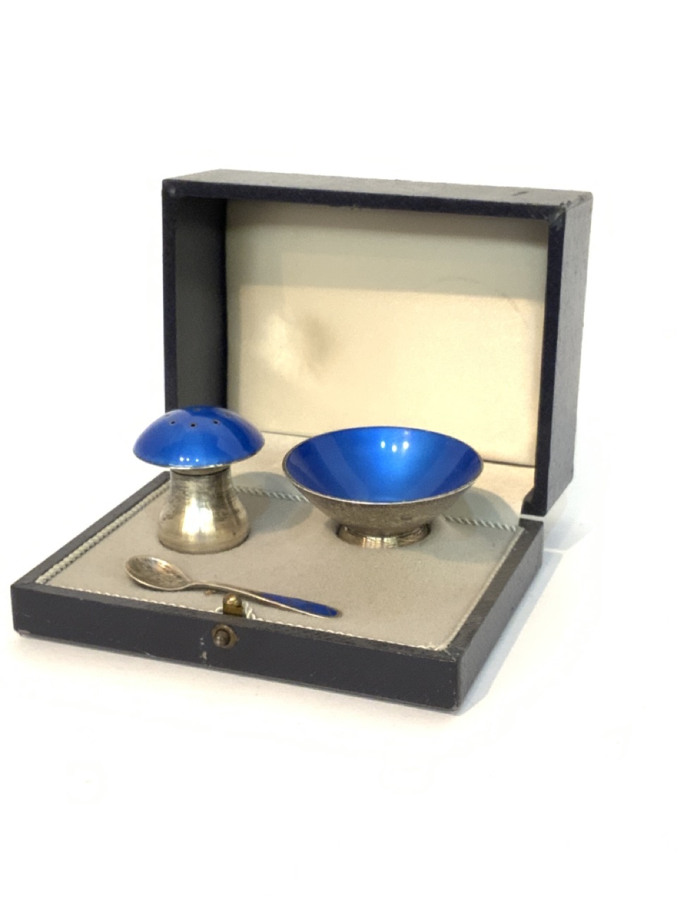 Danish enamel sterling silver salt set. Small dimple dent to mushroom form shaker.