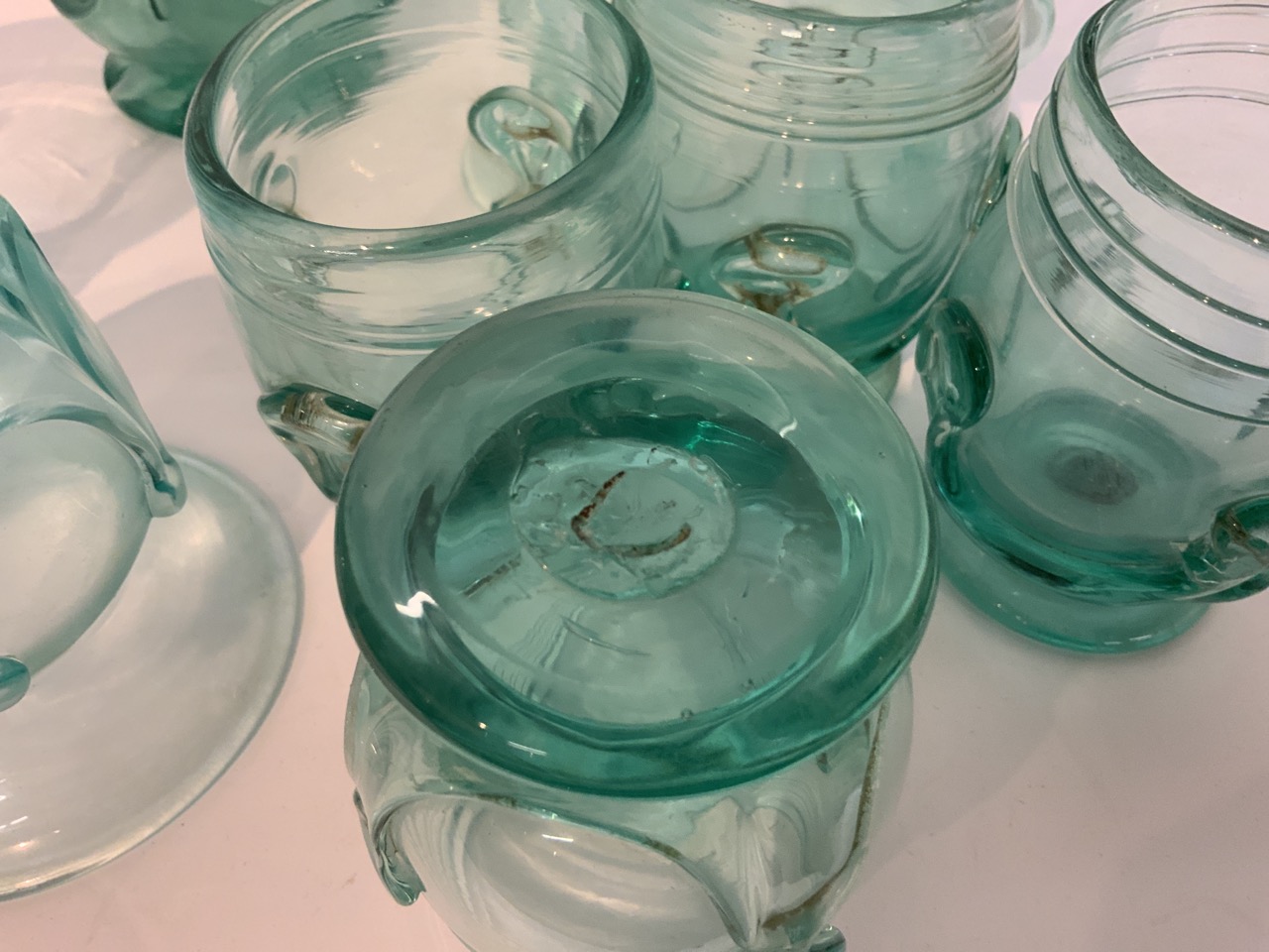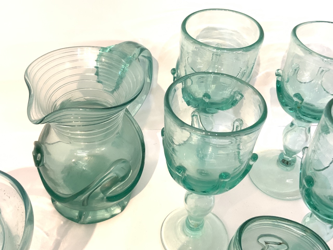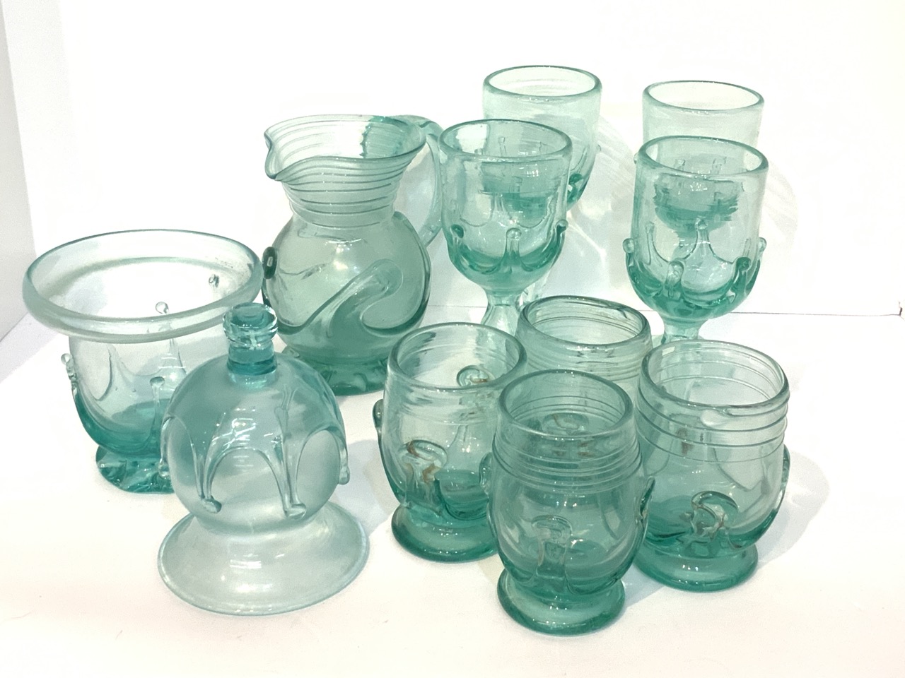 Collection of sea green hand blown glasses. Photographs are deceiving, the color is more of a bluish green. Images present the glasses on the paler side.
