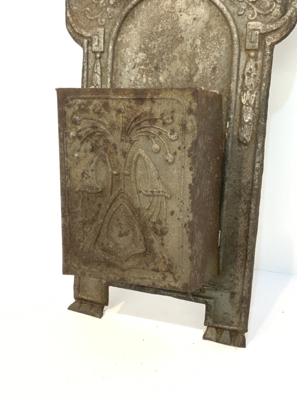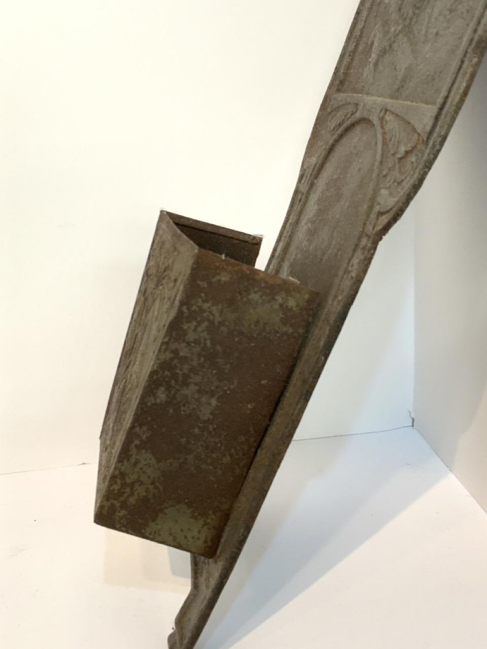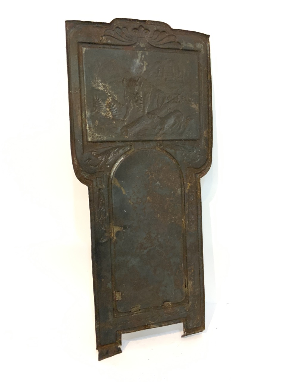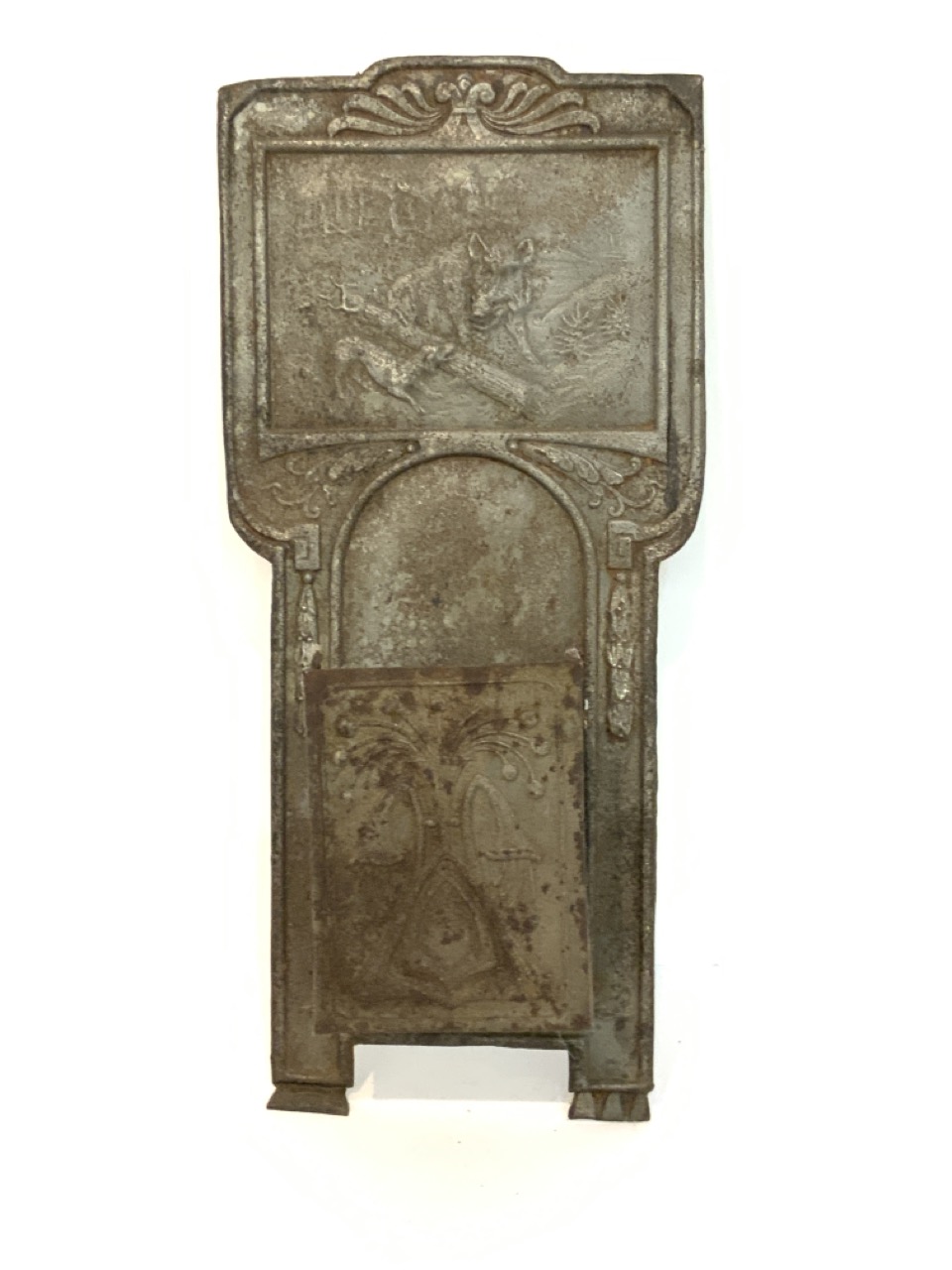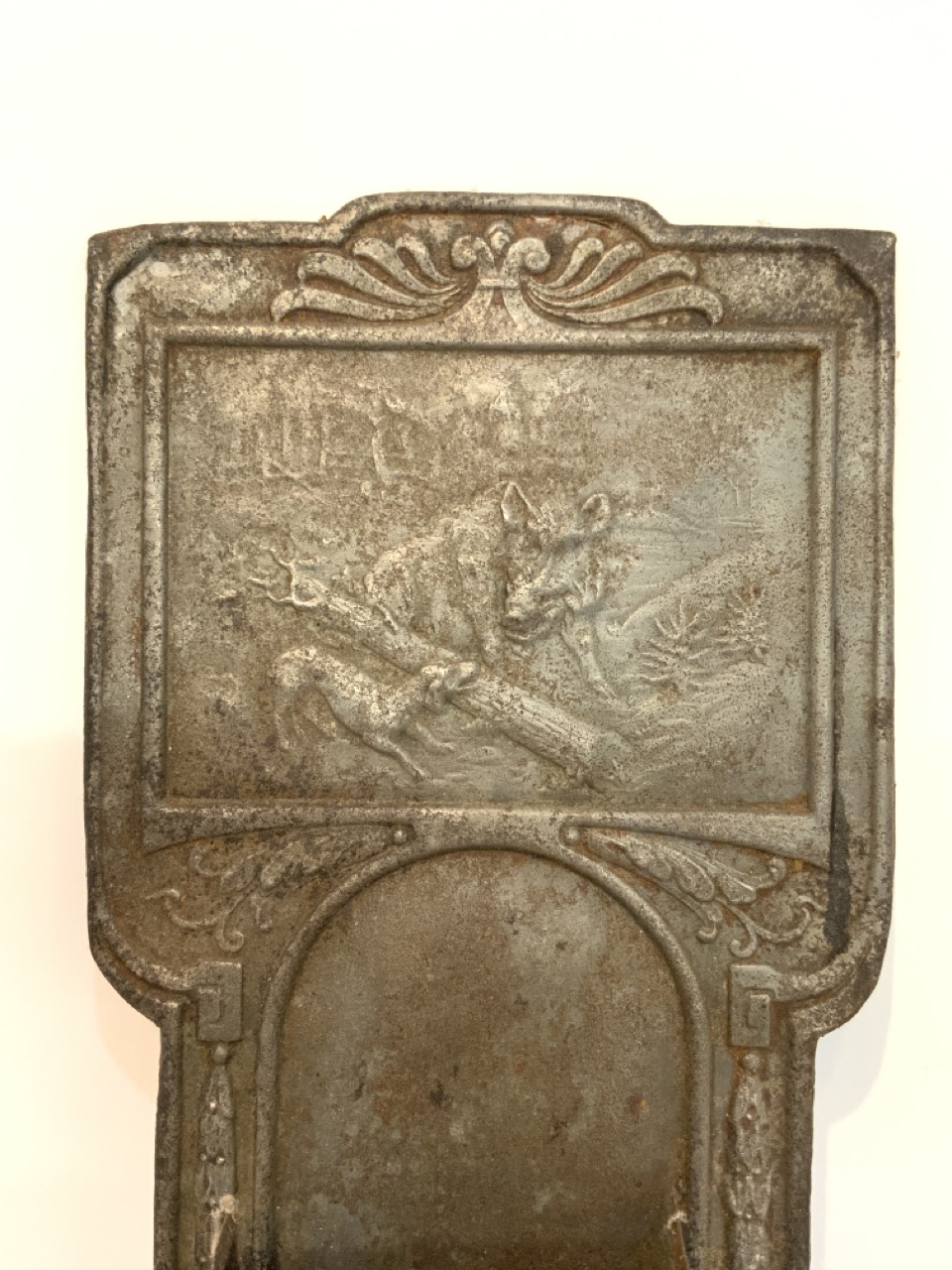 An Amercican fire place match holder. Tin metal with embossed wild boar with dog in wilderness. 19th century. Caddy needs reinforcement.