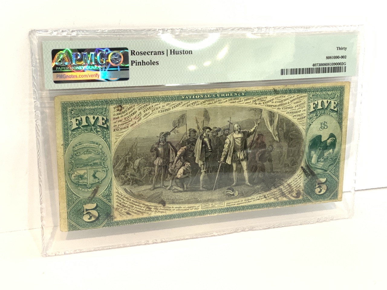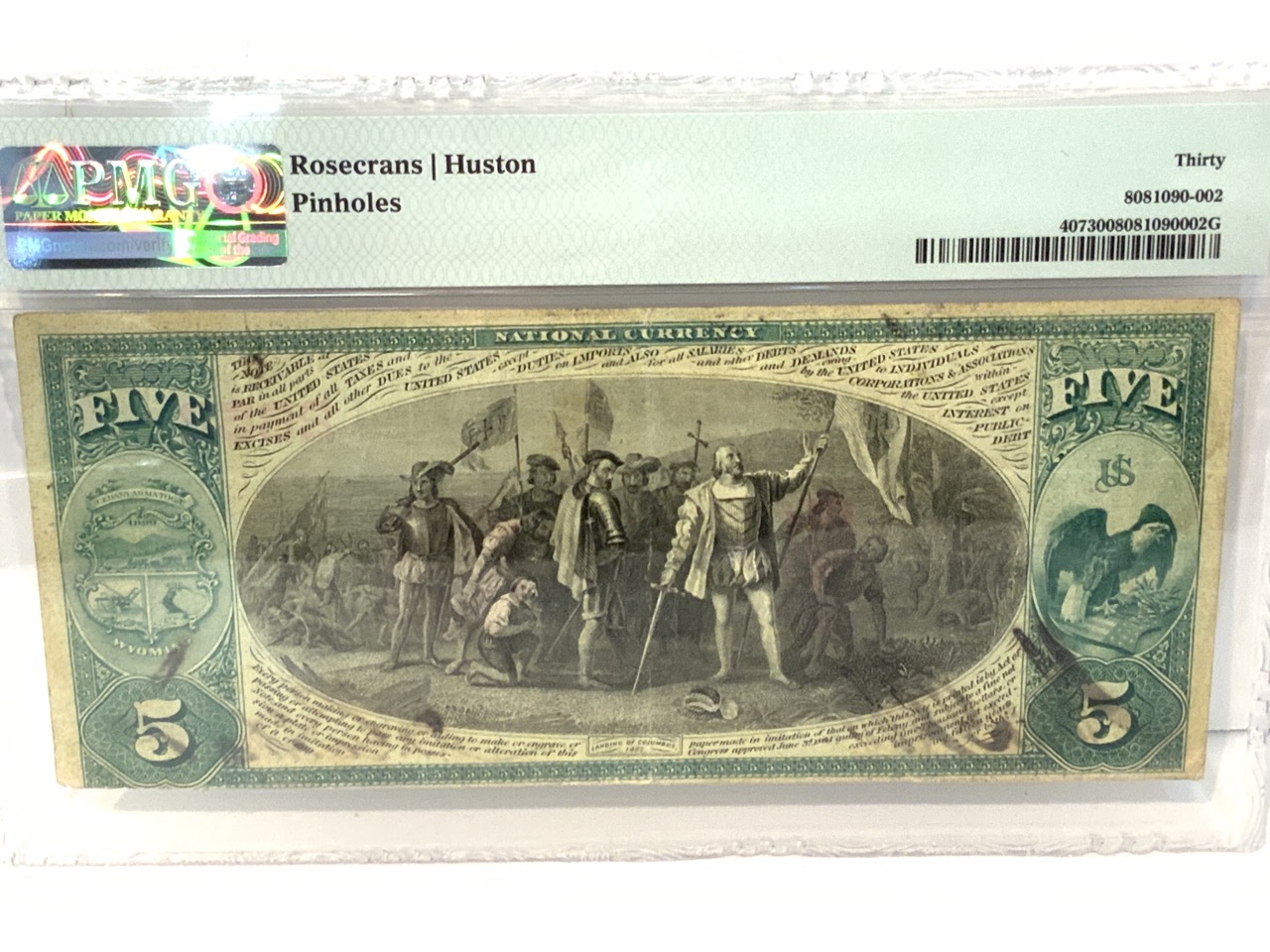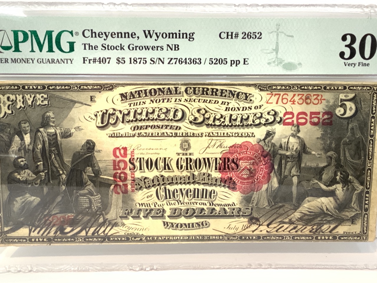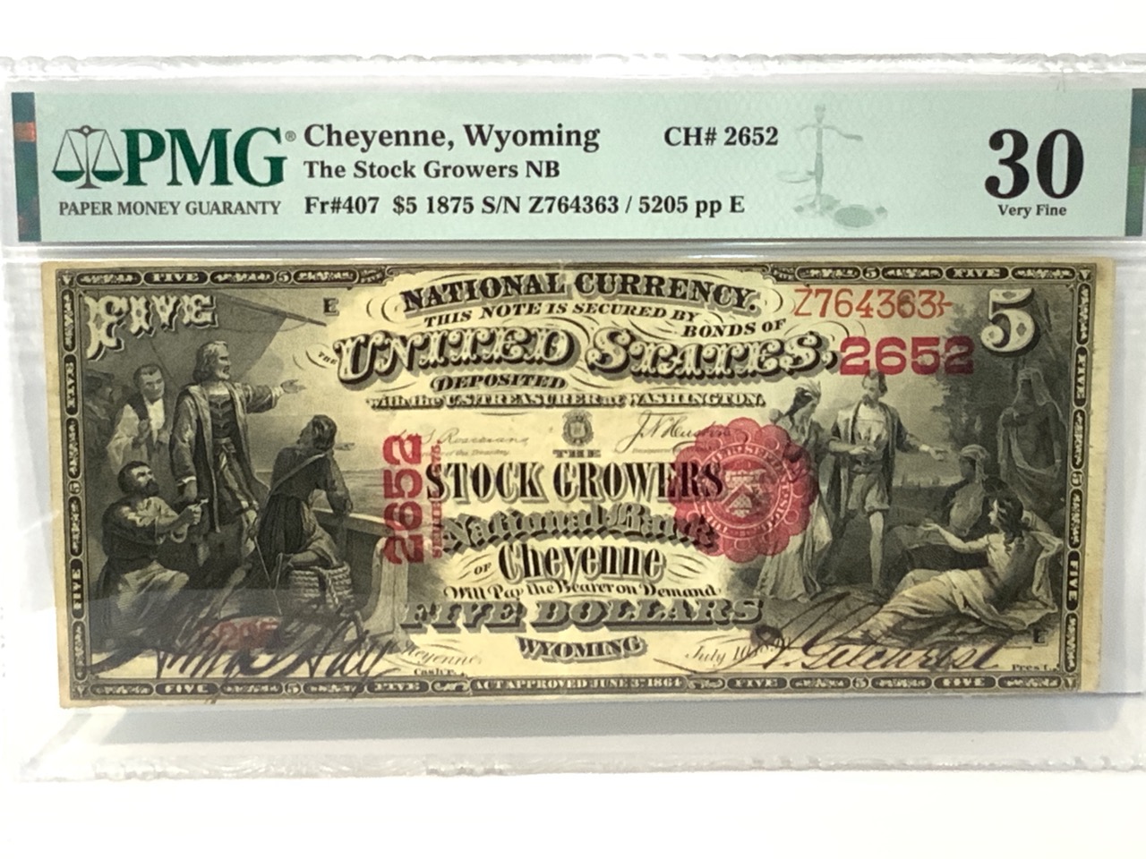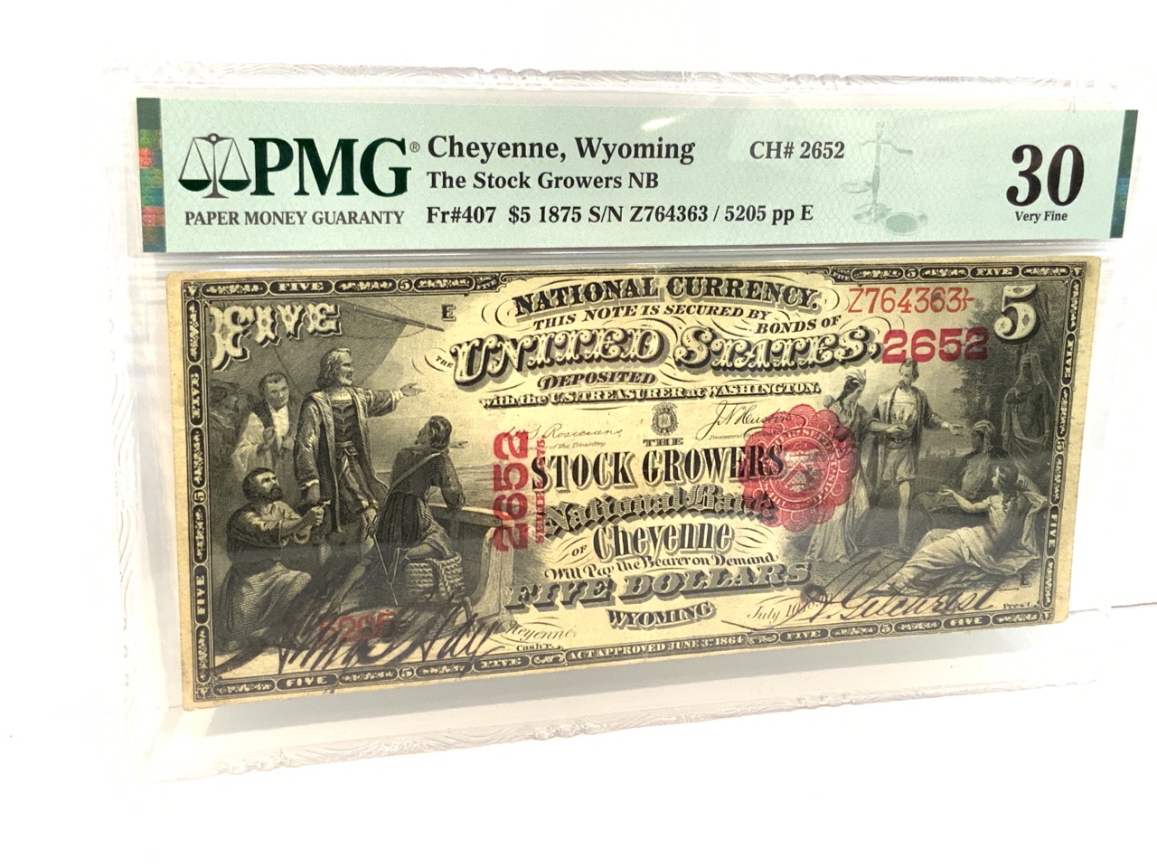 Scarce 1875 Cheyenne Wyoming Stock Growers $5 Certificate. PMG Graded 30 Very Fine. Pin holes