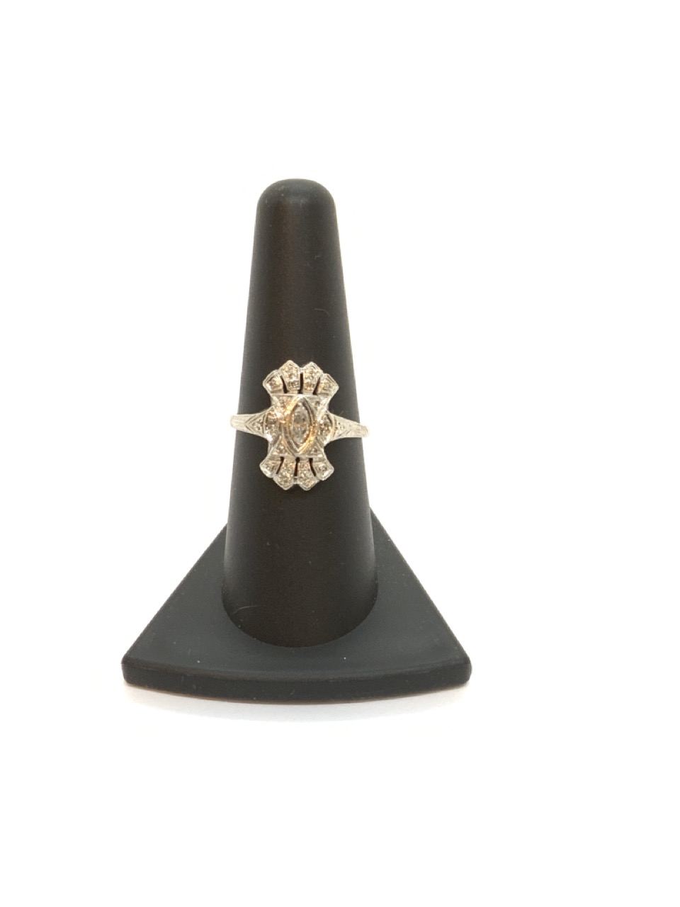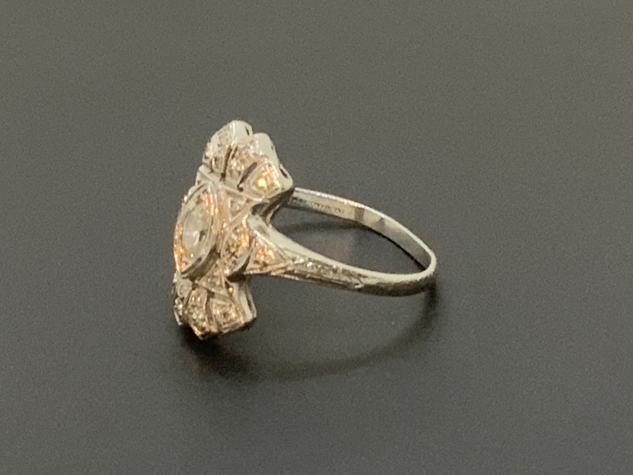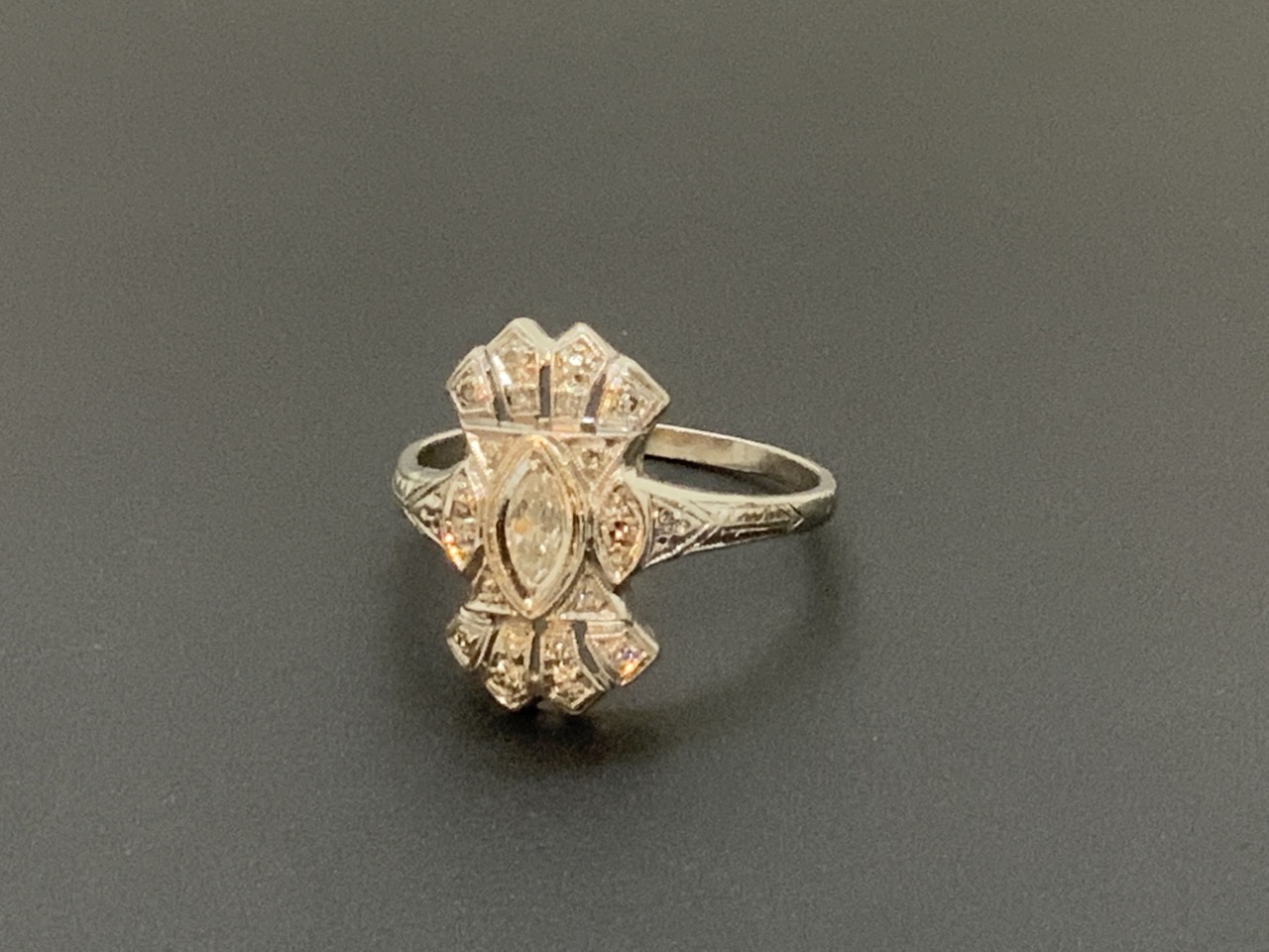 Edwardian diamond ring set in Platinum. Marquis shaped center diamond. Estate found, physical inspection always encouraged.