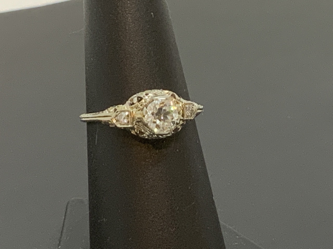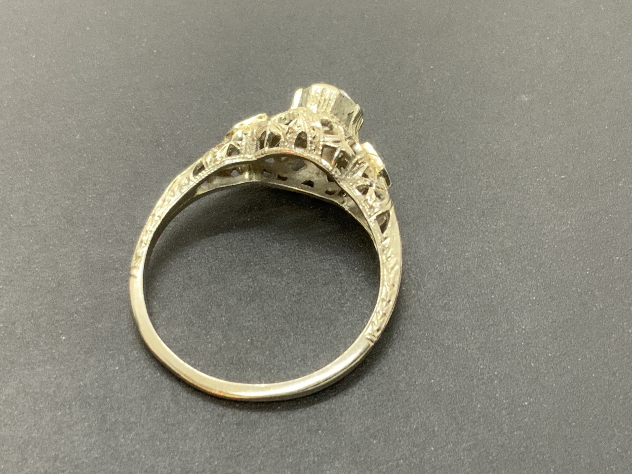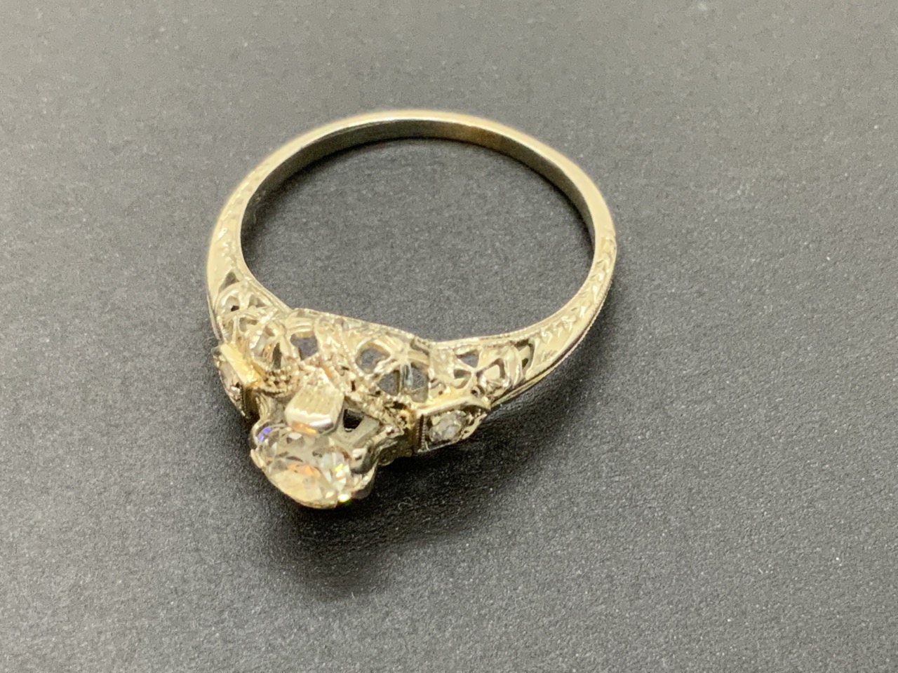 18k white gold Edwardian style diamond ring with center round diamond. Estate found, physica inspection always encouraged.