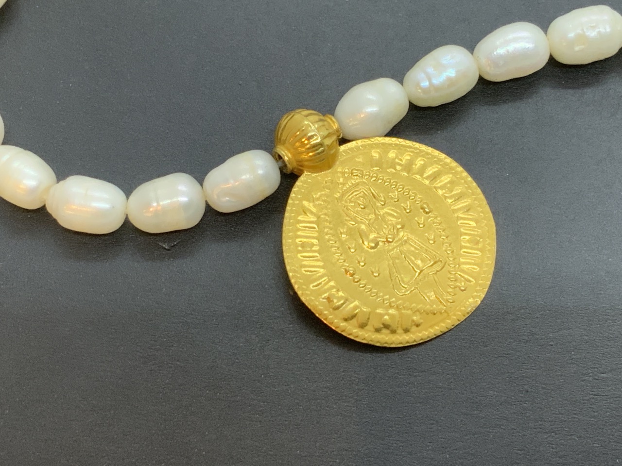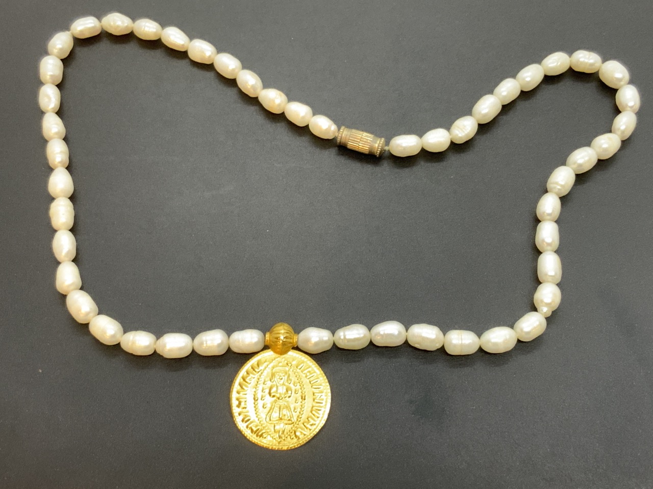 Iranian pearl necklace with 14k gold medallion pendant.