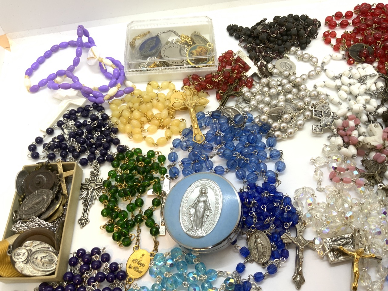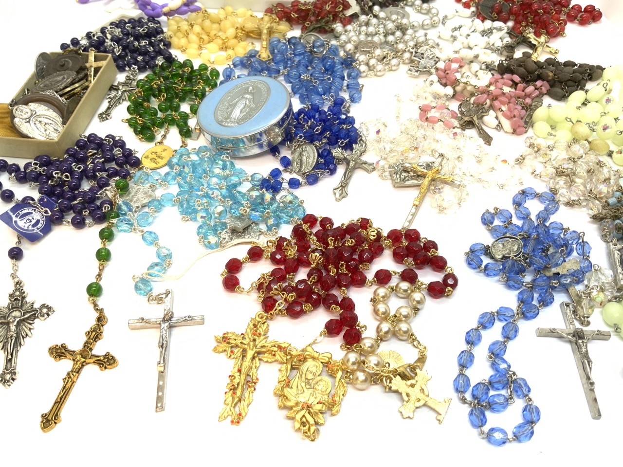 A large grouping of Roman Catholic rosary beads. Twenty + pieces. Mostly all glass or crystal.