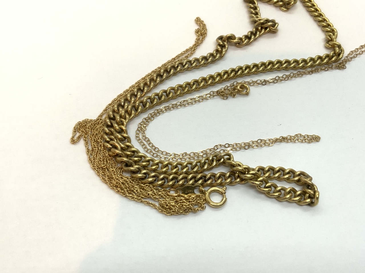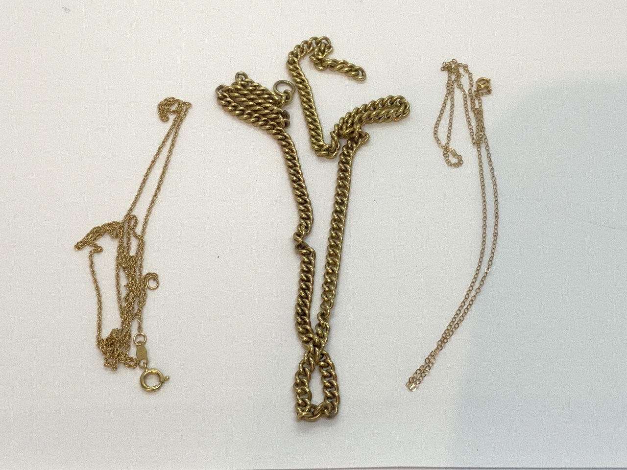 14k Gold Chains. Center one tested 14k, two side chains marked. Center chain missing clasp.