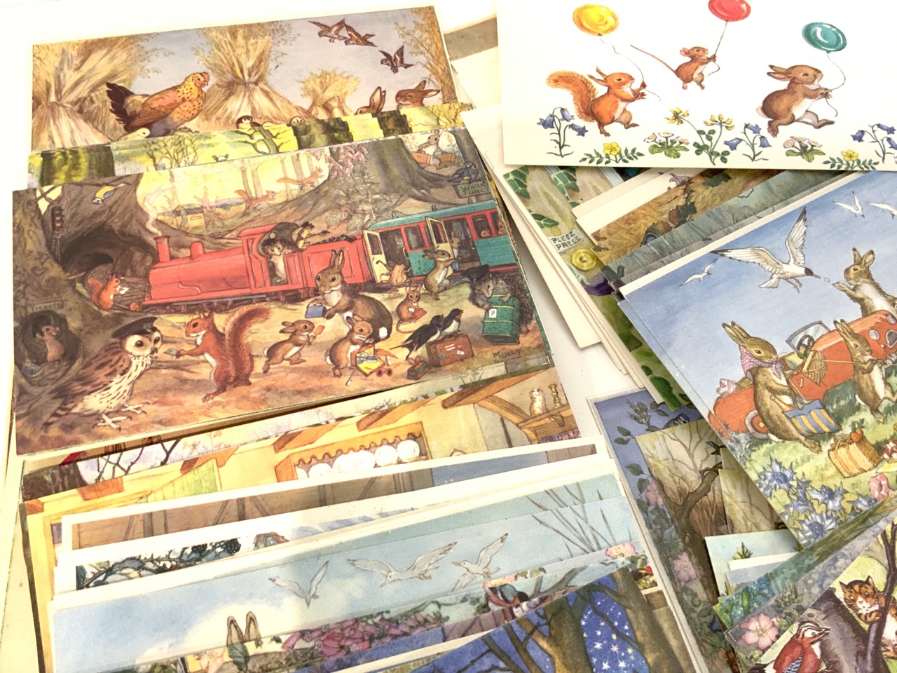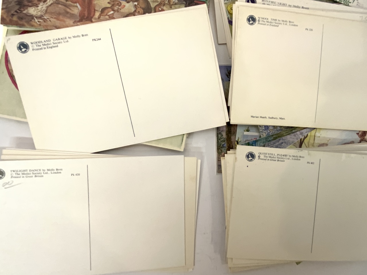 One Hundred and Twenty Two (122) Molly Brett postcards. Many rabbits and animals in landscapes. As see in photograph preview.