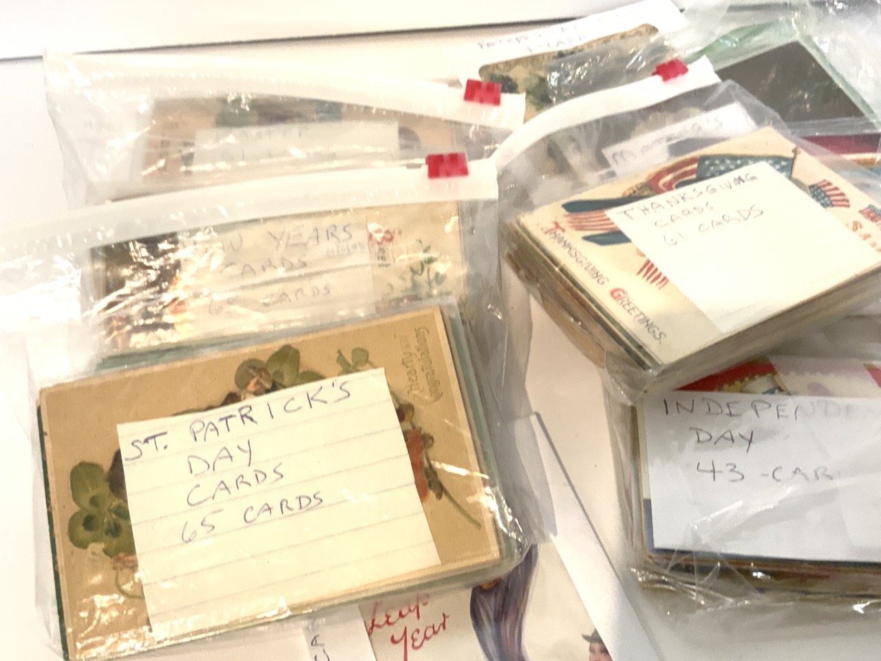 Over 250 assorted holiday postcards. New Year's, Easter, St. Patrick's Day, Independence Day, Leap Year, Mother's Day, Father's Day etc. Mostly Victorian era.