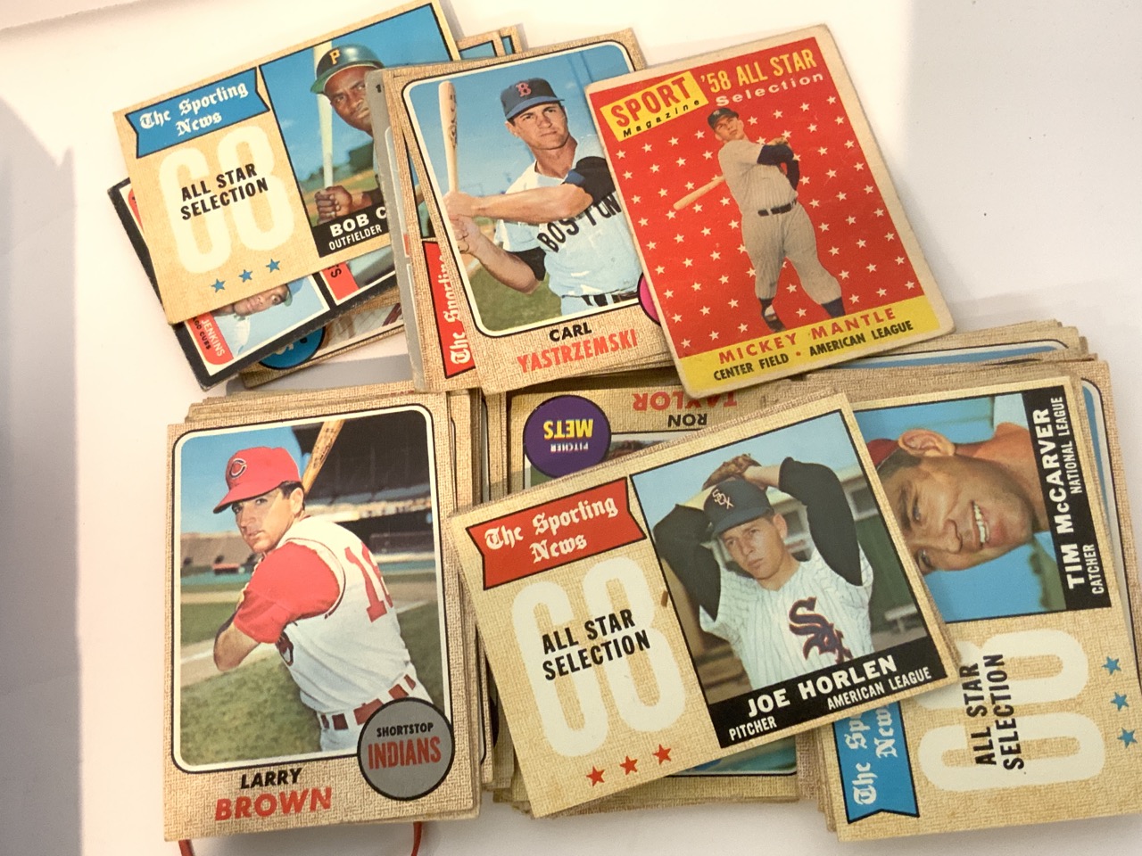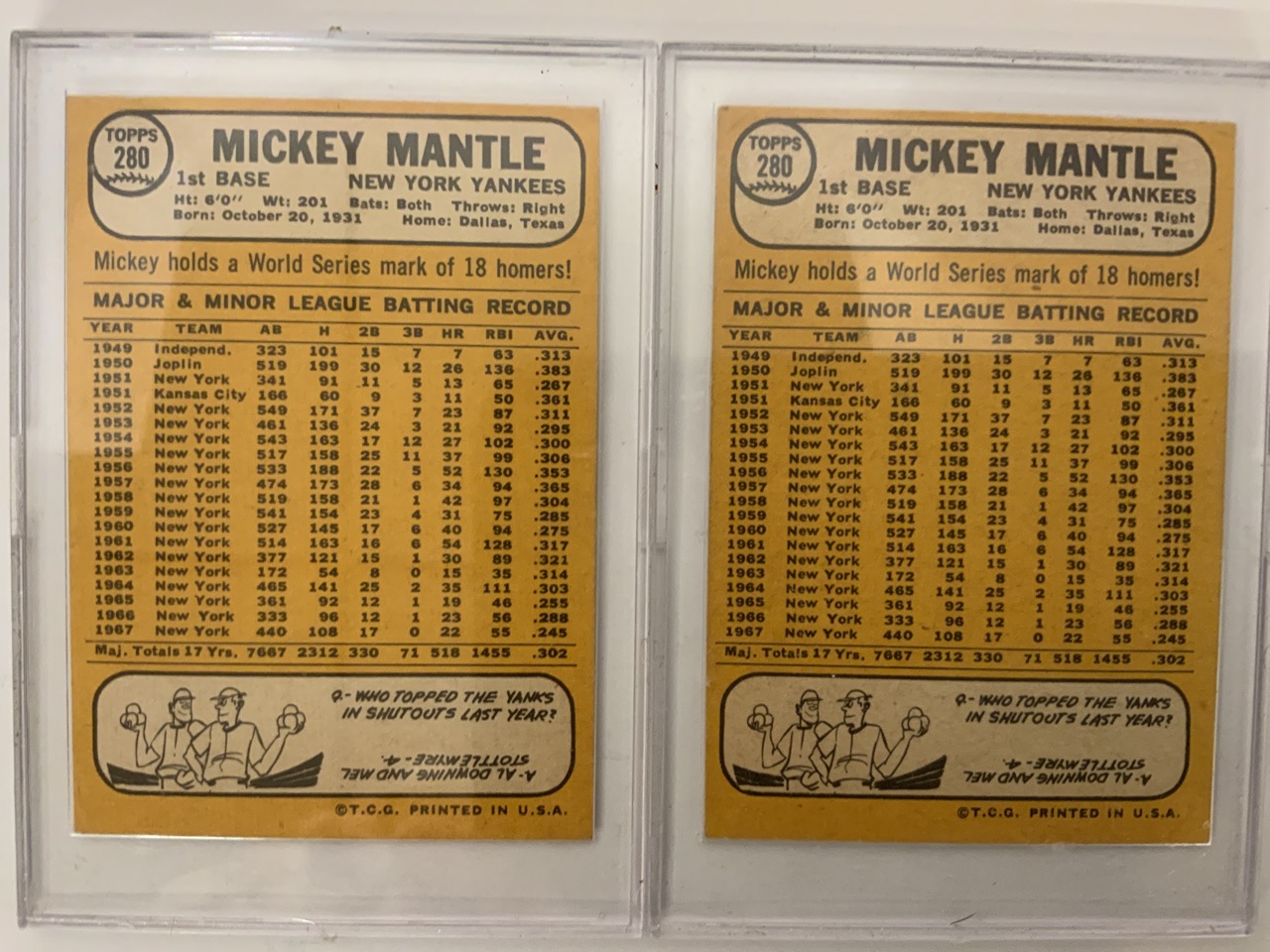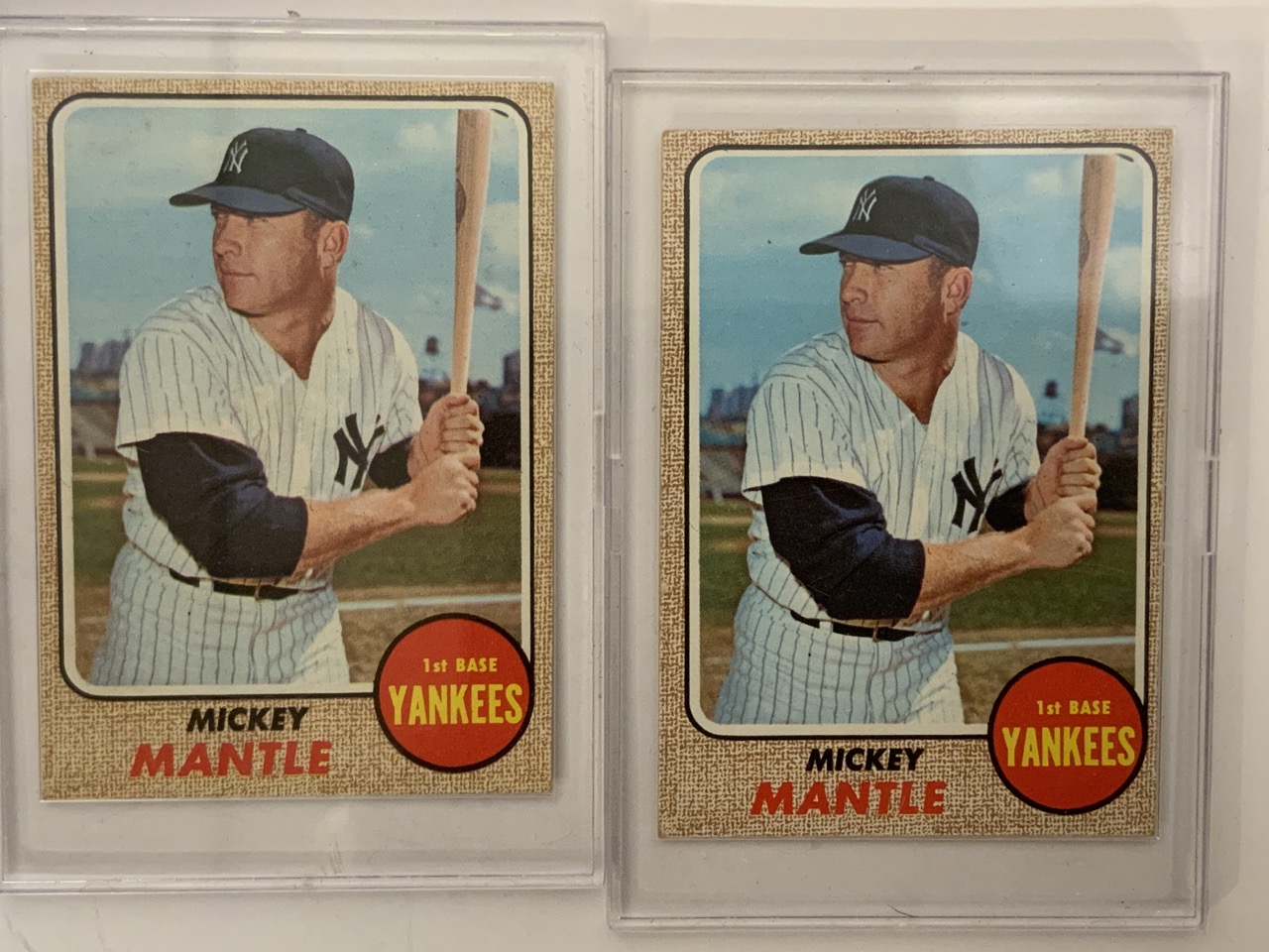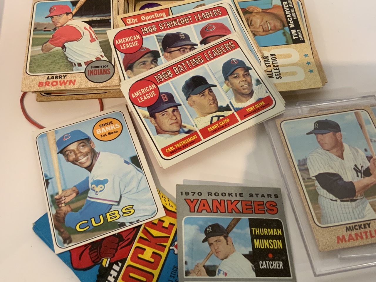 Estate found baseball cards. 1960's era including two 1968 Mickey Mantle Topps 280. Placed in protective sleeves to keep safe. Additional cards to go through by Topps and others. Hockey, Football, trade cards and more!
