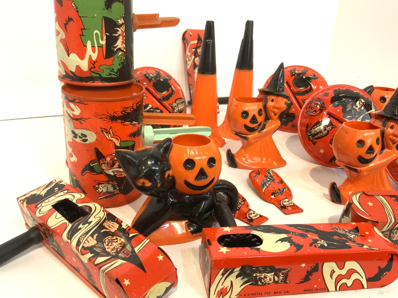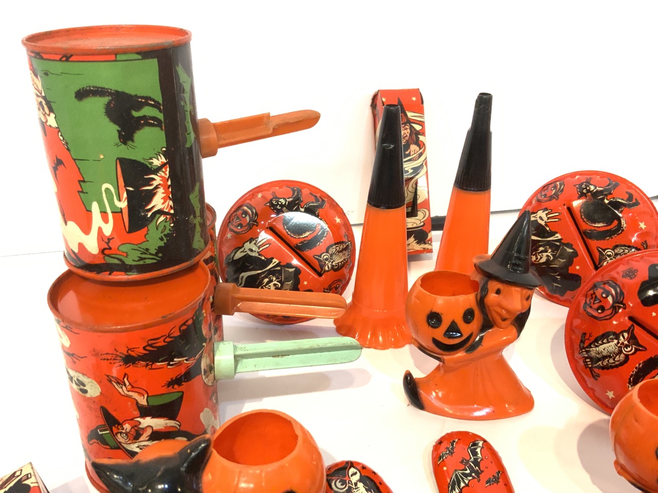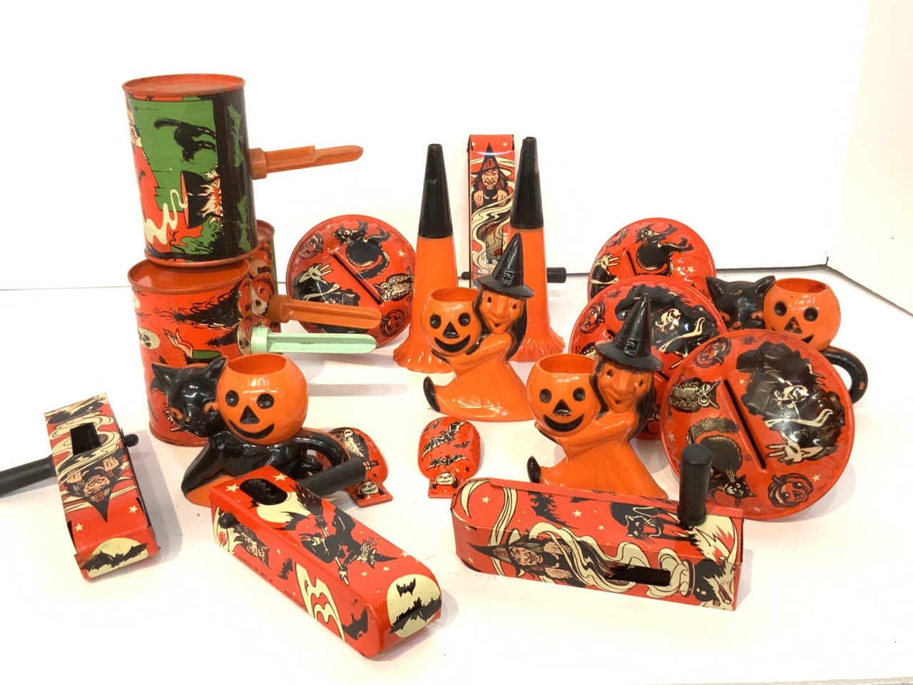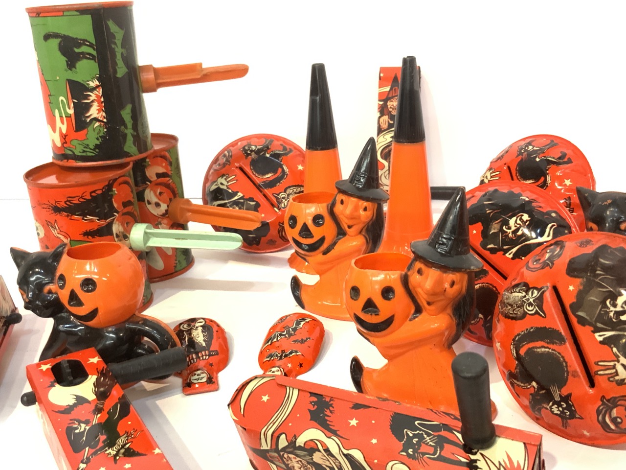 Vintage Halloween decorations. Pumpkin and Witches, Tin noisemakers and candy containers. As seen in photograph preview.