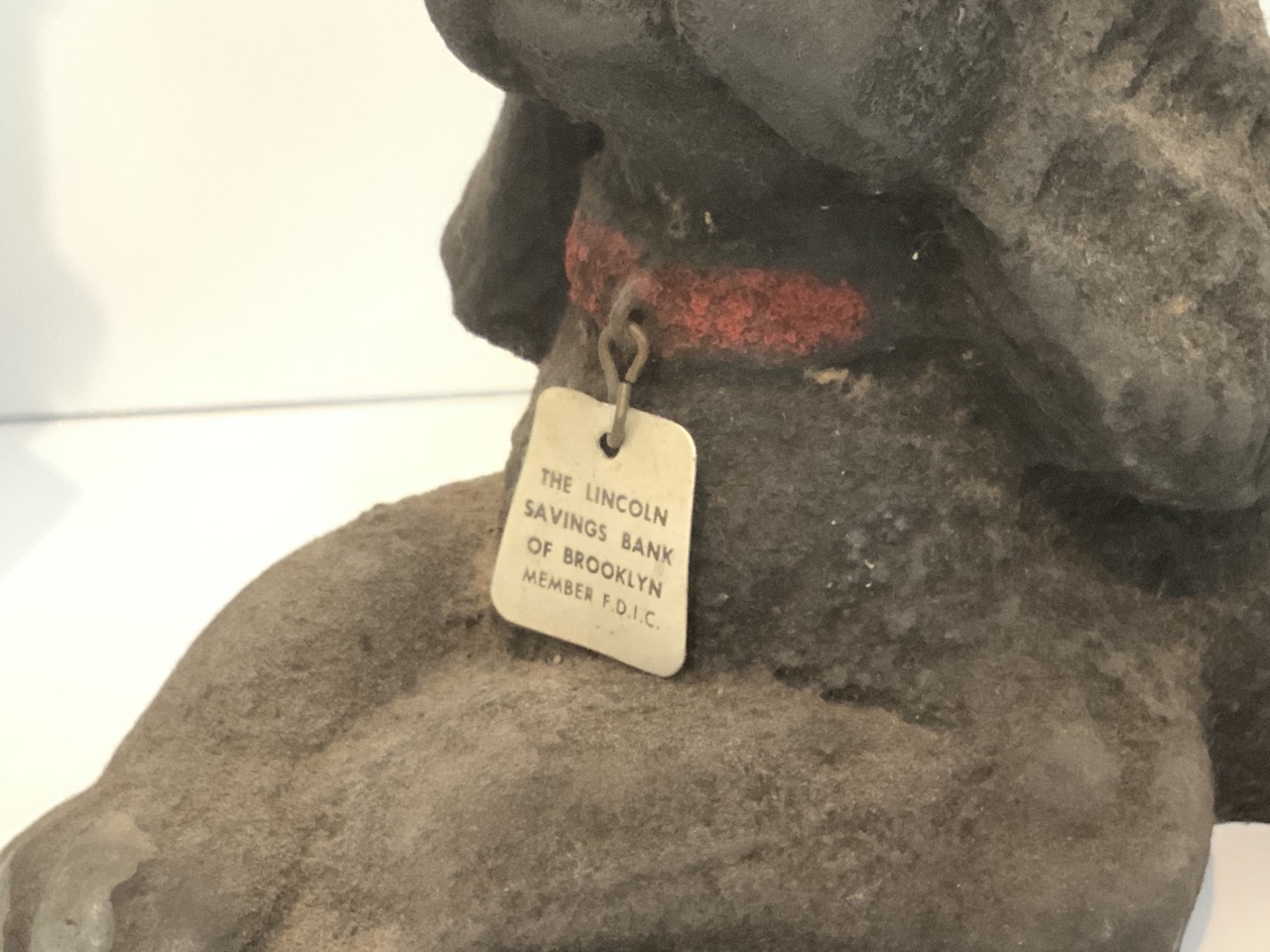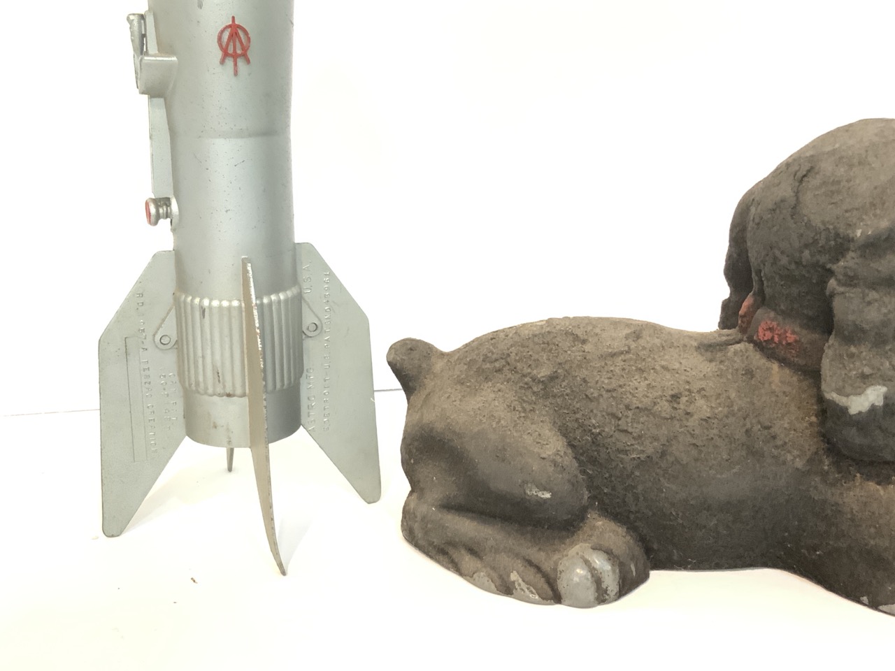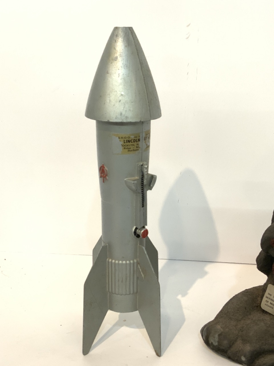Two piece Lincoln Savings Banks. Brooklyn, New York. Dog and Rocket Ship. Dog's eye is missing