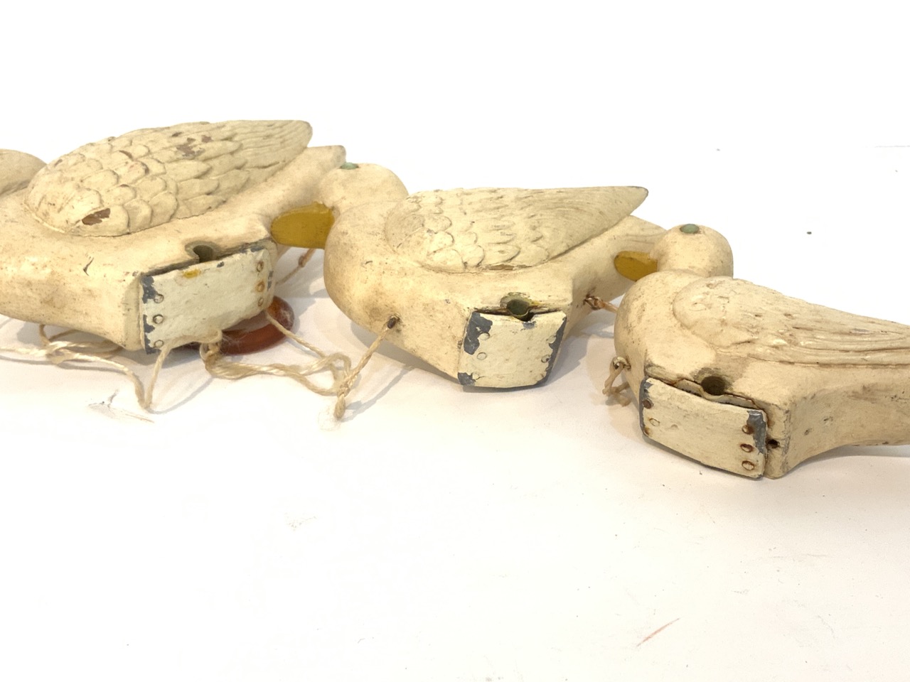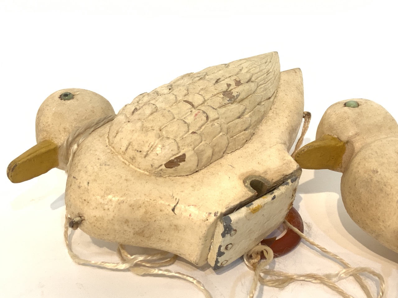 Vintage Americana carved wood duck decoy pull toy. Note jadeite inset glass eyes.