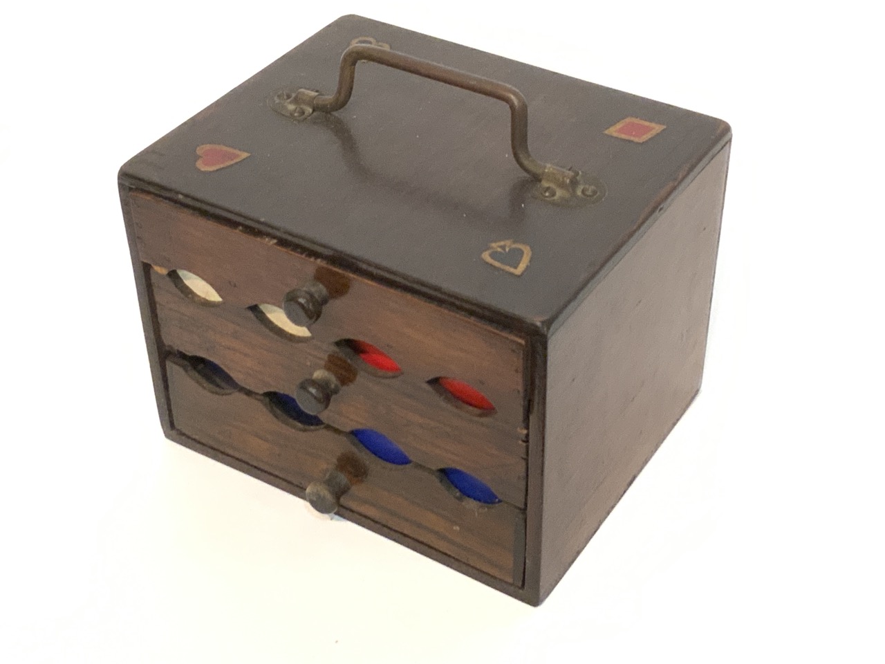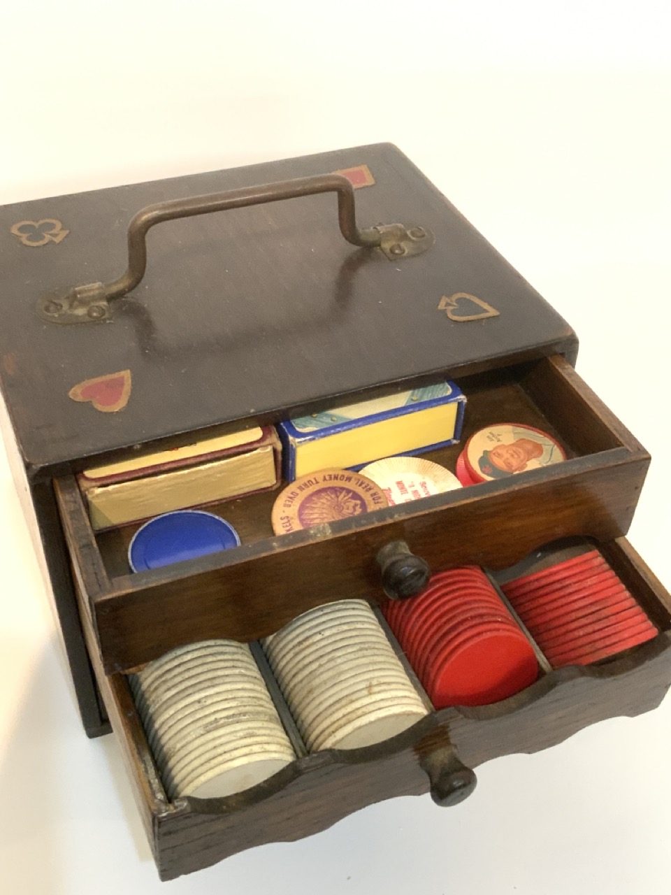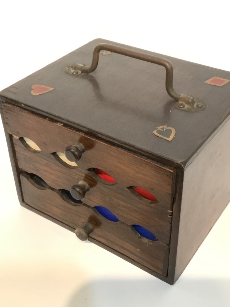 A vintage poker chip caddy. Top drawer houses playing cards and bottom two drawers holds the chips. Decopauge Diamond, spade, heart and clover decoration in each corner at top.