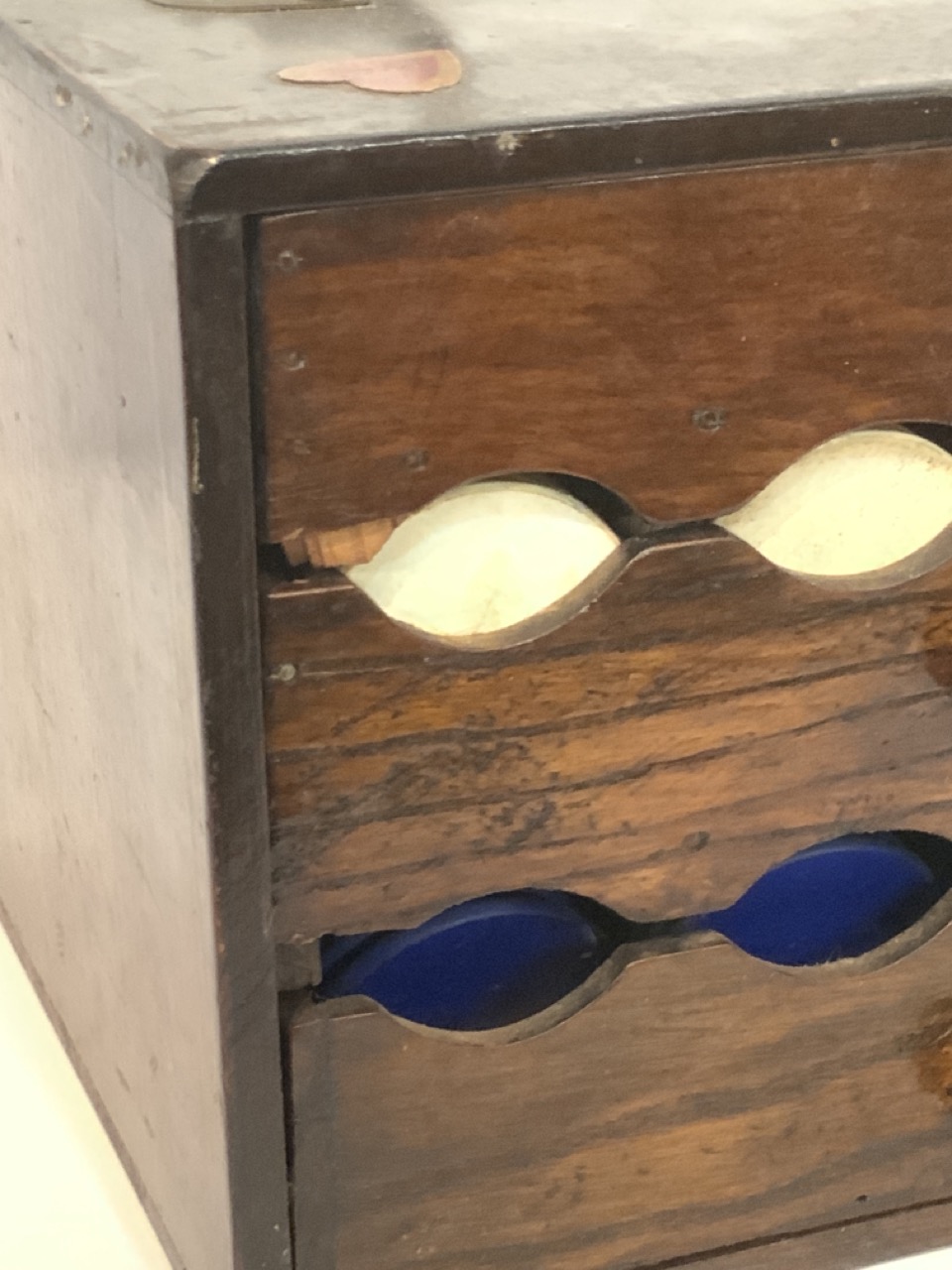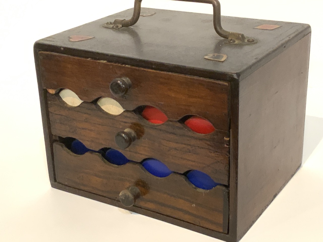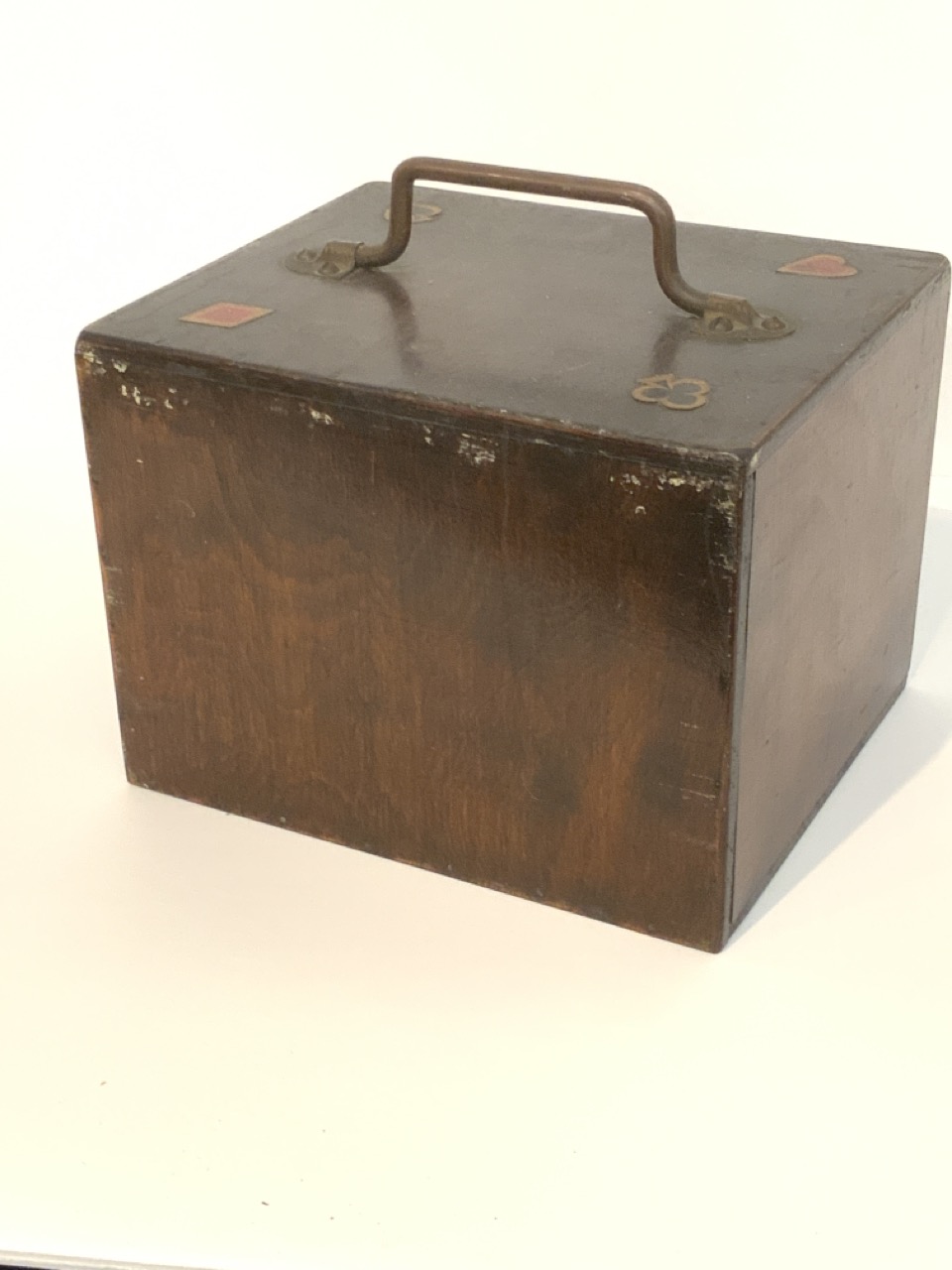 A vintage poker chip caddy. Top drawer houses playing cards and bottom two drawers holds the chips. Decopauge Diamond, spade, heart and clover decoration in each corner at top.