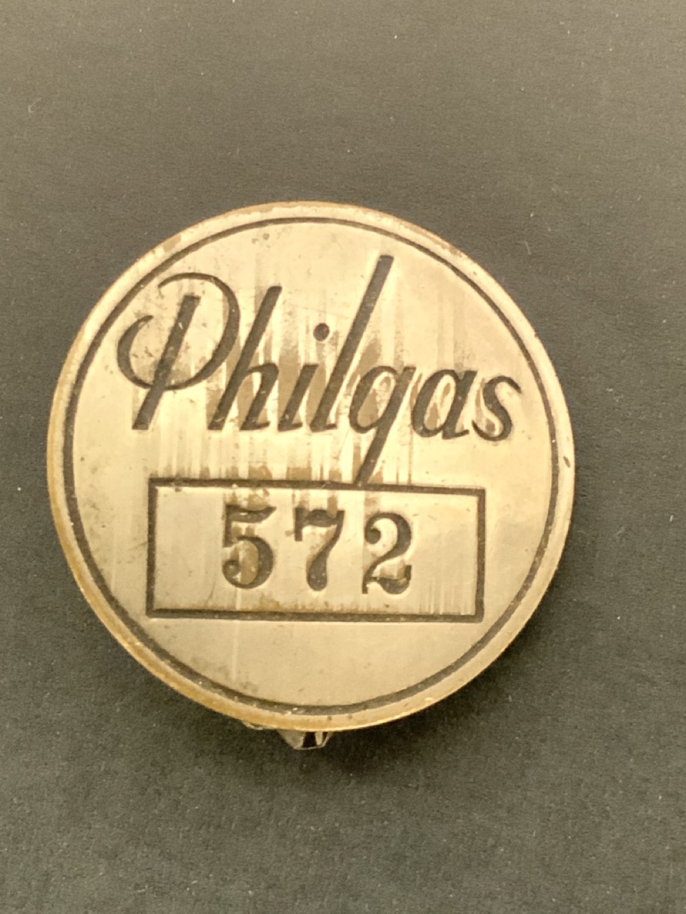 A rare Phillips Philgas Employee gas station attendant badge number 572.