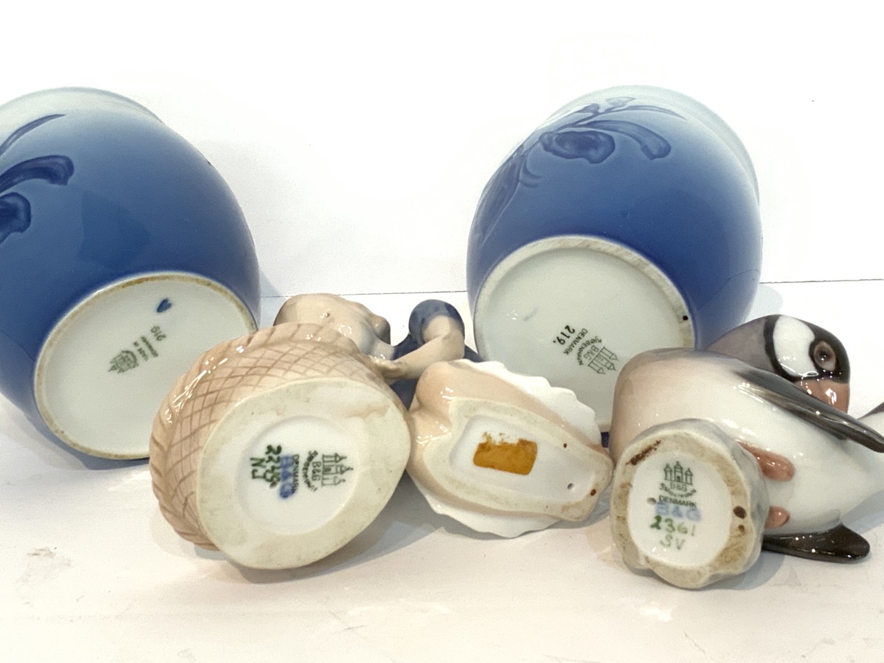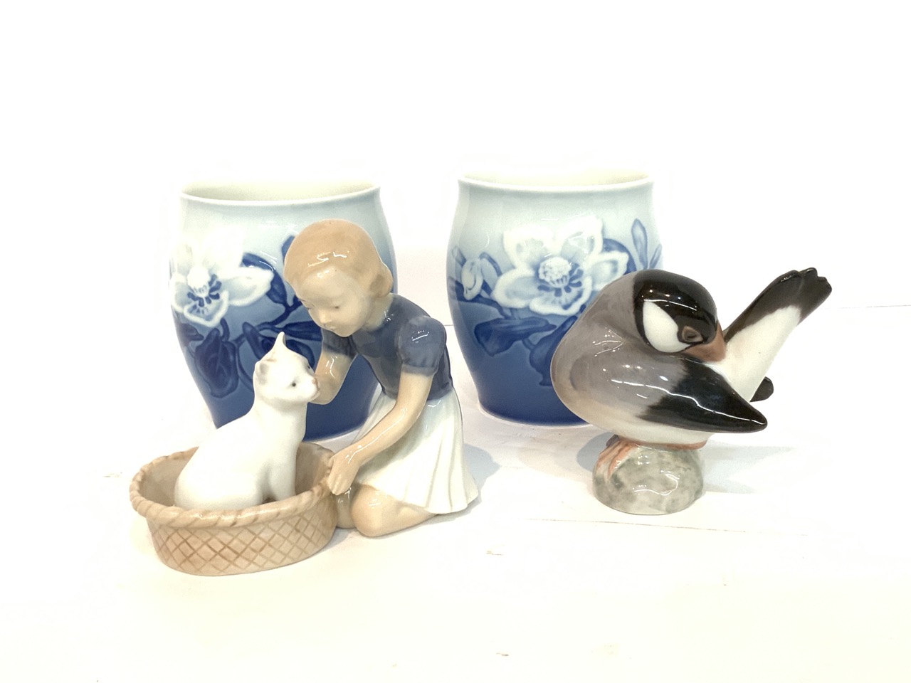 Four Bing And Grondahl B&G figurines and curio cabinet size vases.