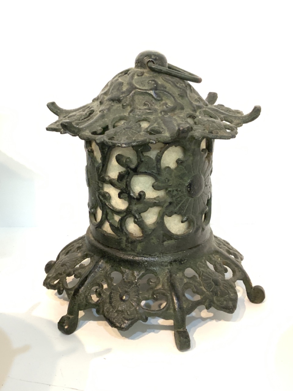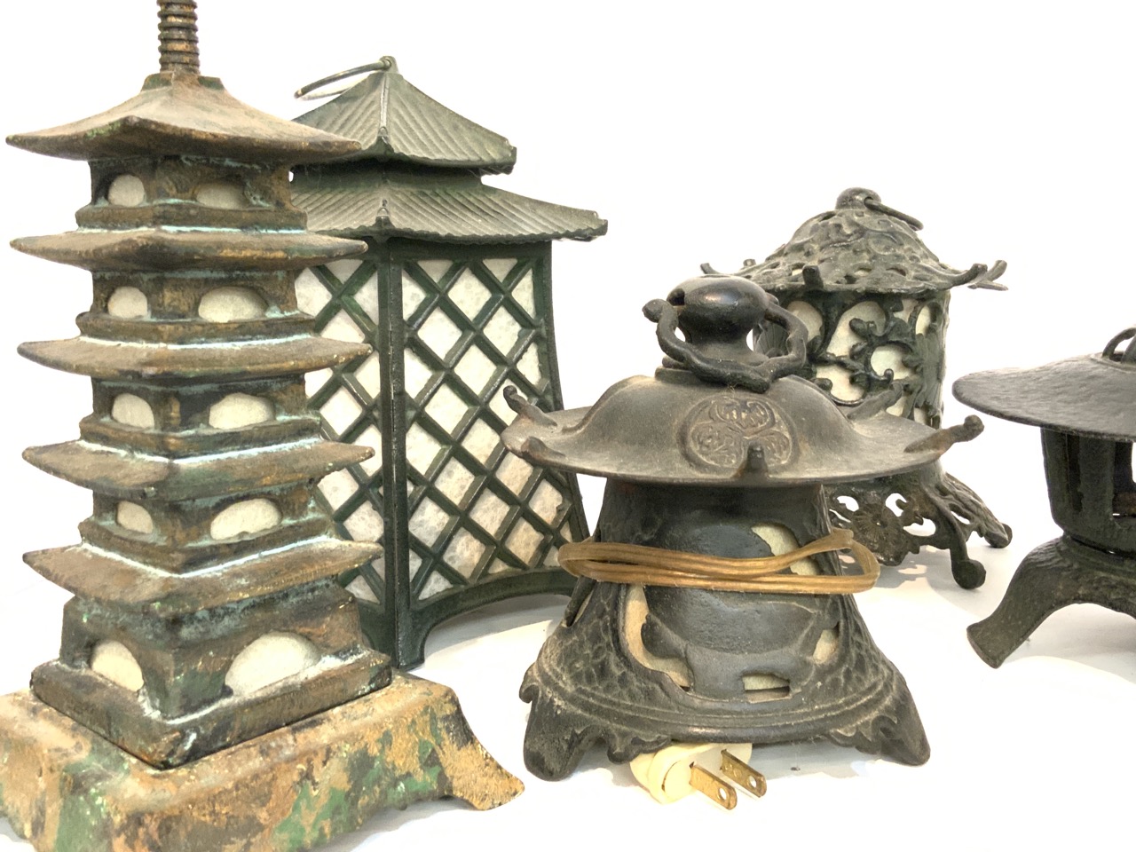 Five (5) piece Japanese cast iron garden lanterns in forms of Pagodas.