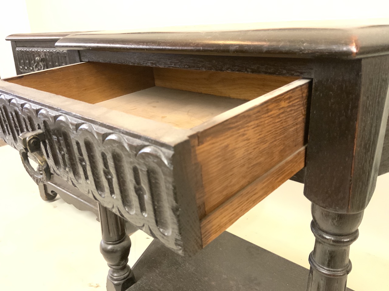 A pair of Jacobean style bed side one drawer tables.
