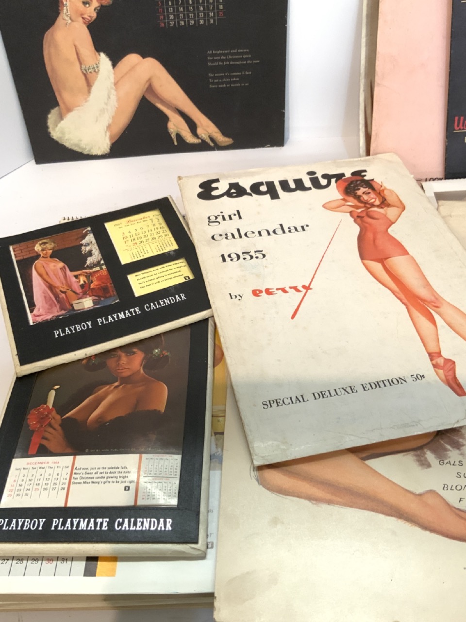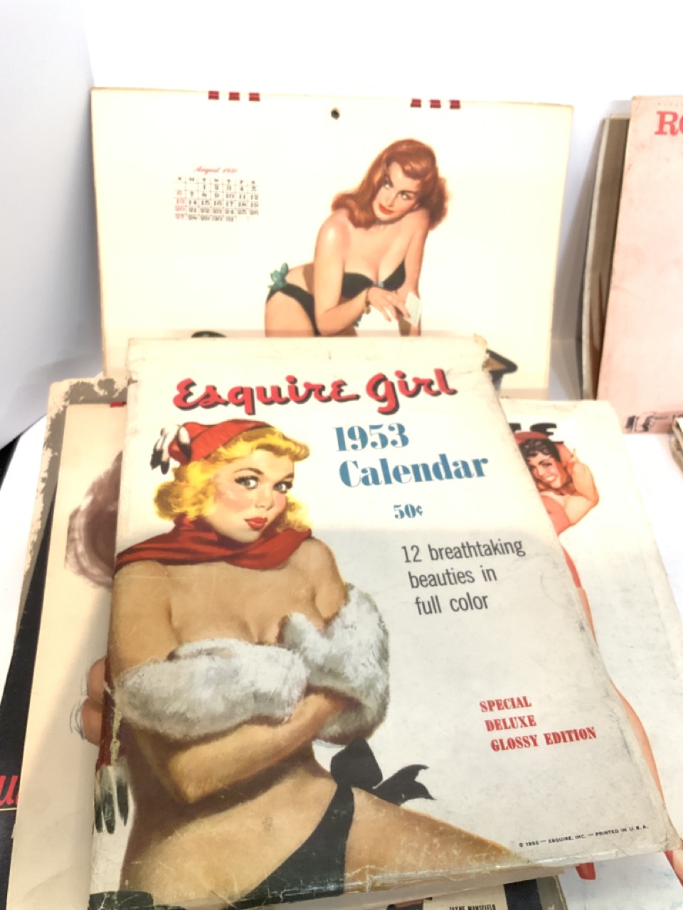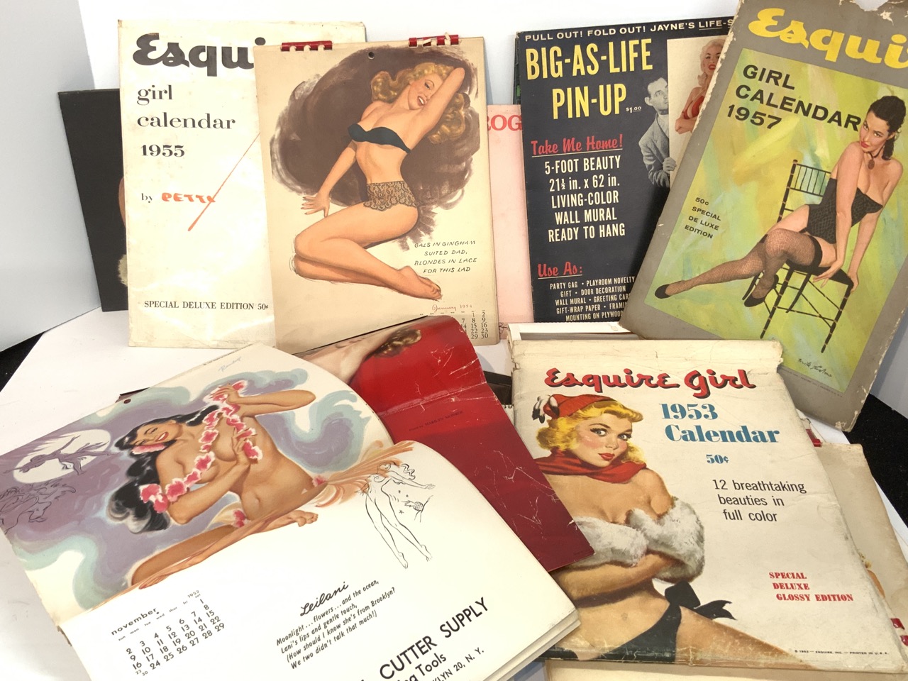 Risque, Esquire and Playboy related calendars and pin ups. Jayne Mansfield unopened life size poster, Marilyn Monroe etc. Please see photograph preview or call.