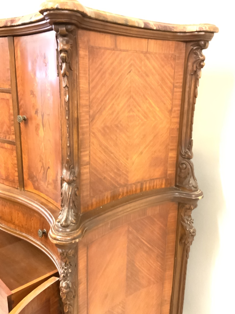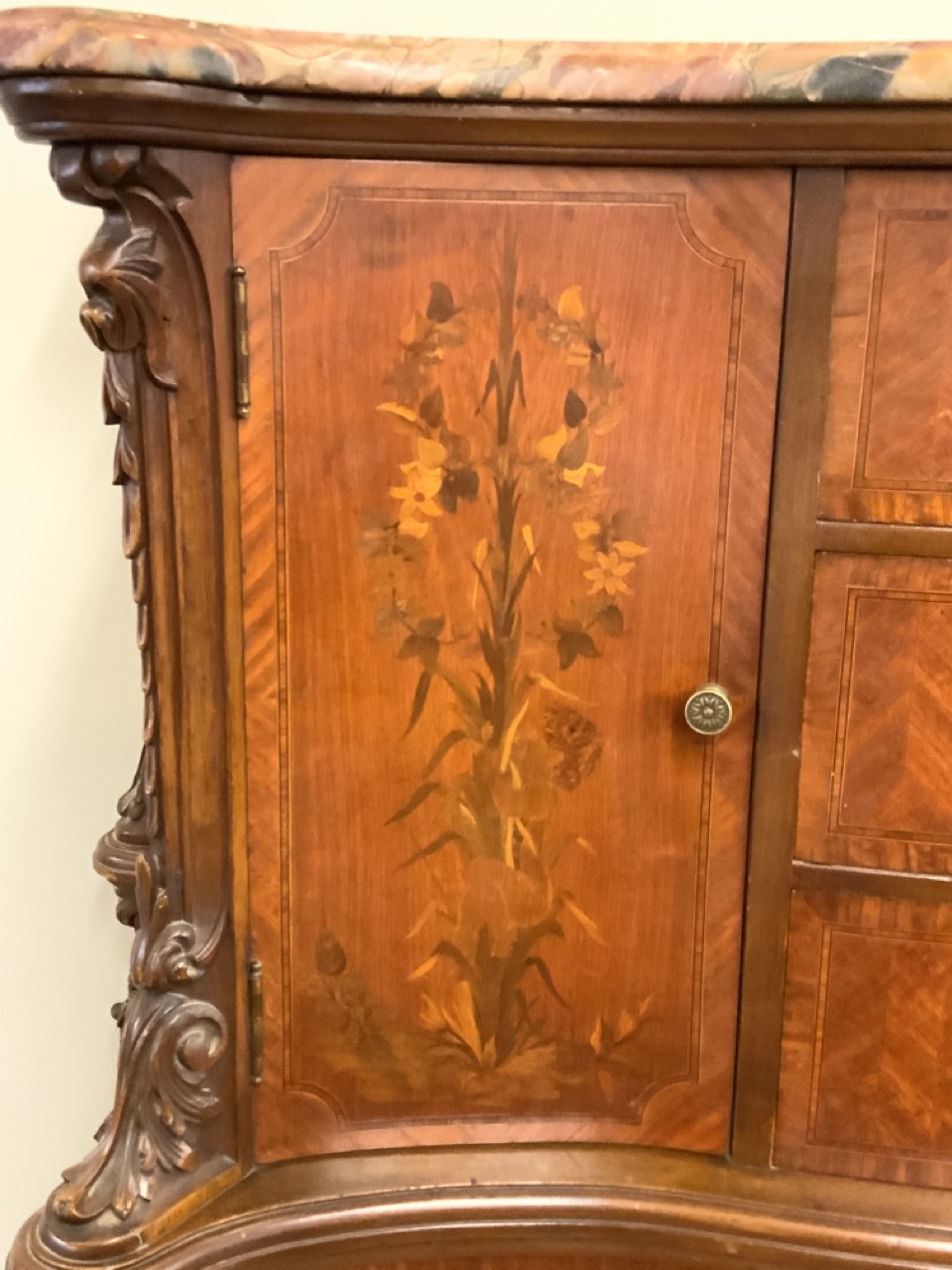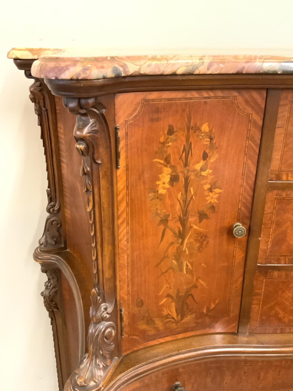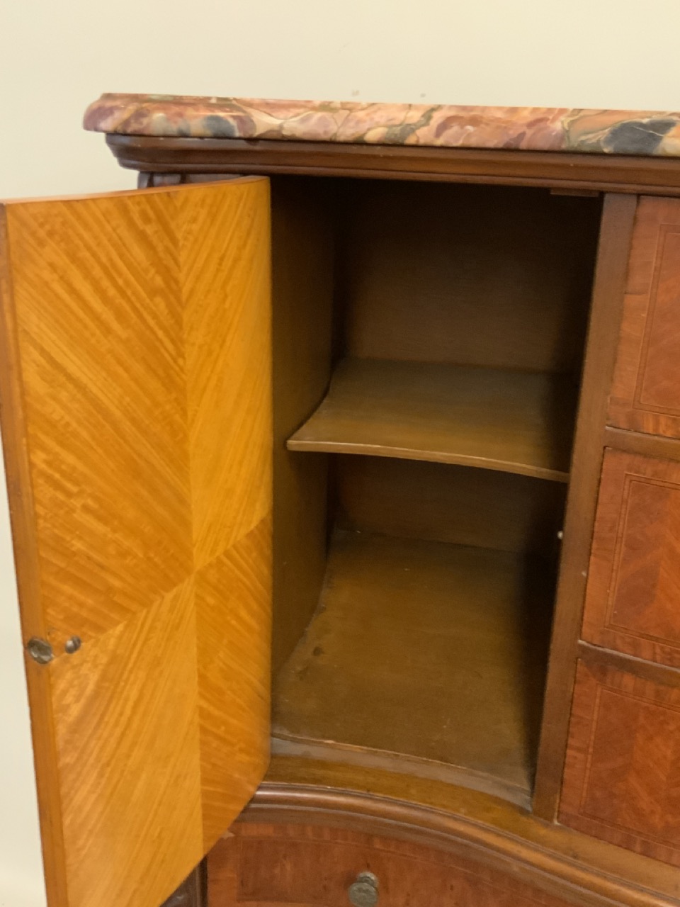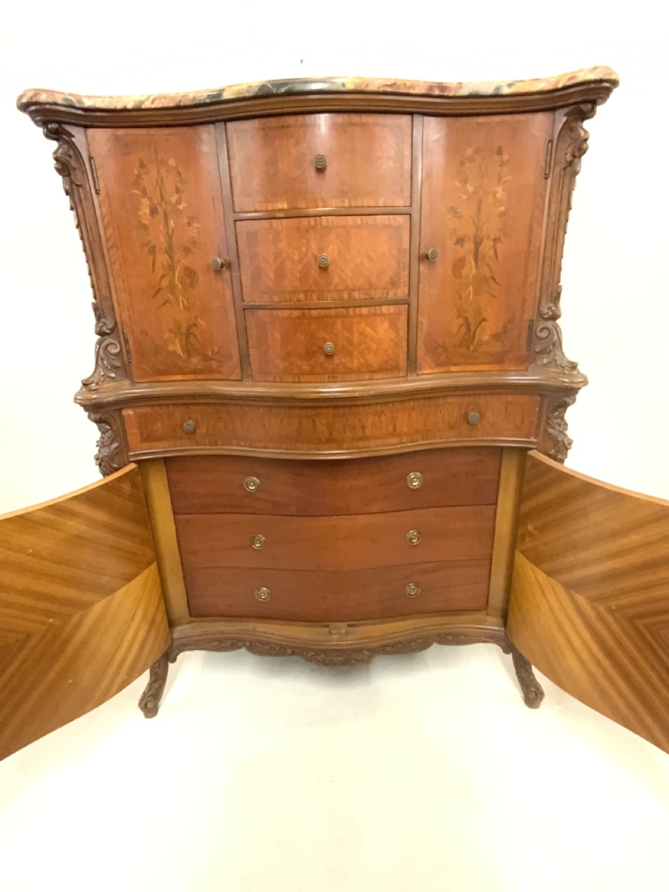Fine Louis XV style French satinwood chest with marquetry inlay and marble top. Two drawers at base are locking with key that open with additional drawers.