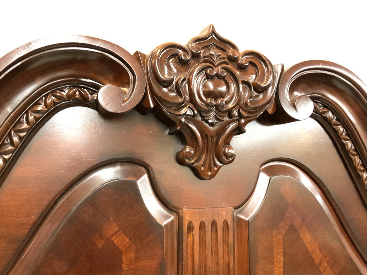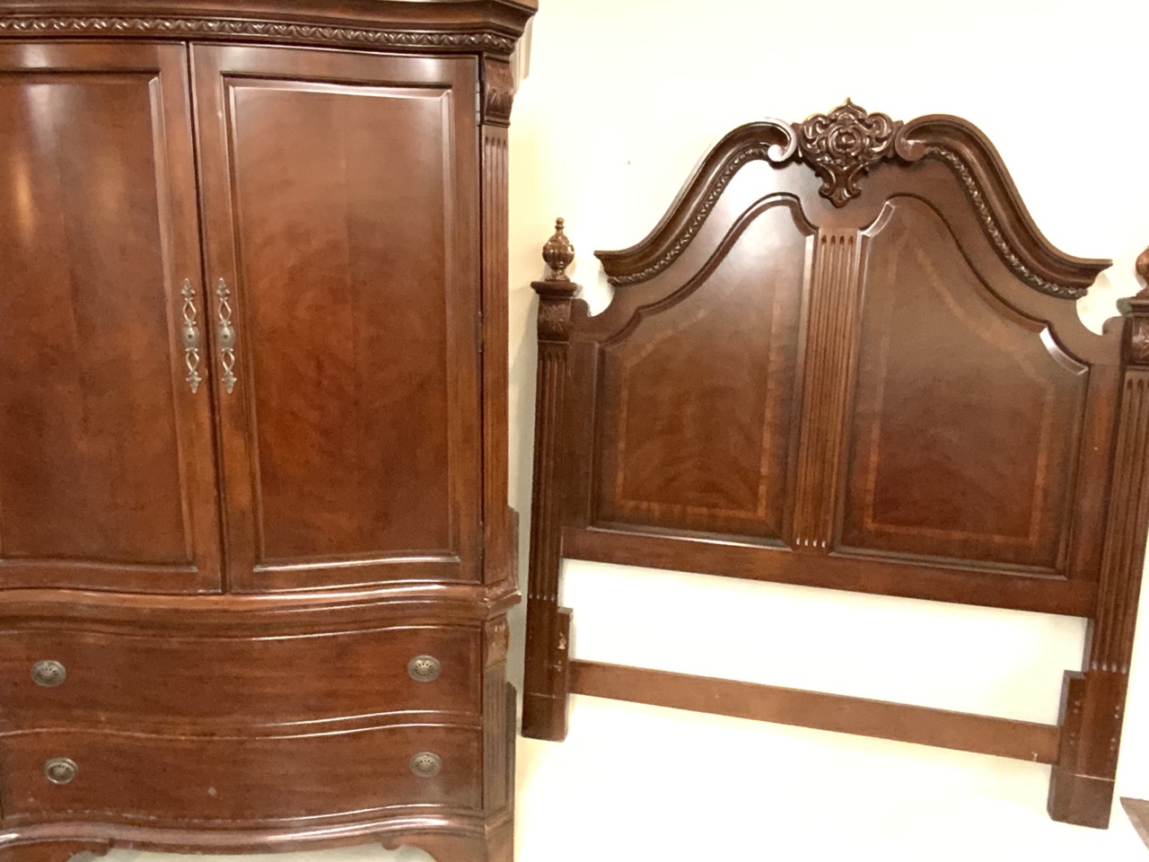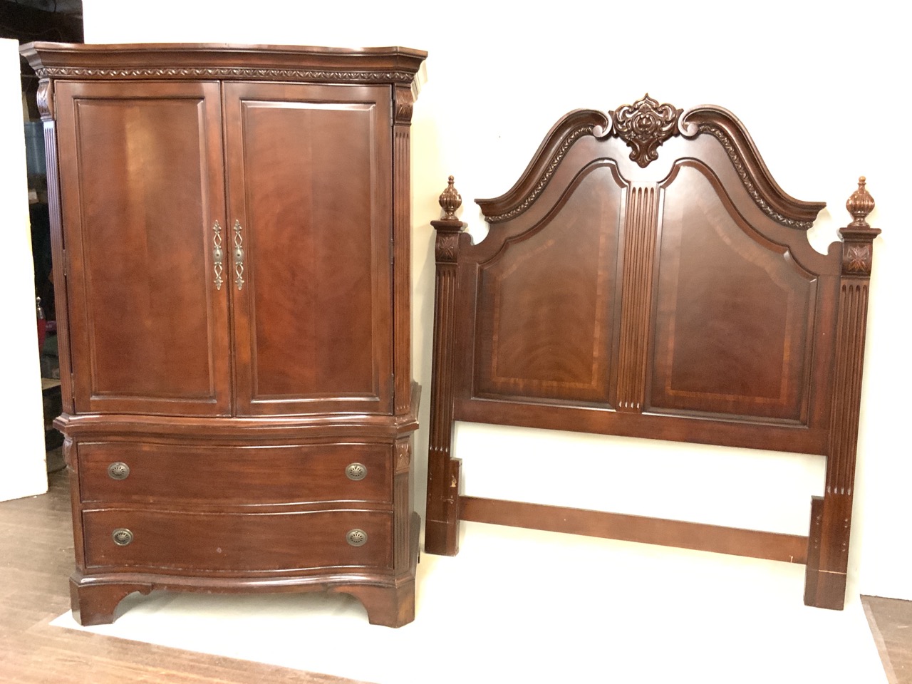 Mahogany carved queen size bed headboard and armoire unit. Contemporary. Repair needed to armoire pulls. Two pieces. Contemporary.