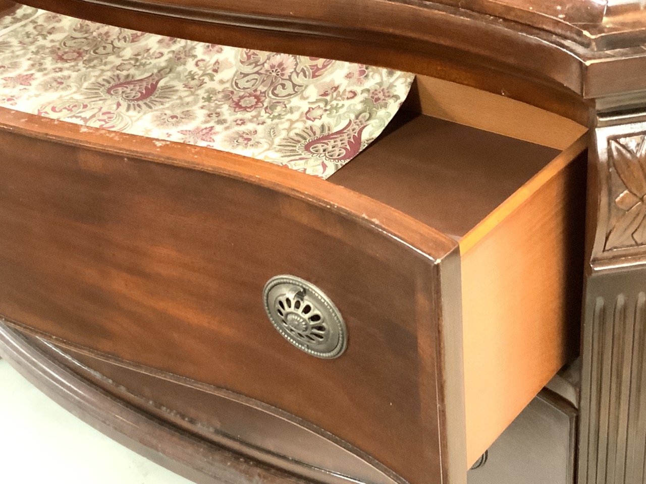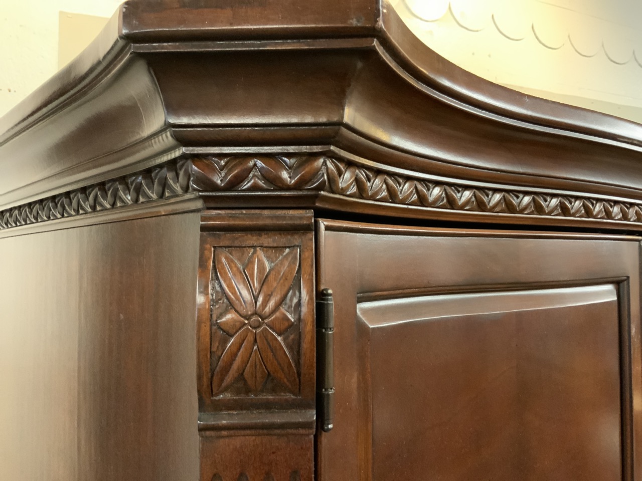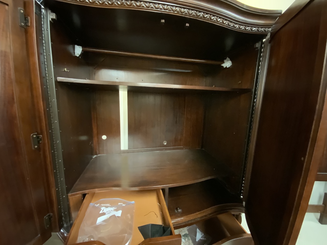 Mahogany carved queen size bed headboard and armoire unit. Contemporary. Repair needed to armoire pulls. Two pieces. Contemporary.