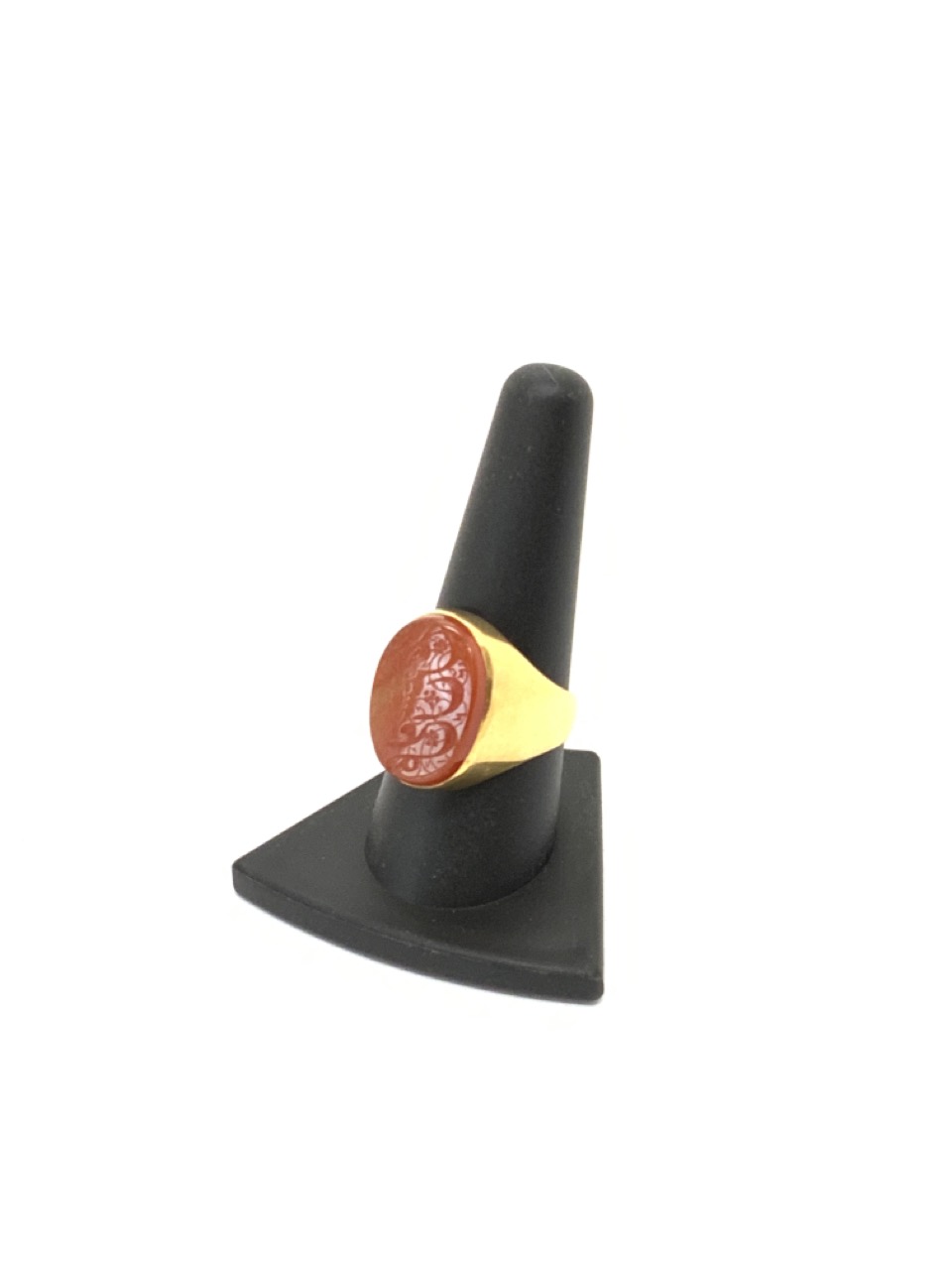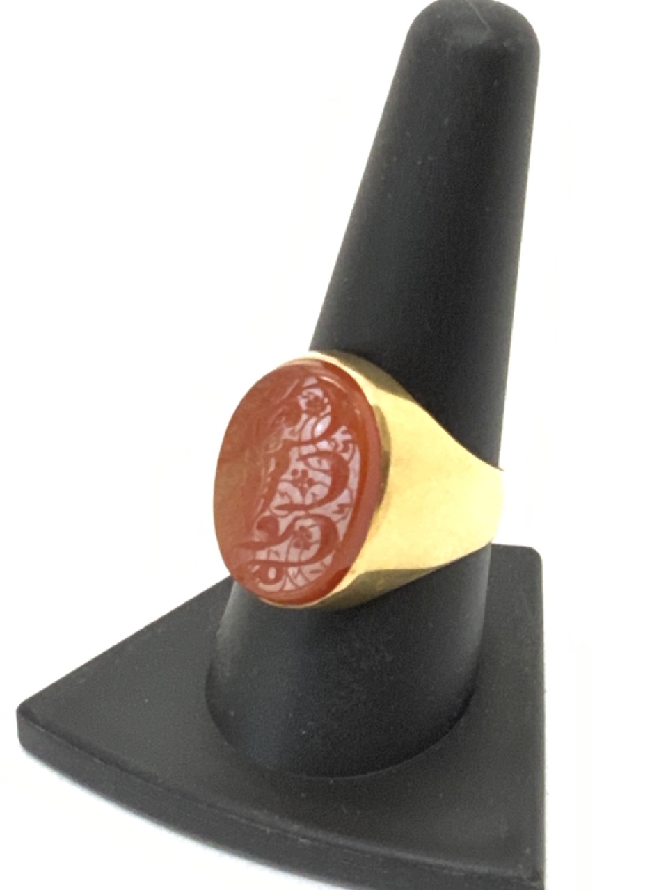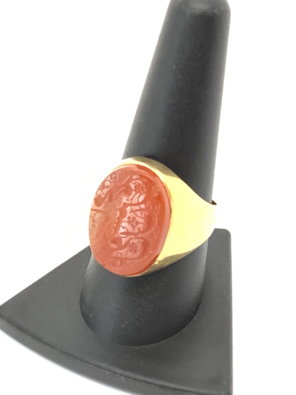 Mens 18k yellow gold sardonyx stone insignia style ring with caligraphy etched pattern. Persian, 20th century.