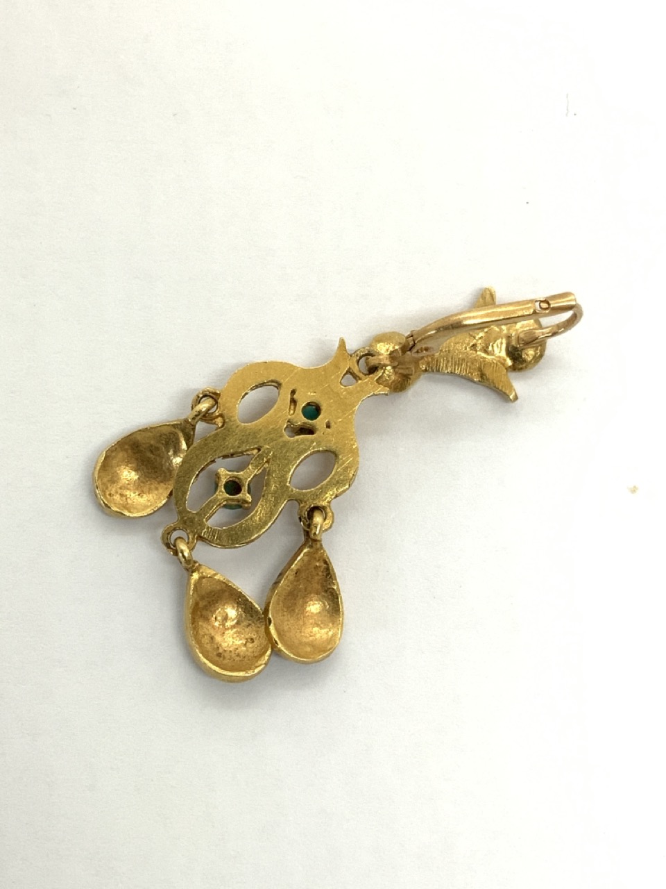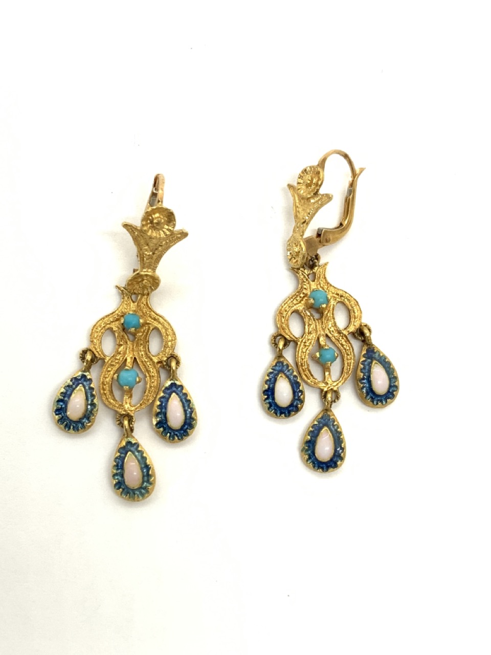 20k gold Persian drop earrings. 20k yellow gold with Persian turquoise stone, coral stones and enamel work. Lever backs.