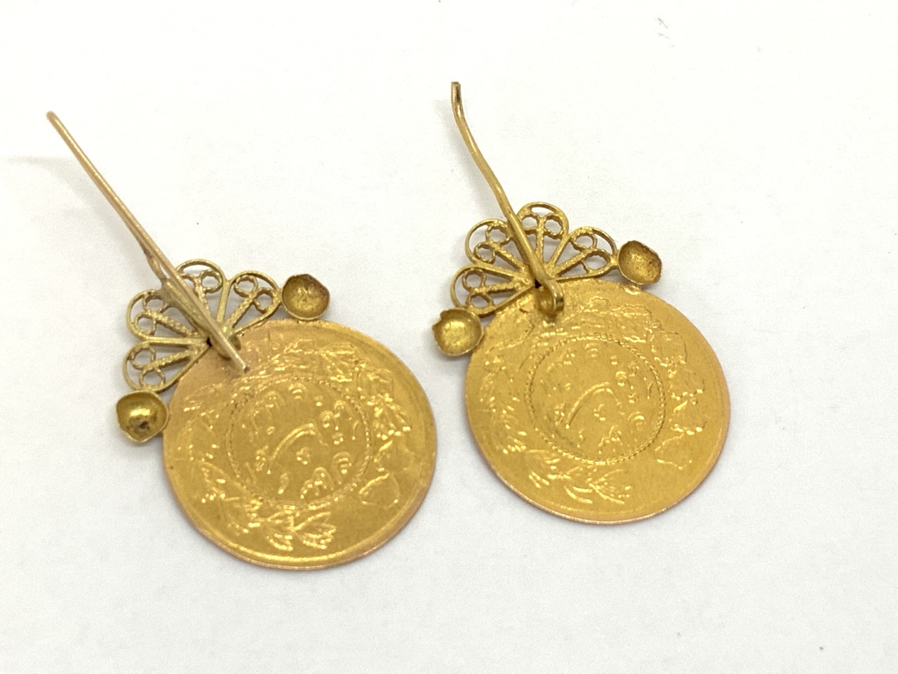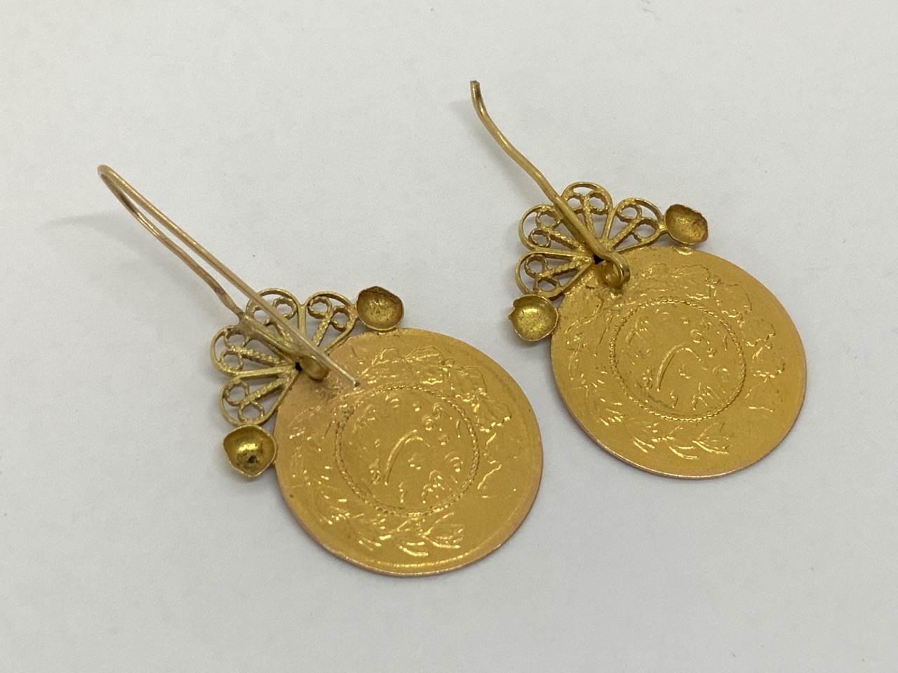 1917 1/2 Tuman gold coin earrings. Iran. One wire back is broken.