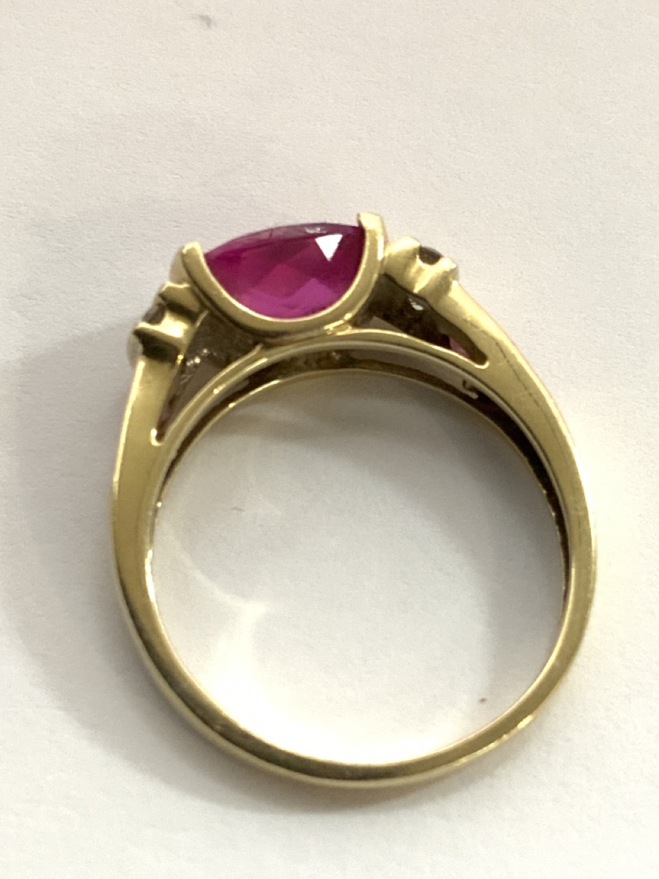 10k yellow gold simulated ruby and diamond lady's ring.