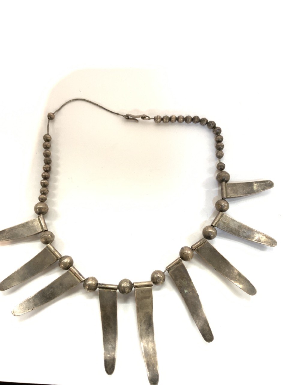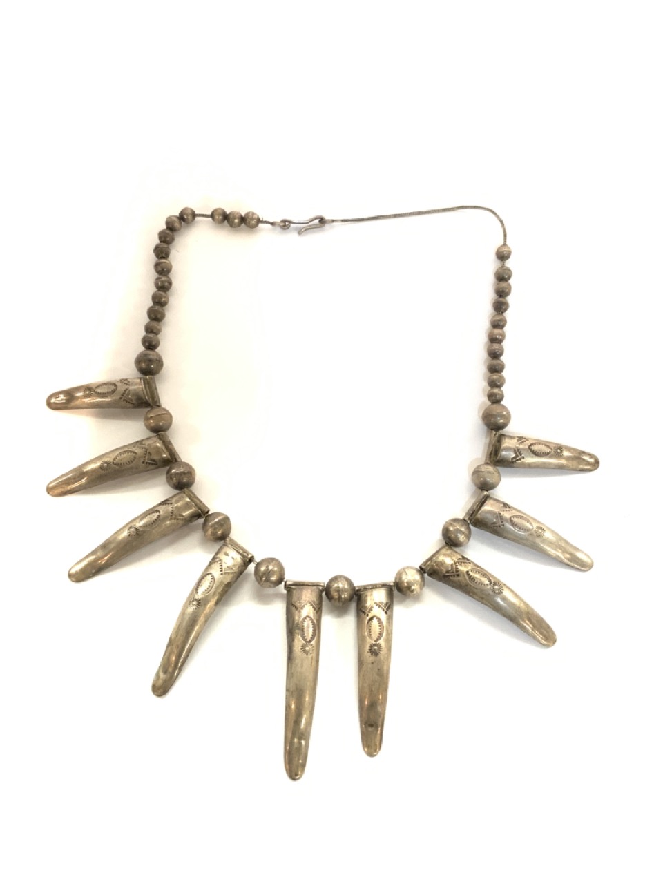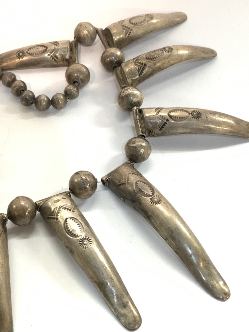 Early 20th century impressive American Indian bear claw necklace. Sterling Silver. The largest claw is 2 1/2" length and graduates down.