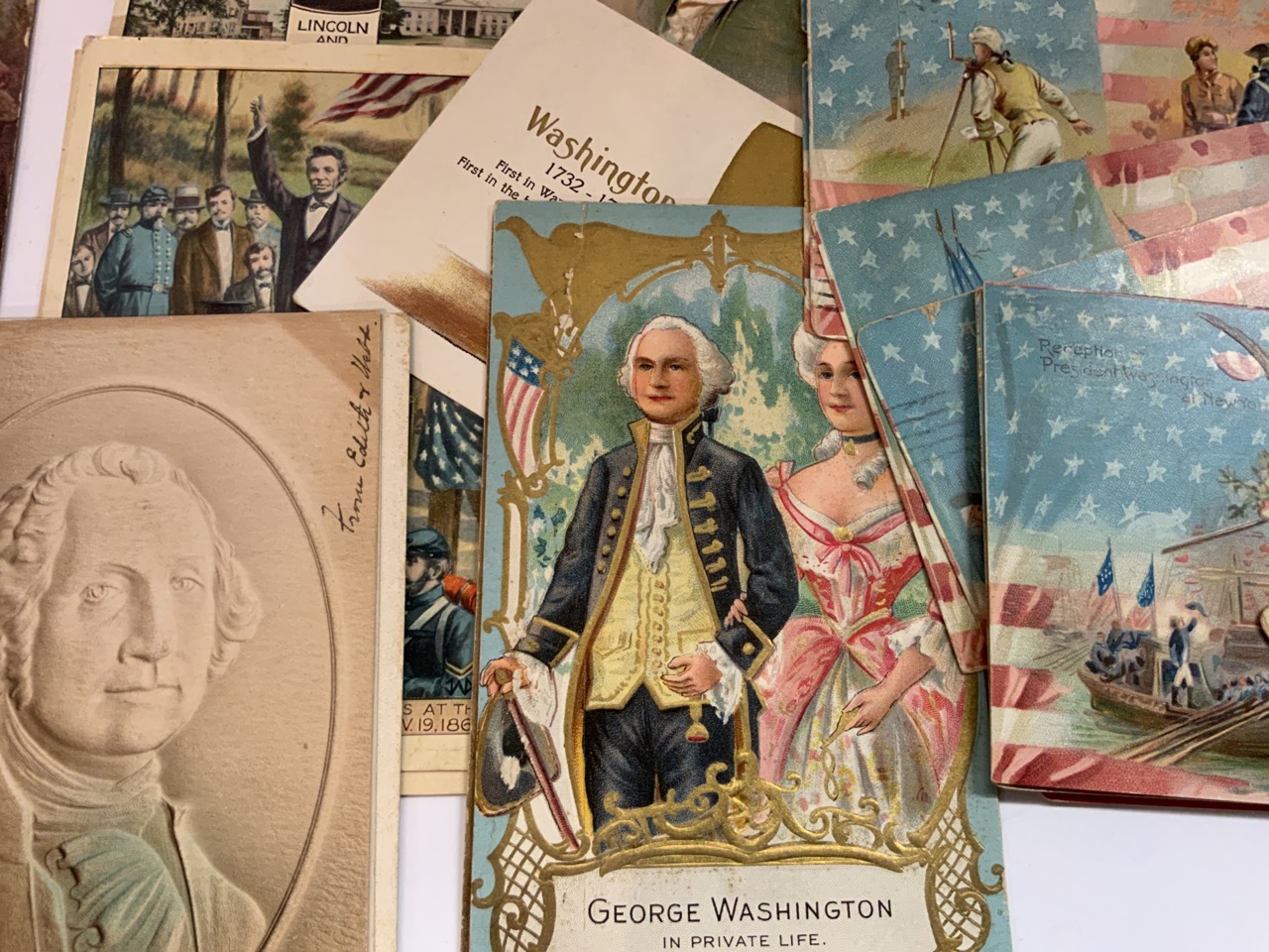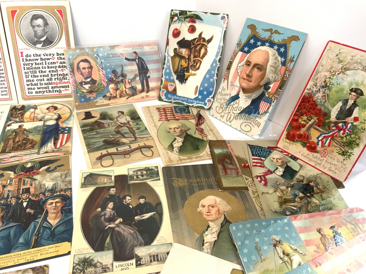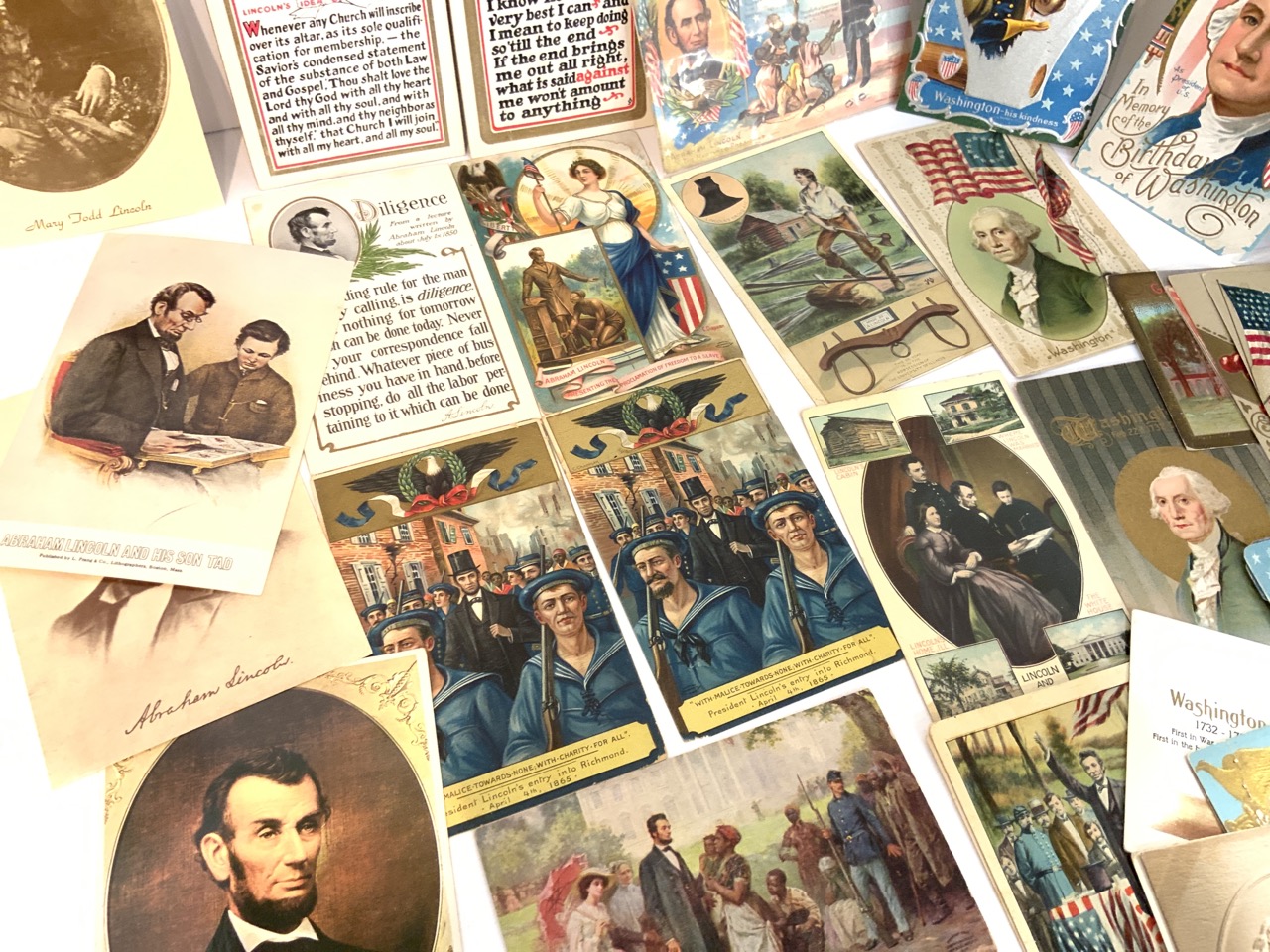 Collection of postcards pertaining to George Washington (33) and Abraham Lincoln (18).