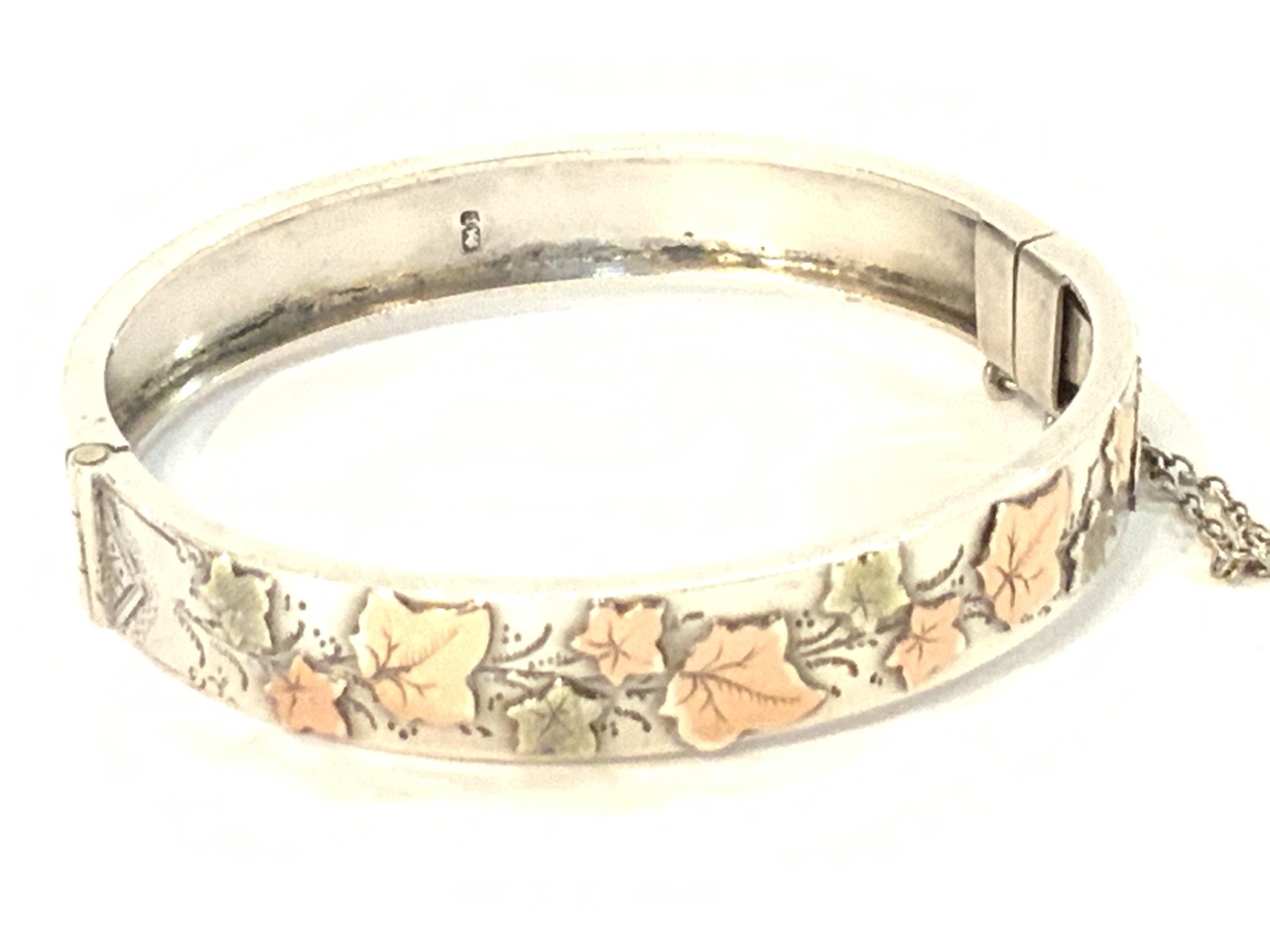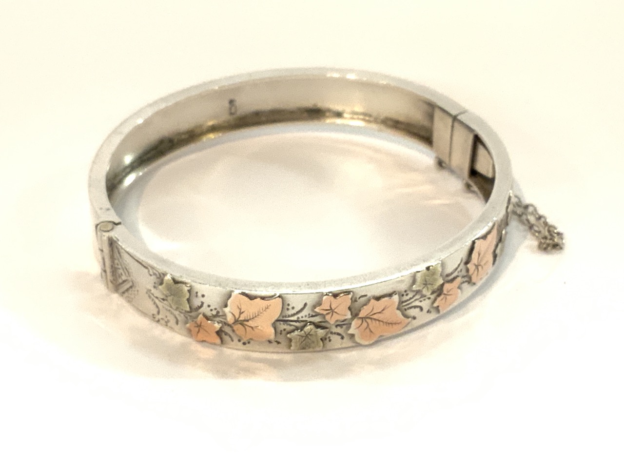 English, Birmingham sterling silver and gold hinged cuff bracelet. Early 20th century.