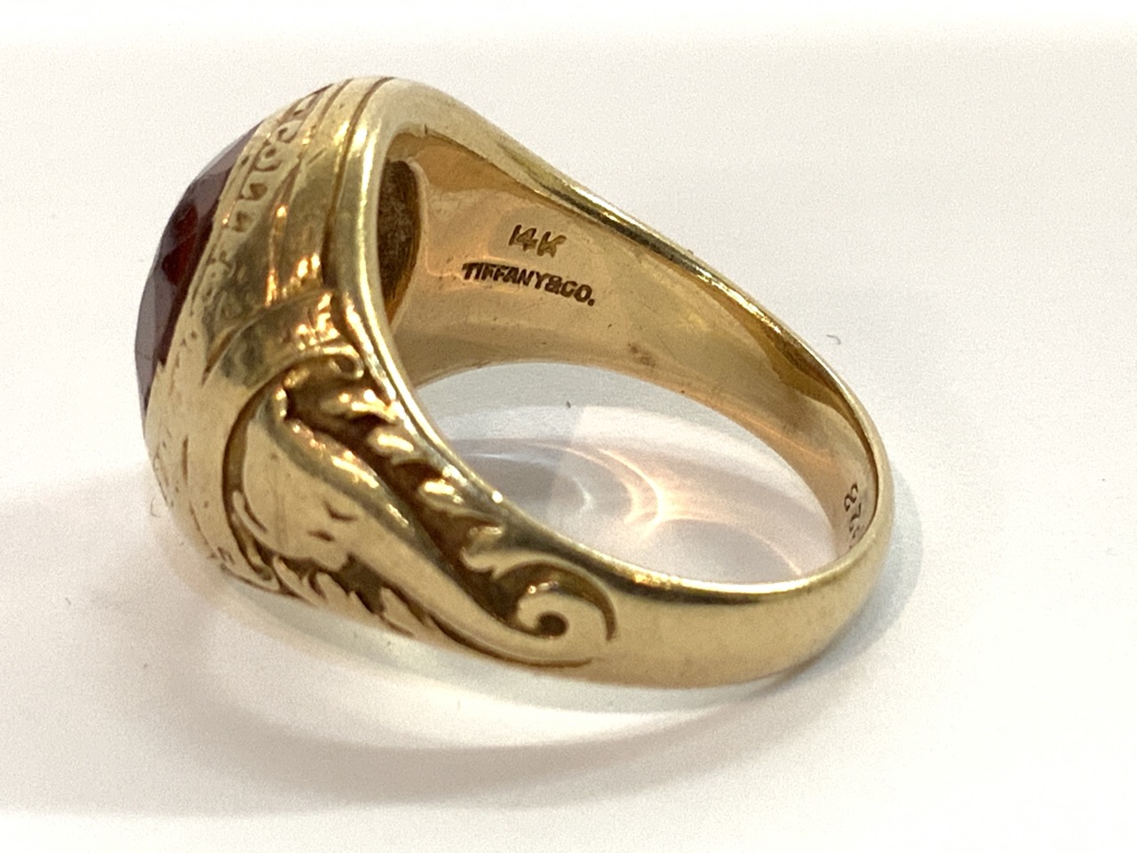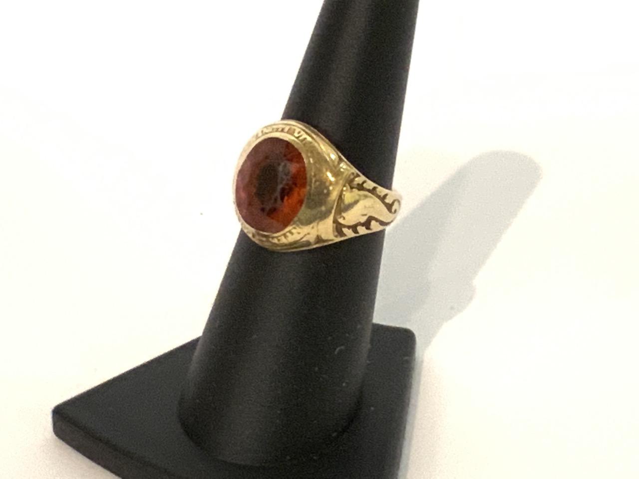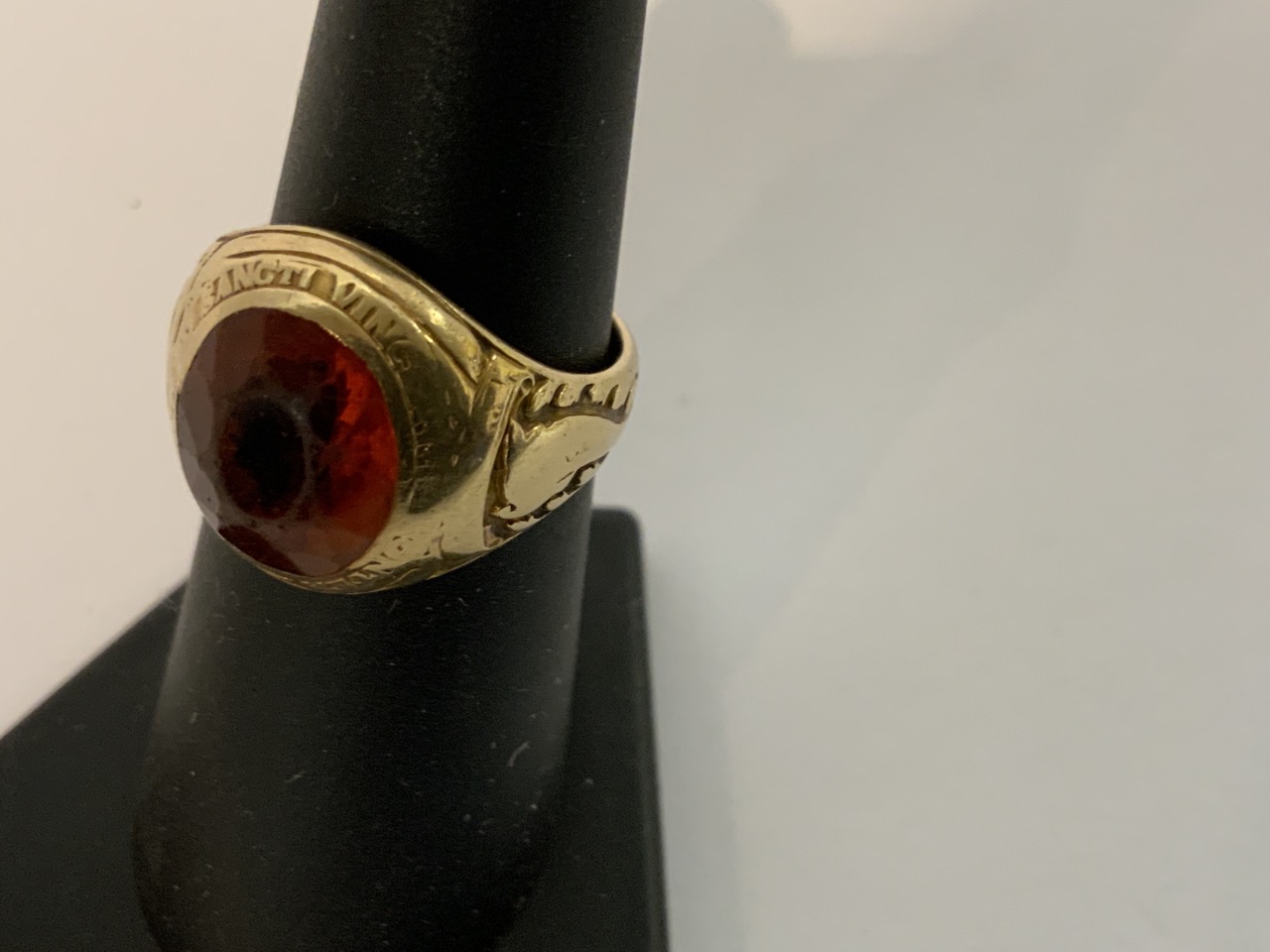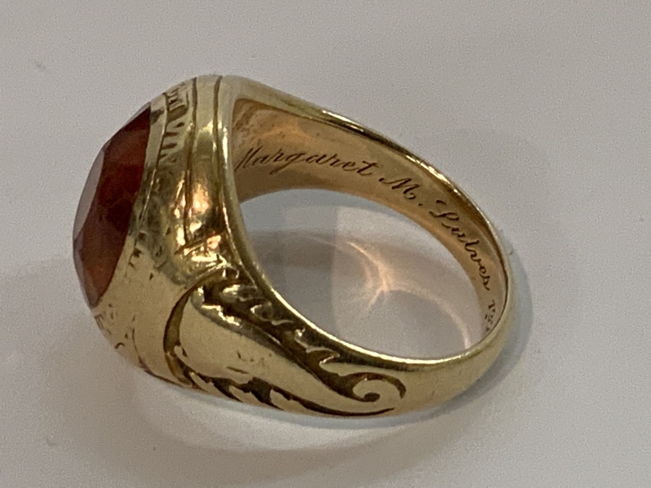 Tiffany & Co. class ring with orange sapphire. Stone is scratched and worn. Inscribed and dated 1928.