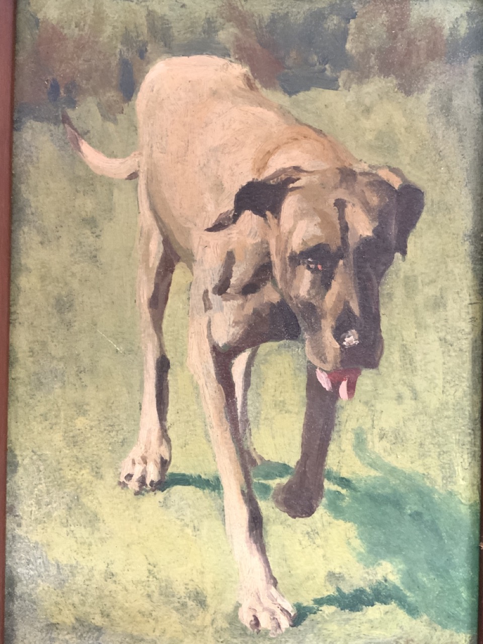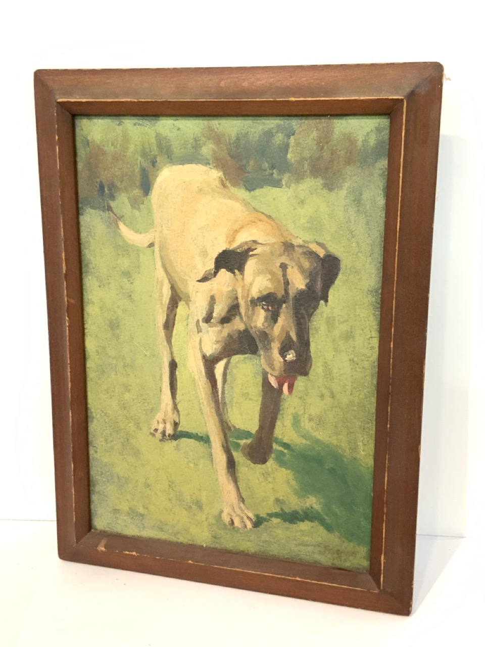 1958 Illegibly signed painting of Great Dane dog walking in the grass.