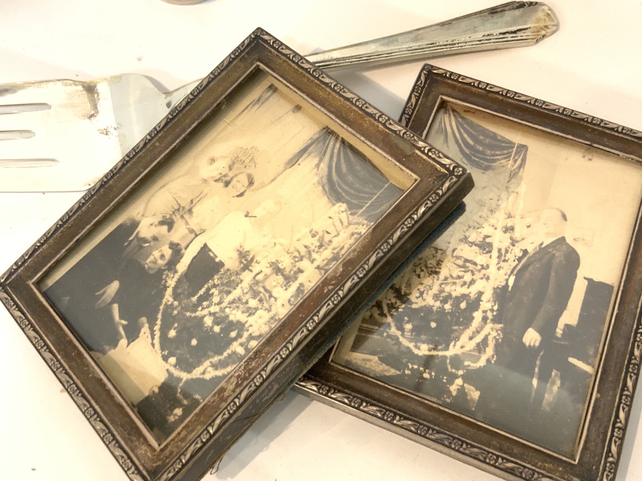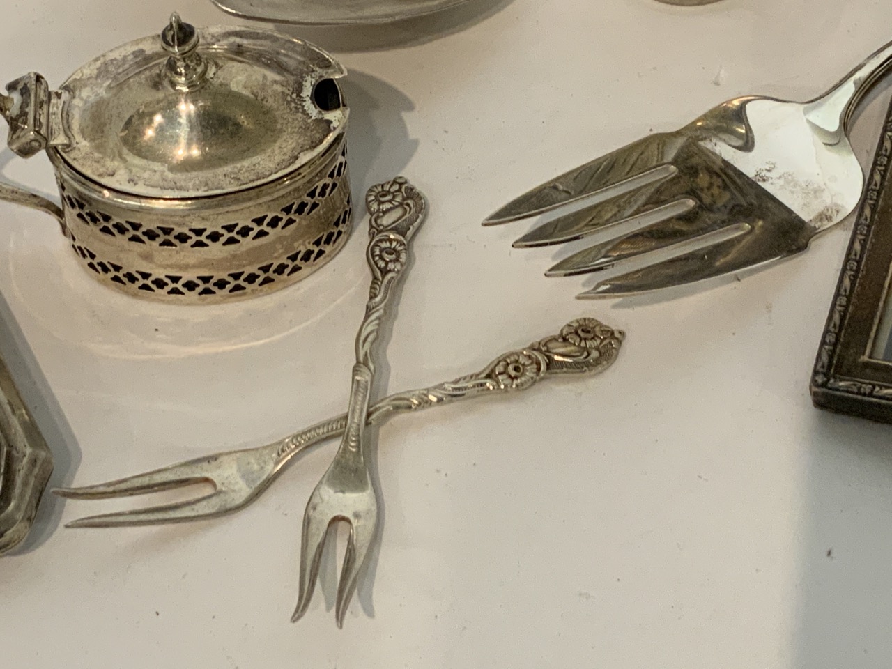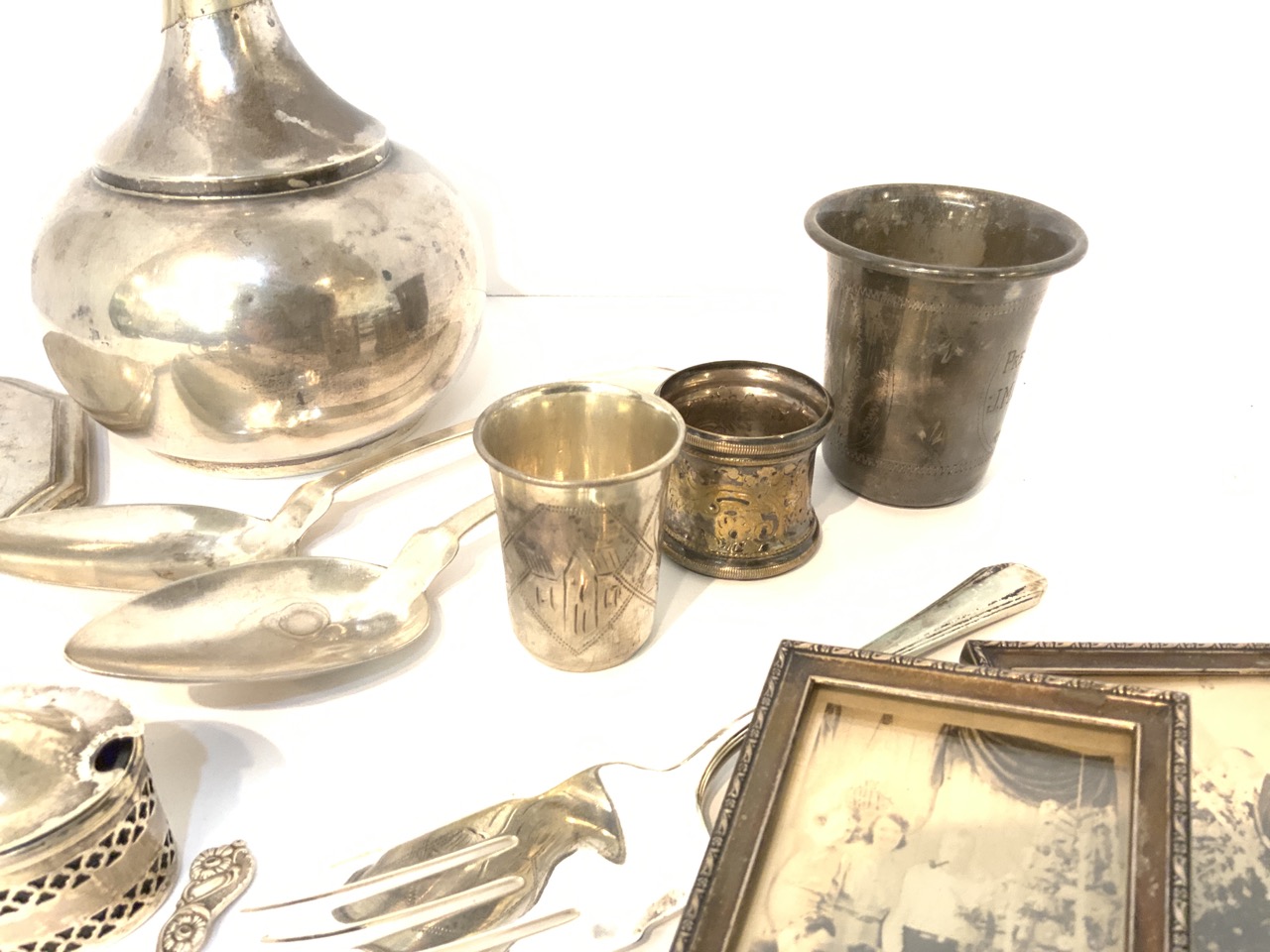 A compiled grouping of 800 and 925 sterling silver including dented decanter, (Harford) American coin silve spoons, frames, Judaica etc.