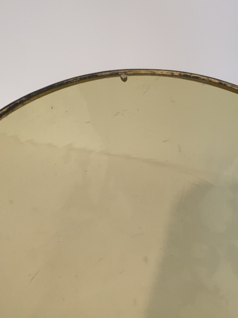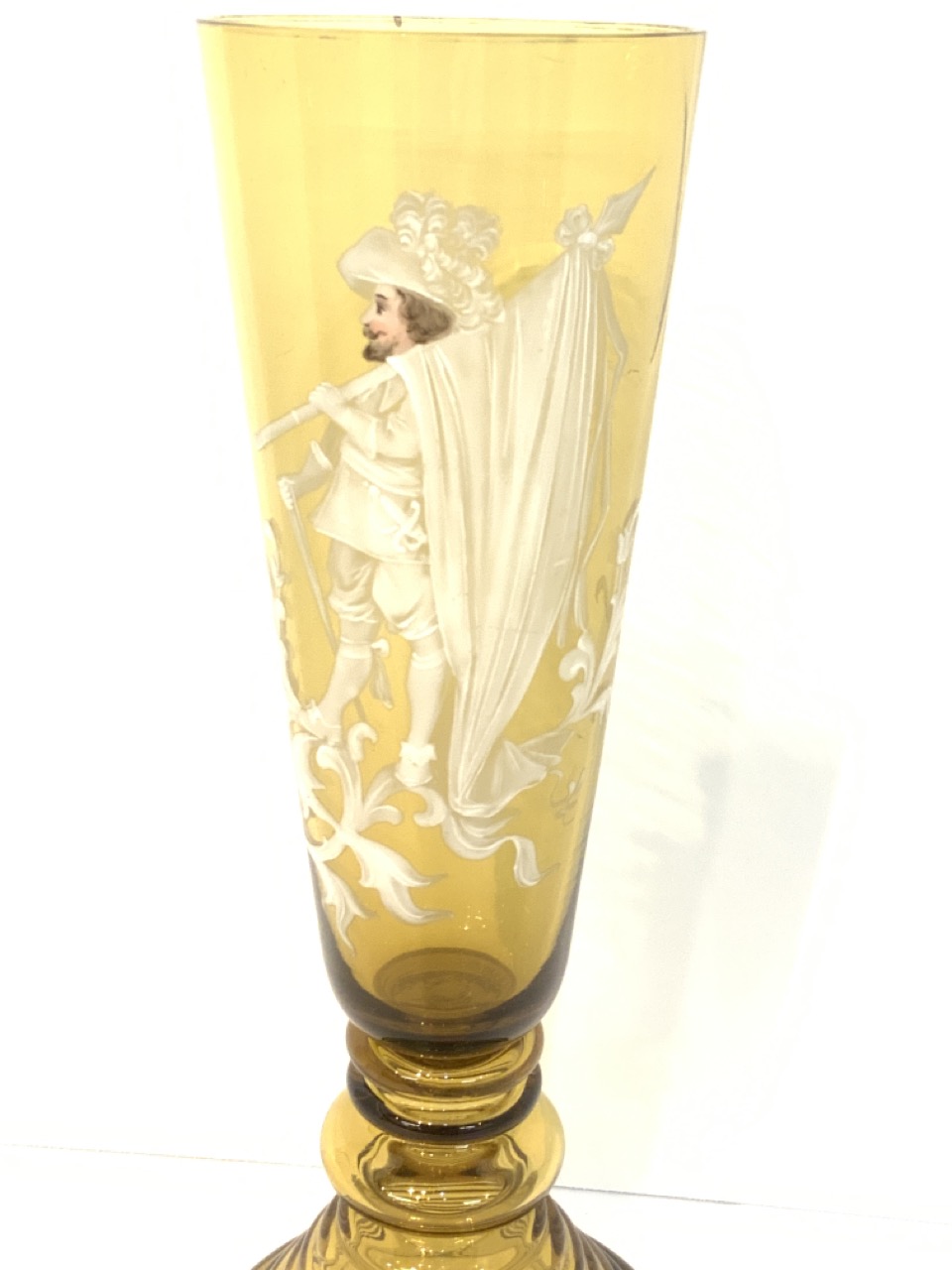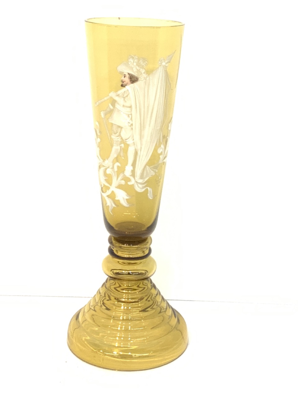 Tall amber Mary Gregory glass vase with musketeer. A small glass pop or chip along edge. Please see images.
