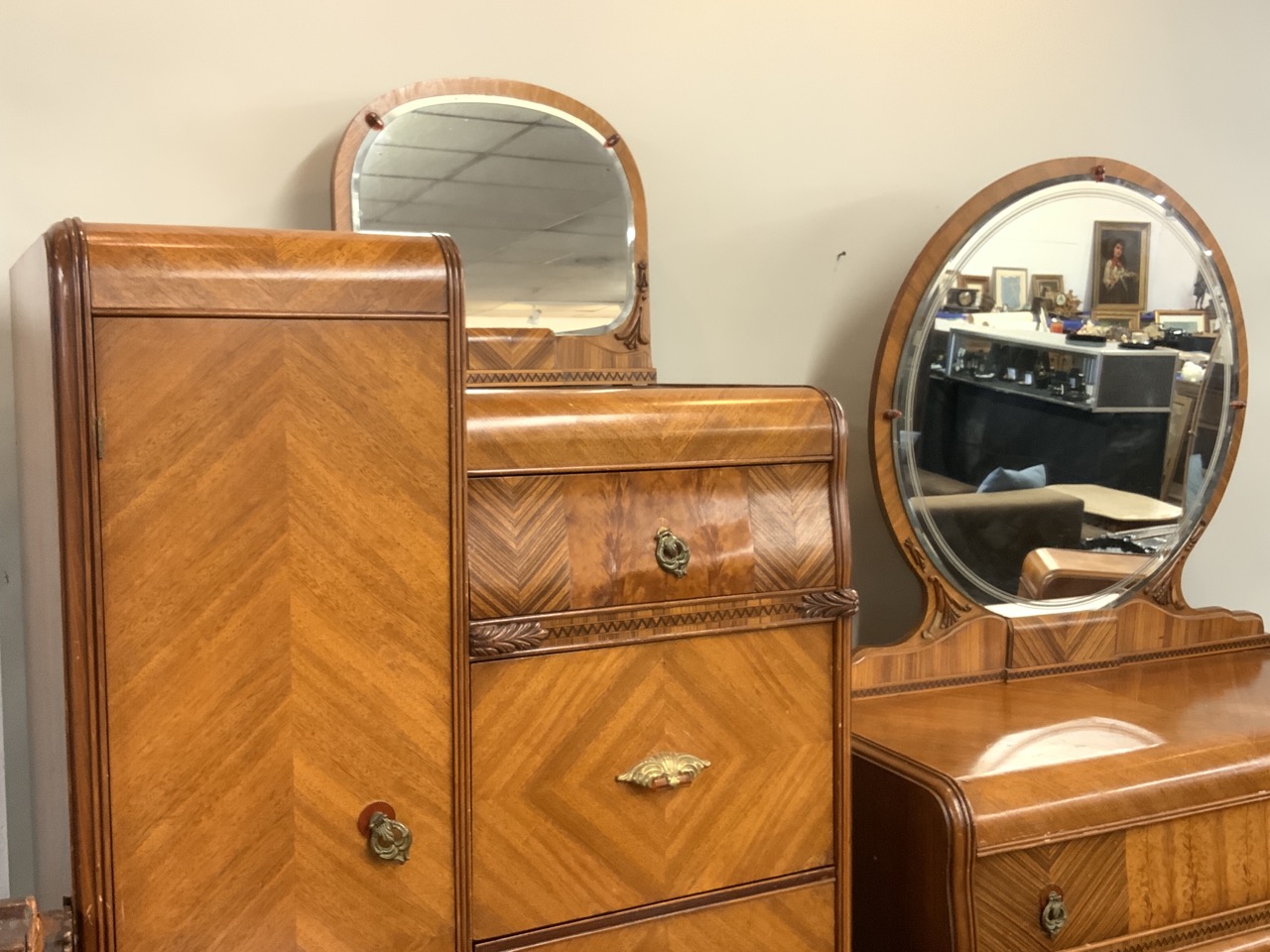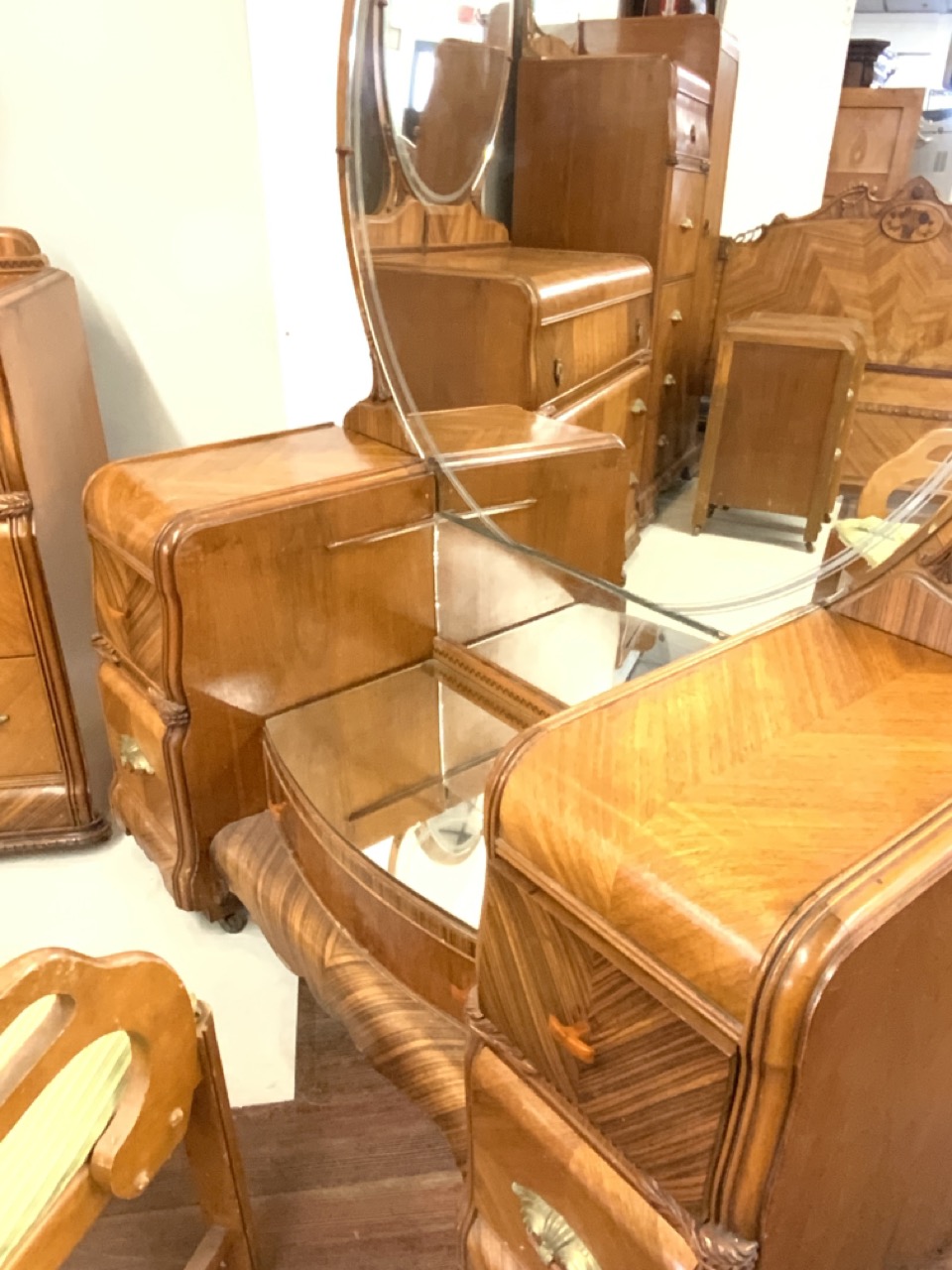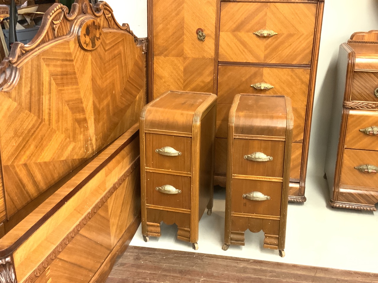 Art Deco Bedroom Set. Chifferobe, dresser with mirror, vanity and bench, nighstands and full size bed. Overall good condition with some loss. Please see photograph preview or call.