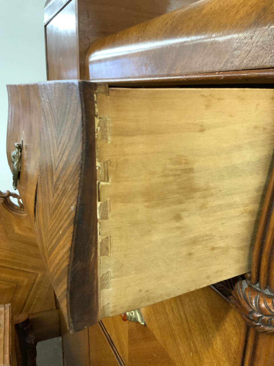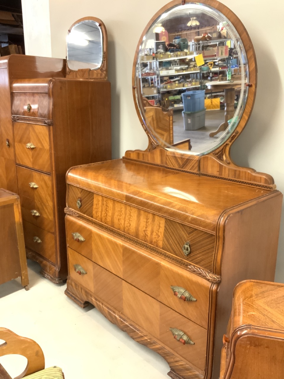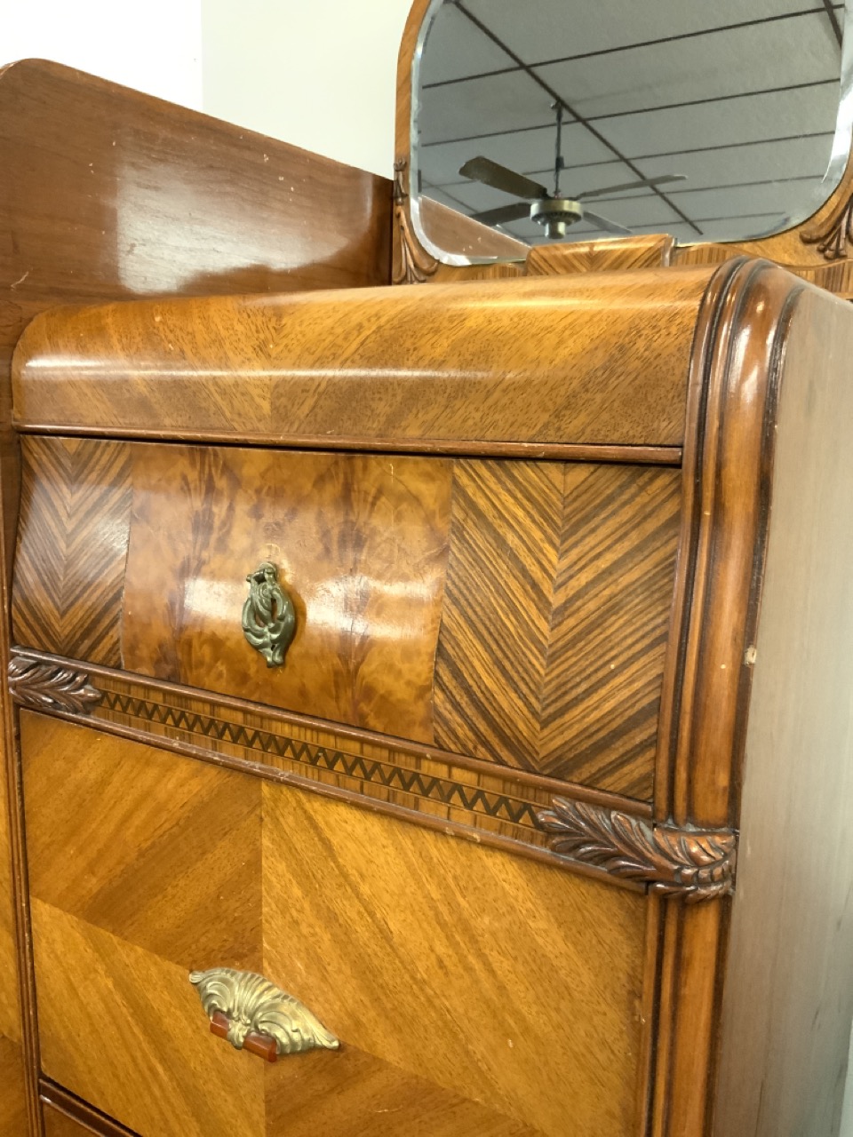 Art Deco Bedroom Set. Chifferobe, dresser with mirror, vanity and bench, nighstands and full size bed. Overall good condition with some loss. Please see photograph preview or call.
