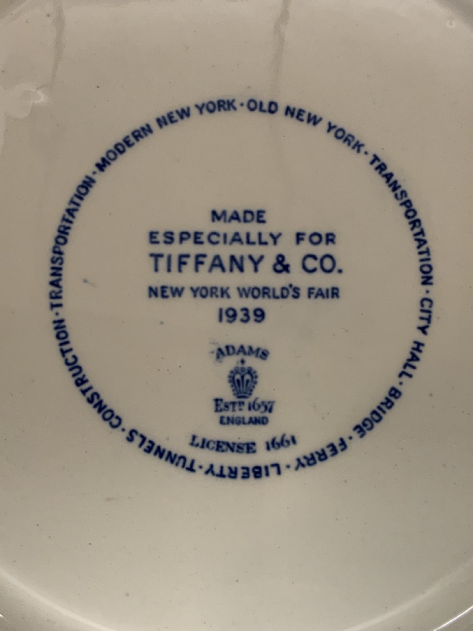 1939 New York World's Fair dinner size plate made for Tiffany & CO. by Adams England.