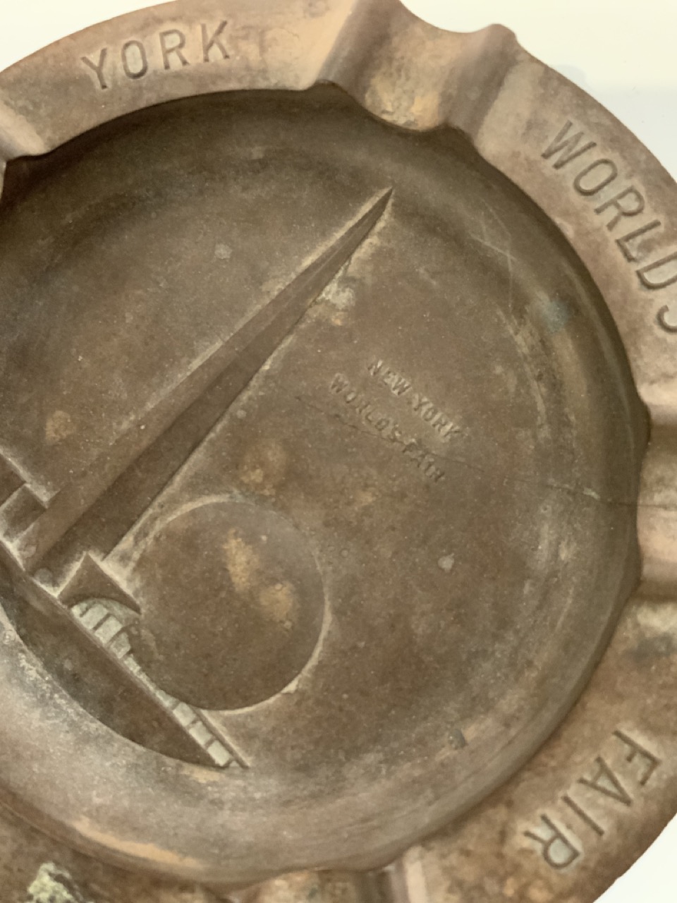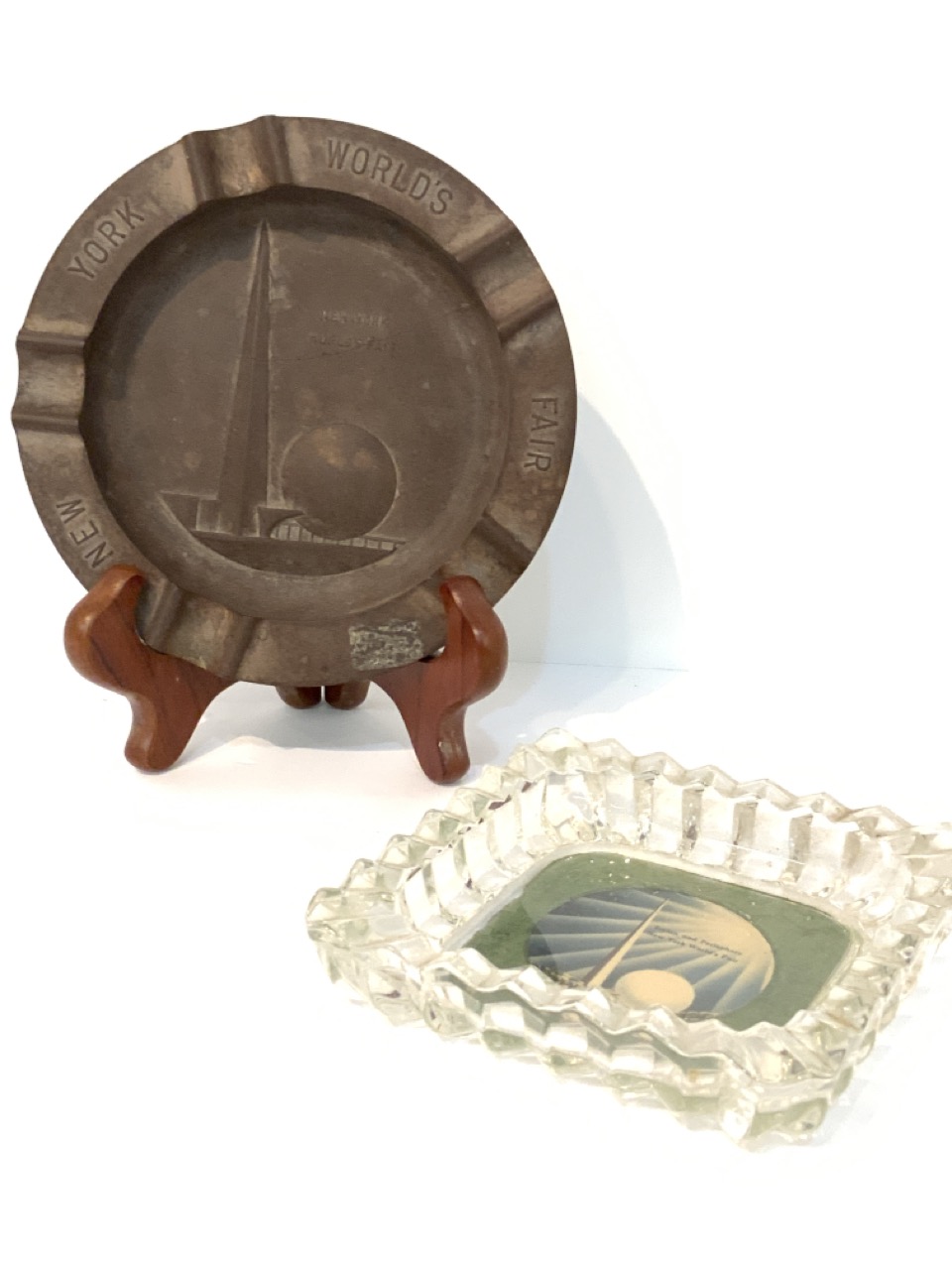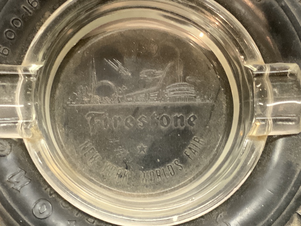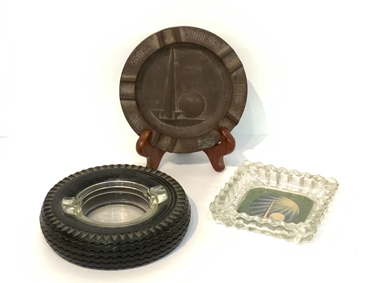 Three (3) 1939 New York World's Fair ashtrays. Bakelite, Firestone tires and glass tray with color print of Trylon and Perisphere.