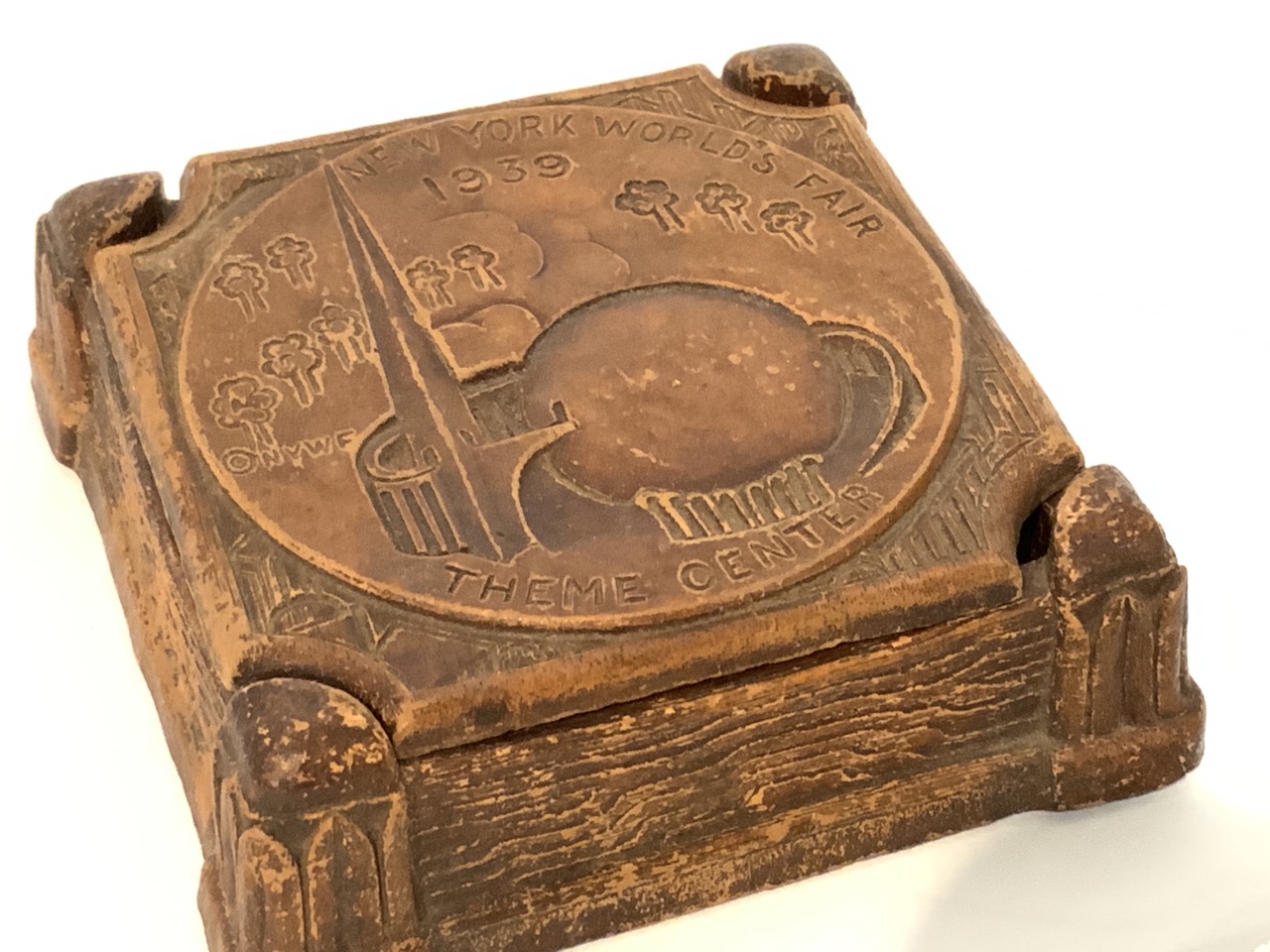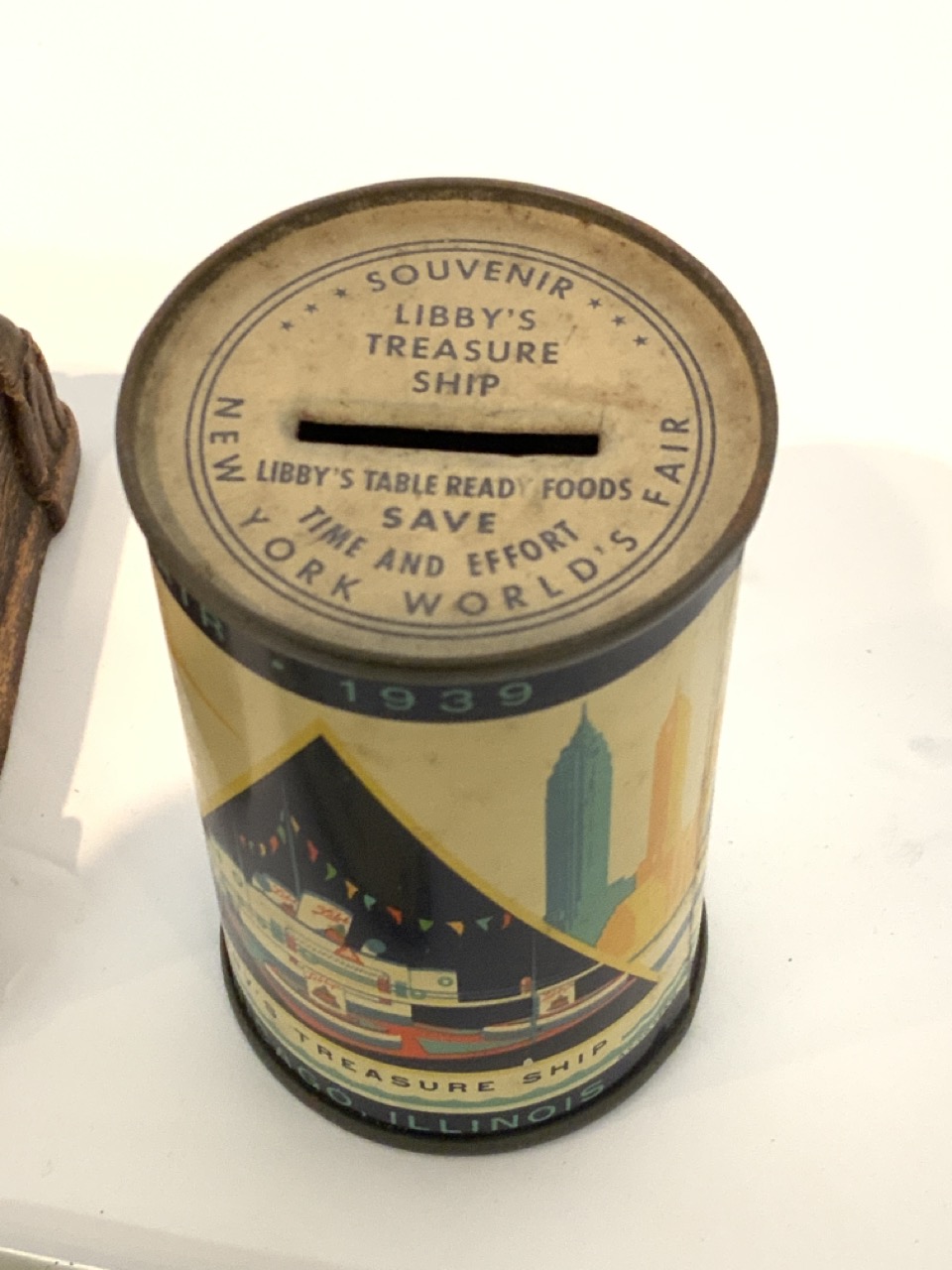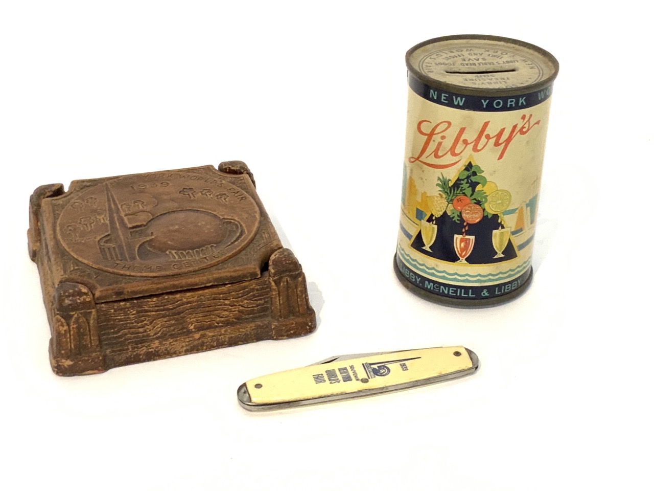 Three (3) 1939 New York World's Fair souvenir objects. A Syrocco wood style box, pocket knife and Libby's juice tin bank.