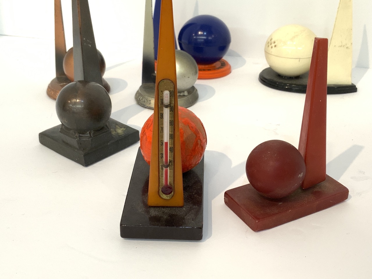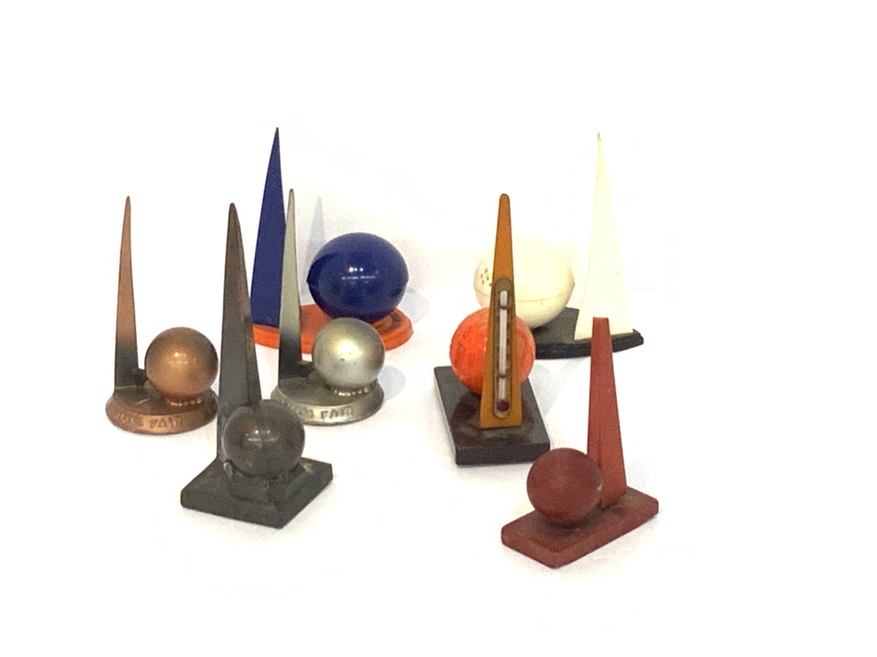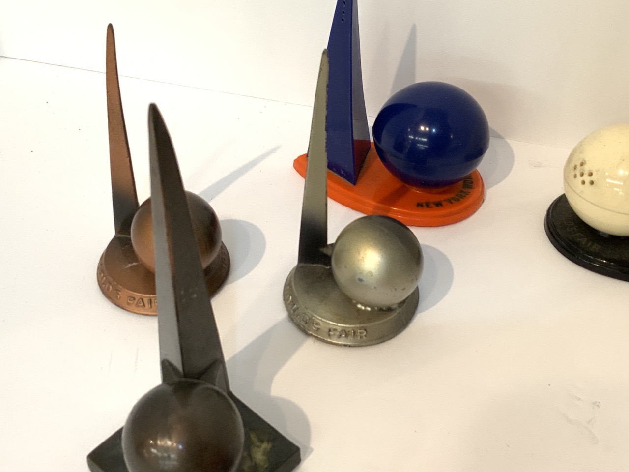 Seven (7) 1939 New York World's Fair Trylon and Perisphere sets. Bakelite, metal and plastic material.