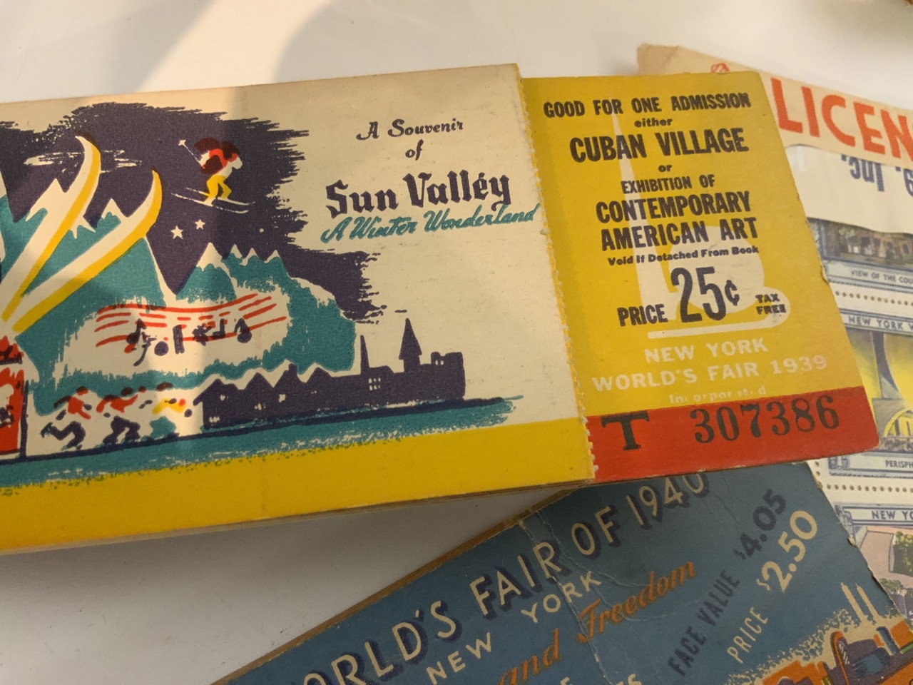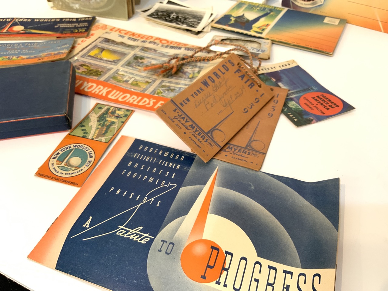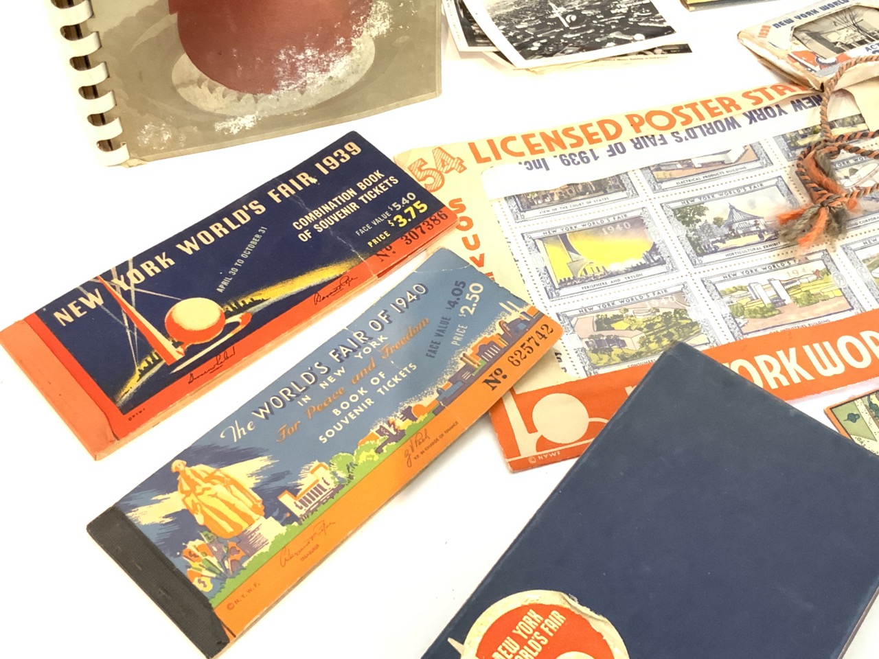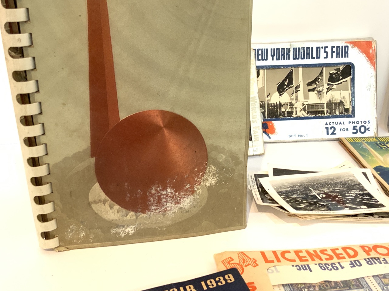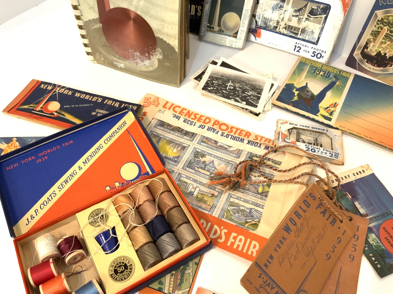 Collection of 1939 New York World's Fair paper ephemera including booklet, postcards, photographs, ticket books and sewing kit etc.