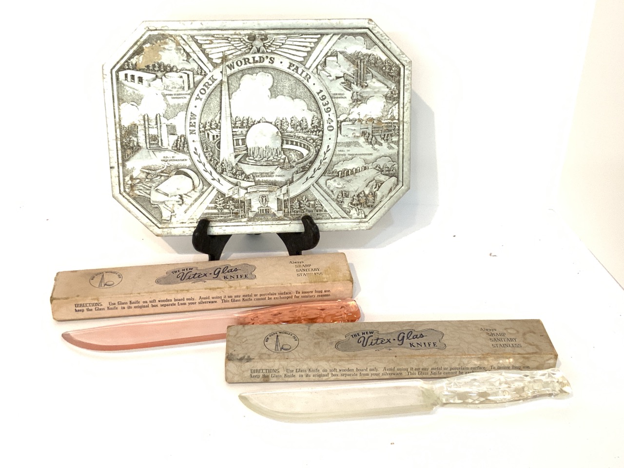 1939 New York World's Fair Vitex Glass serving knives and hot plate advertising pieces.