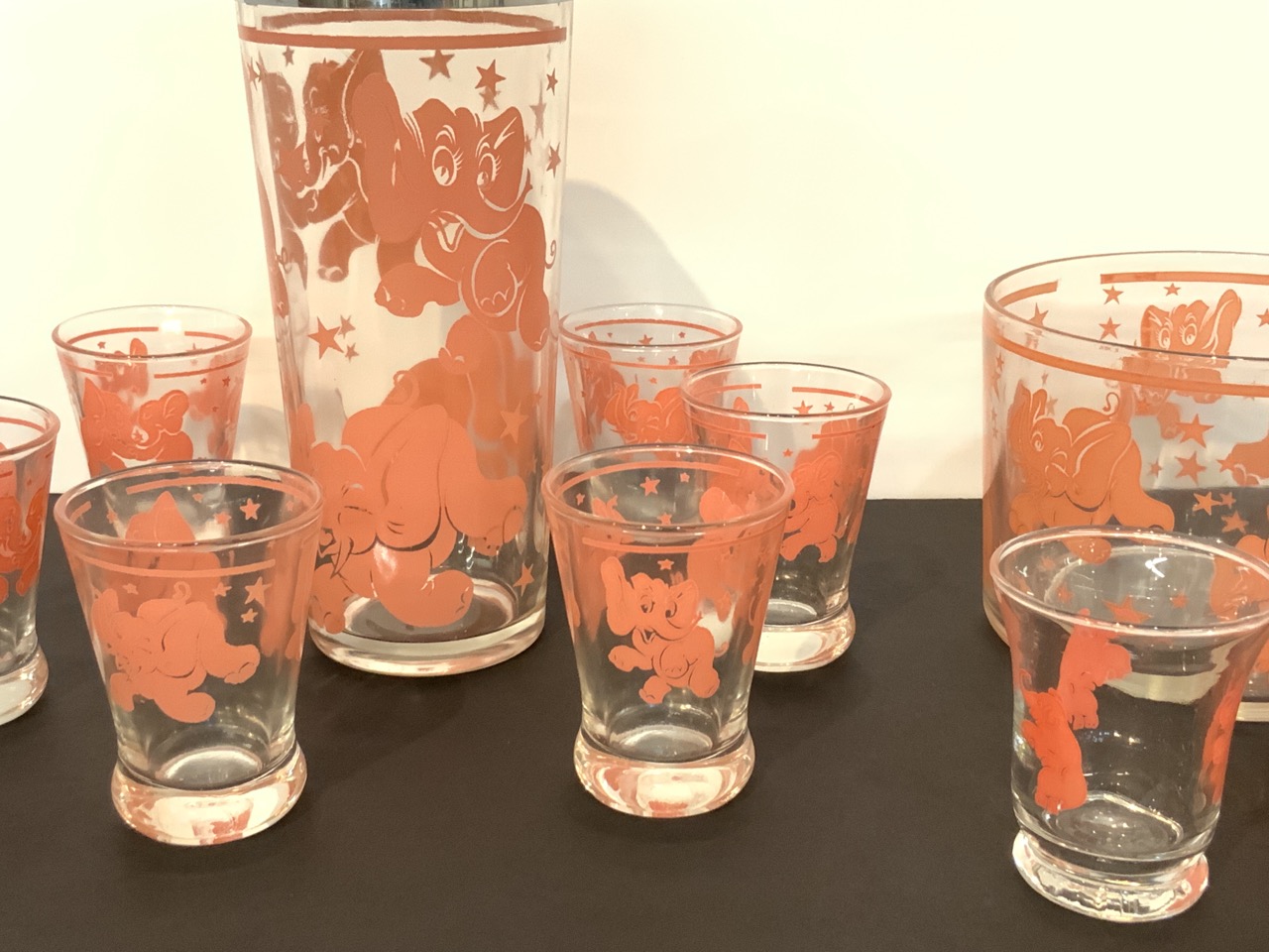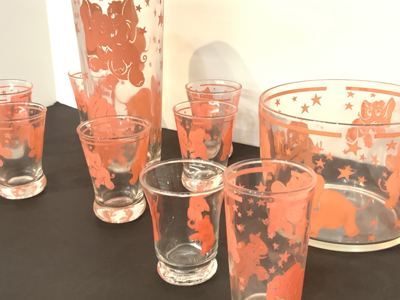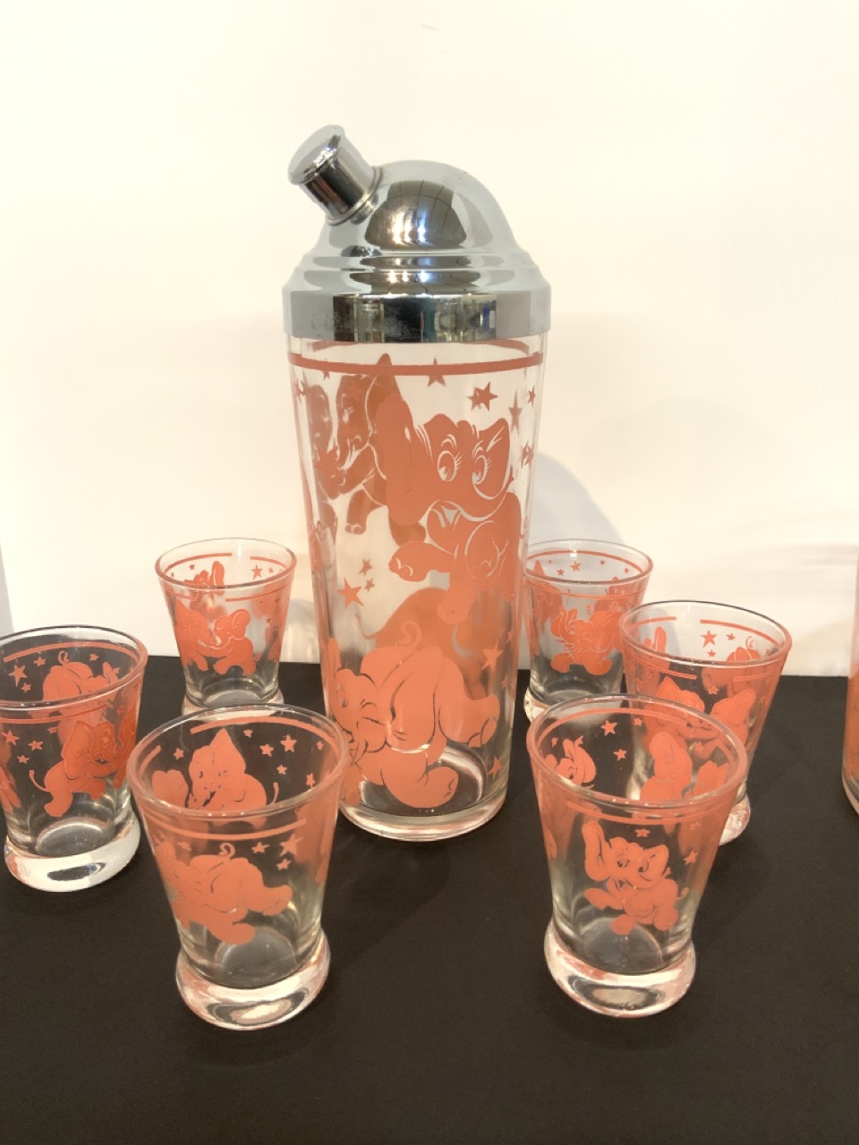 Art Deco pink elephant cocktail shaker set, ice bucket, six glass and two single glasses. A fun set with happy lucky pink elephants.