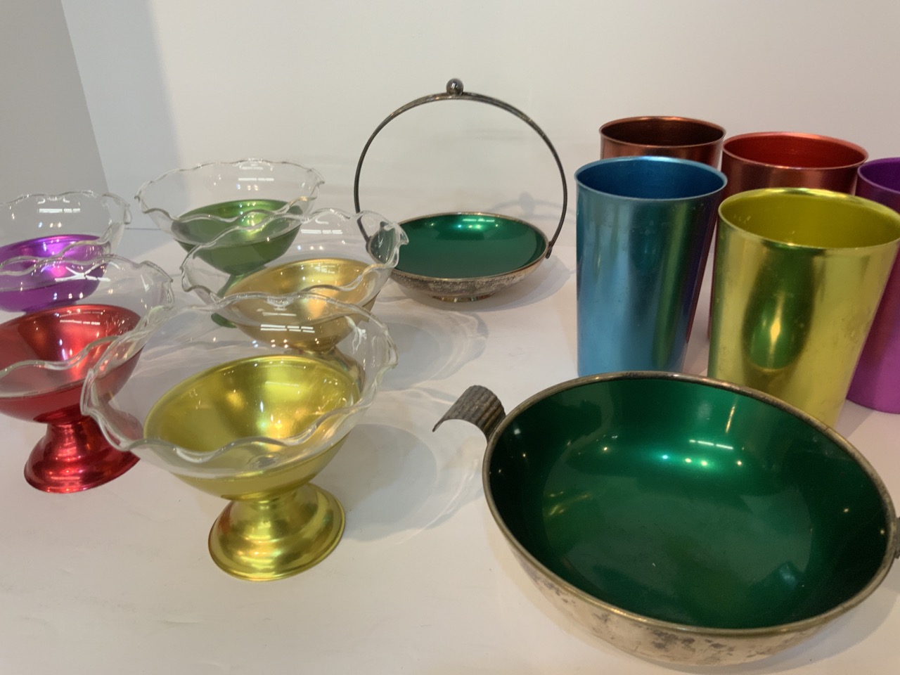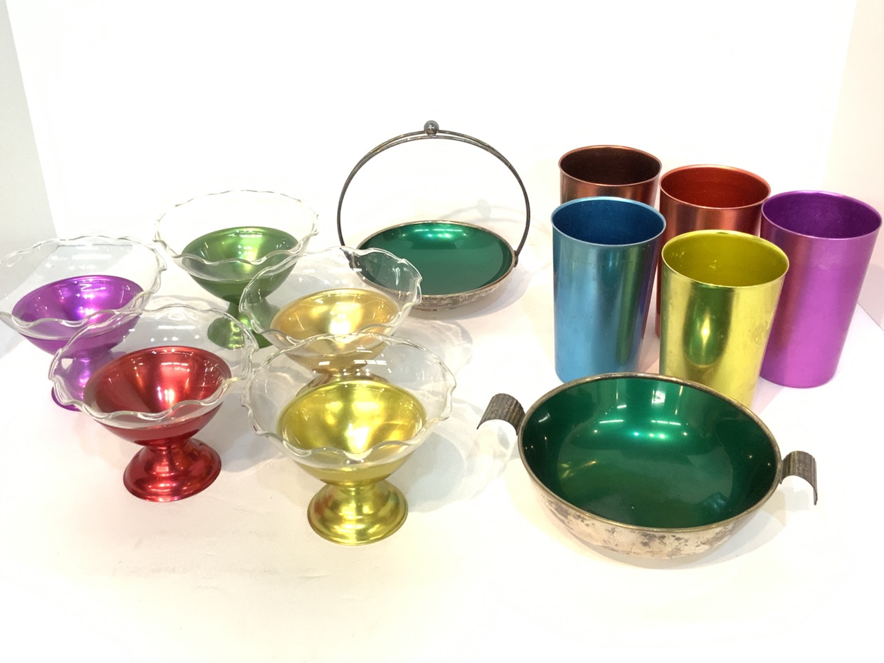 A compiled grouping of colored aluminum drinking glasses, sherberts and serving dishes.