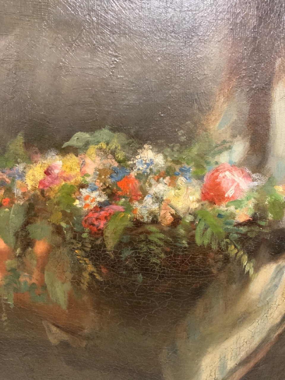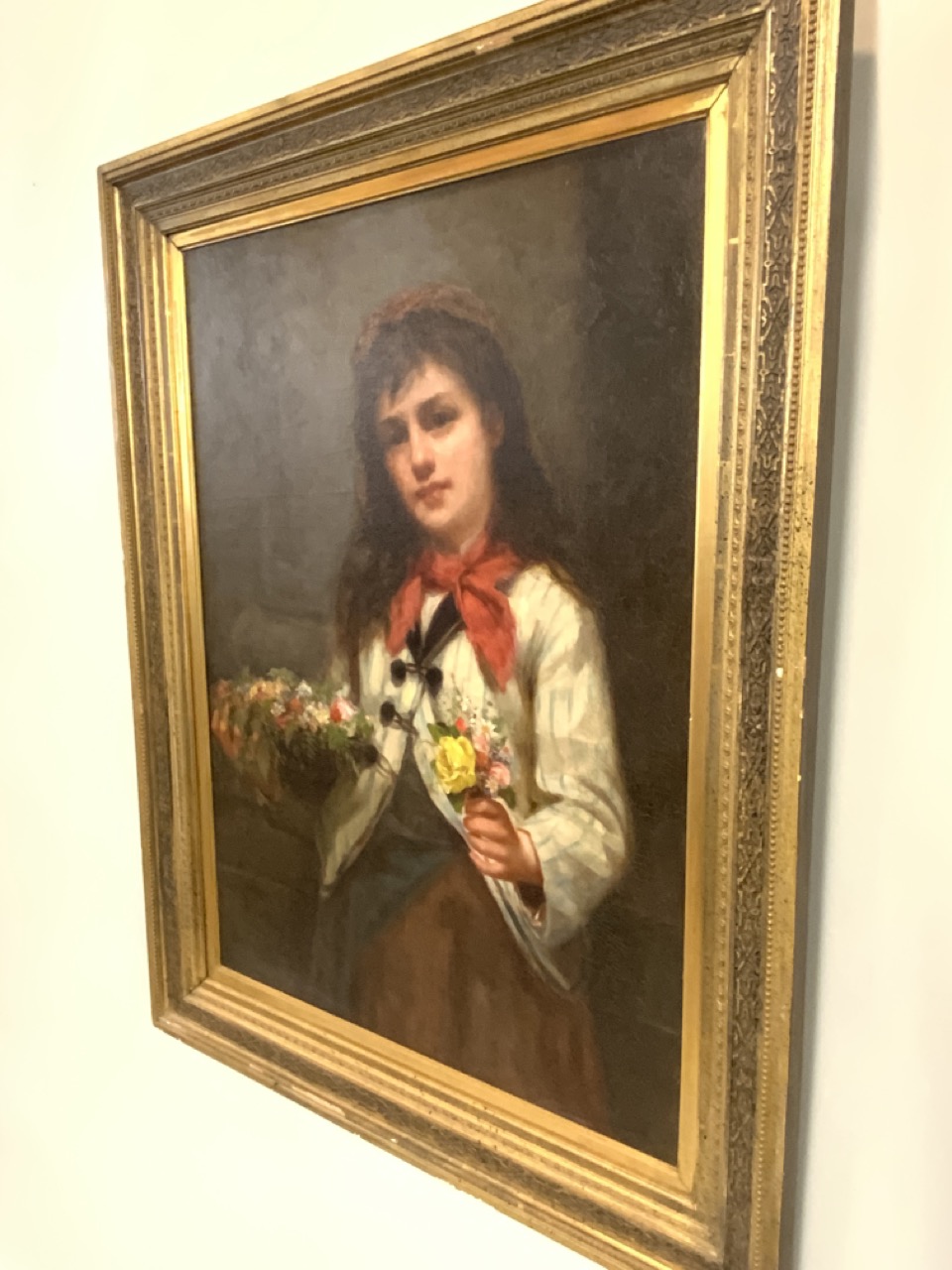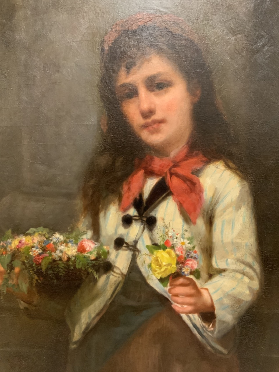 Untitled: Portrait of girl gathering flowers with basket of flowers wearing a blue And white striped jacket.