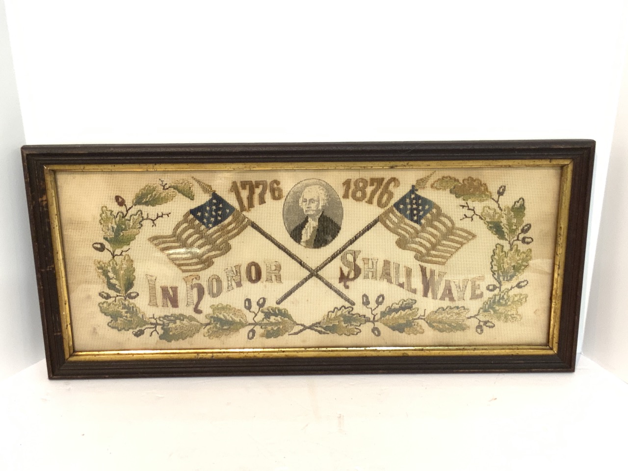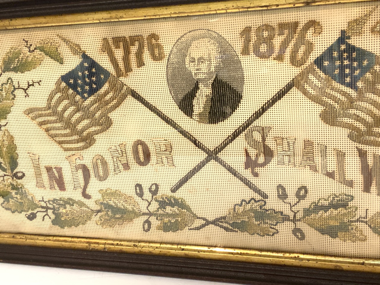 1776-1876 "In Honor Shall Wave" Centennial needlework framed with President George Washington