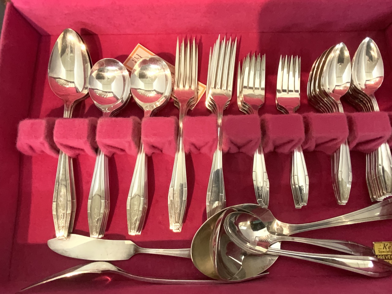 Art Deco Design stainless flatware by Simeon and George H. Rogers Company. Service for eight with serving pieces. Very fine condition.