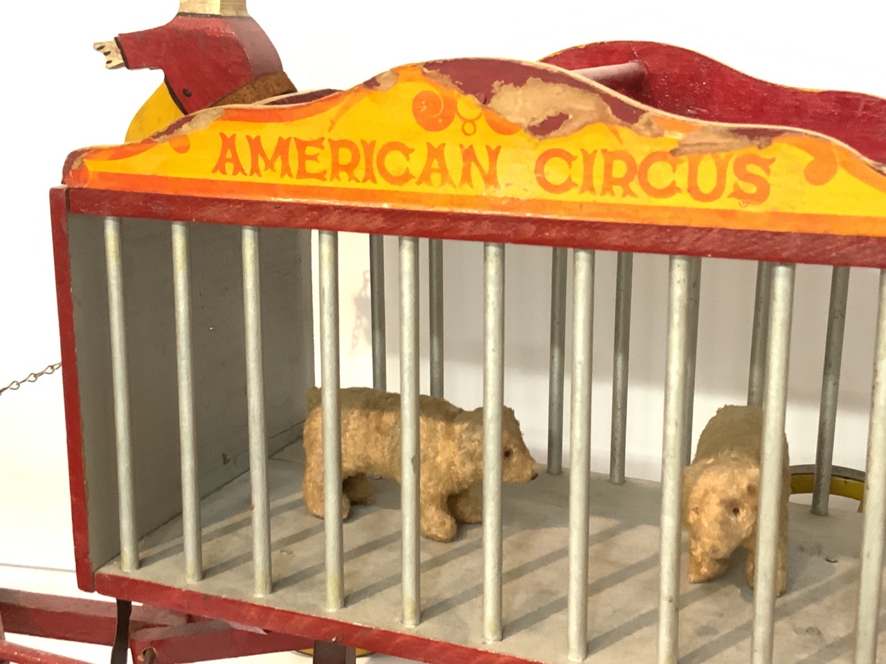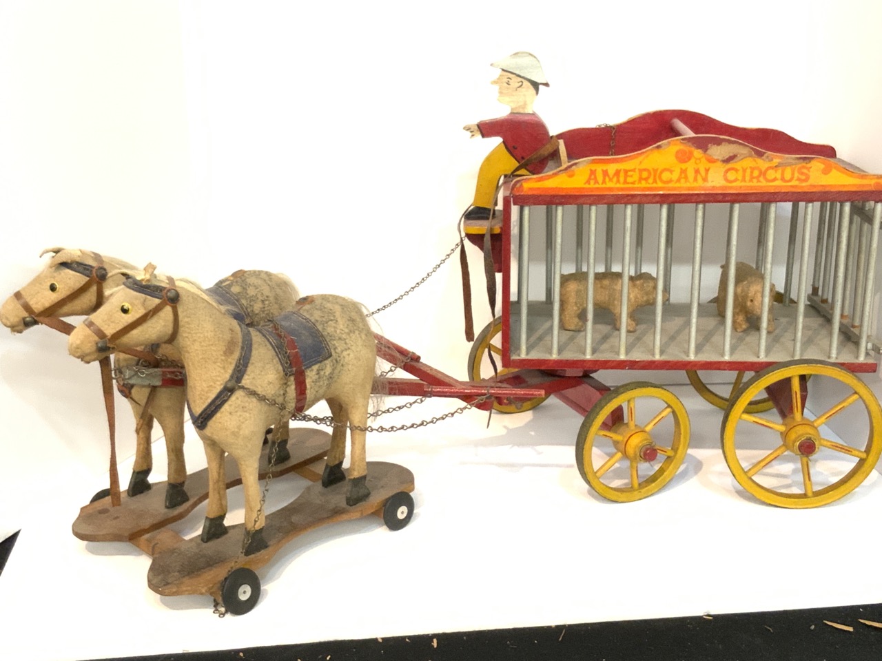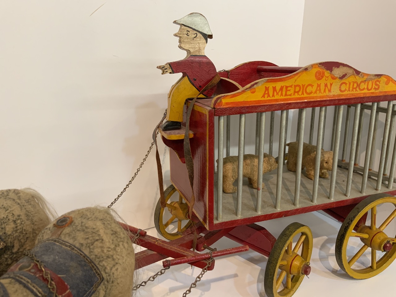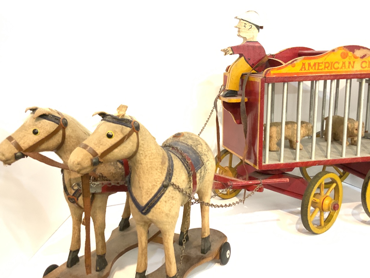 American folk art horse drawn circus wagon toy with cage with bears.